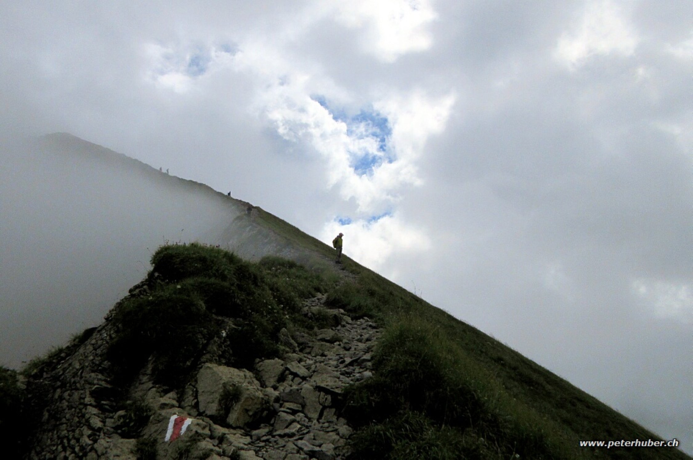 Trocken, oft in Wolken, gegen Mittag kam die Sonne zeitweise durch. Auf dem Gipfel windig und kühl. Die Wege waren recht feucht und etwas rutschig. Dank guter Markierungen und zahlreichen Wegweisern auch bei Nebel gut zu finden.