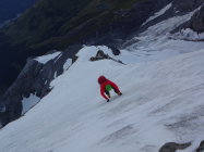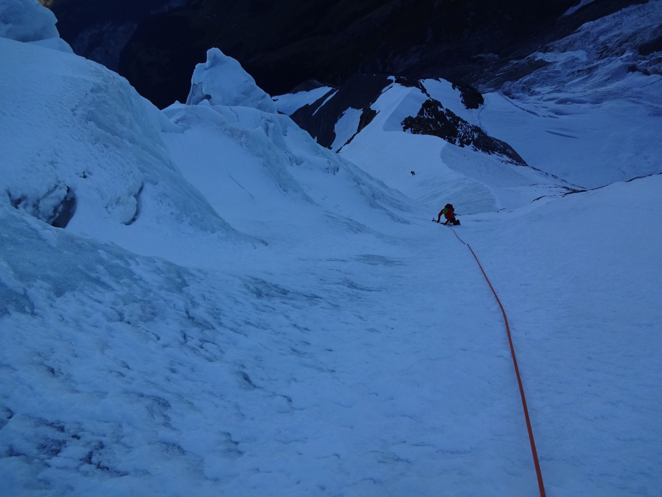 Gute, griffige Verhältnisse im Eis, sehr gute im Fels. Zustieg zur Hütte und bis unter das Nolleneisfeld alles trocken. Eisfeld bis zum kleinen Felsen unter dem Nollen hart aber gut begehbar , dann sehr hart und blank. Haben von hier aus drei 40m Seillängen gesichert. Zwei Längen links am Nollen hoch und dann rechts raus darüber.