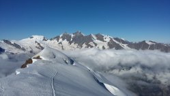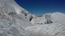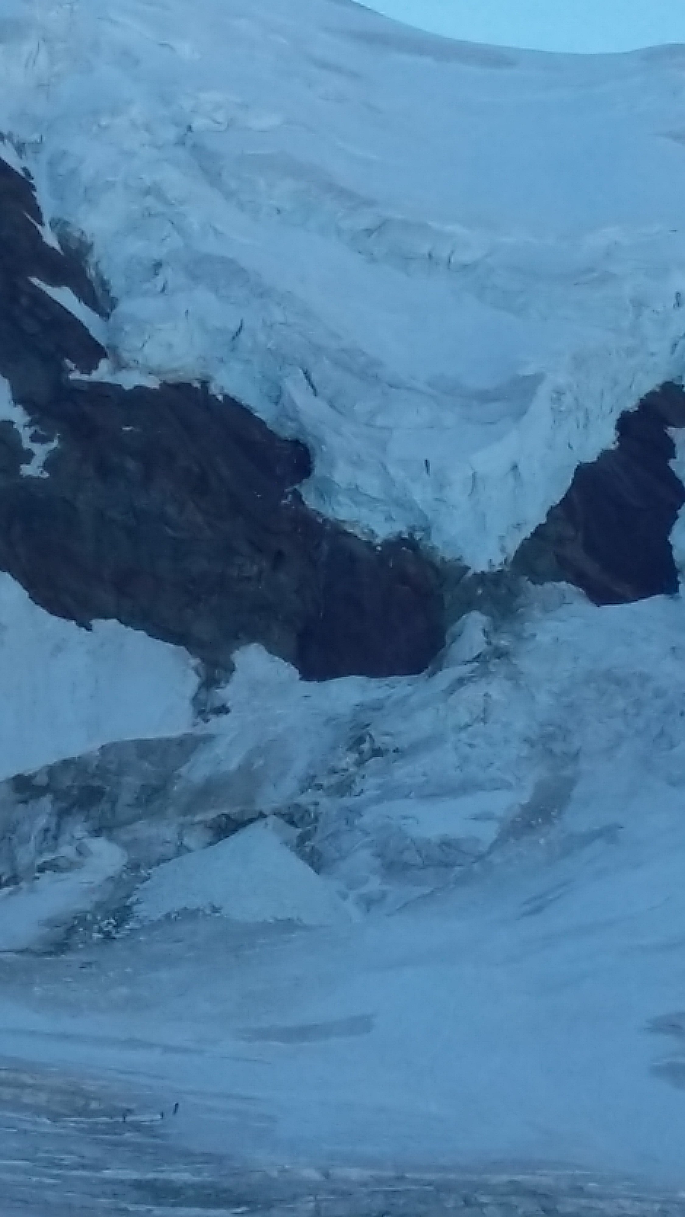 Der Schnee ist bis Mittag hart und griffig, bis auf 3900m gab es nur zwei Blankeisstellen. In der Spur ist in der Mitte des unteren Gletscherblatts eine Spalte aufgerissen, die nicht mehr übersprungen werden kann, ist aber leicht zu umgehen. Trotzdem Vorsicht,- es gibt hier ein paar verborgene Spalten, die noch größtenteils von Schnee bedeckt sind. Am 20.08.16 haben wir einen größeren Eisbruch beobachtet im Abbruch der Westflanke, die Normalspur scheint mir sehr steil, gemessen an älteren Einträgen und Fotos. Die Schneebrücke, die unterhalb der Eiswand in der Nordflanke bis vor einer Woche gangbar war, ist es nun nicht mehr, kann leicht umgangen werden, der Bereich scheint mir aber "nicht ohne". Zwischen dem Westgipfel und dem Hauptgipfel wurde der Wind sehr stark und böig, was wohl für gestandene Männer kein Problem war, uns (Mutter und Sohn zusammen 80kg) war es zu riskant, so daß wir nach einem Drittel der Gipfelwächte umkehrten. Die Entscheidung war für uns rund und stimmig, denn die Tour war bis da auch ohne Gipfel super. Unterhalb des Westgipfels wurden wir leider Zeugen eines Absturzes und der anschliessenden Bergung.