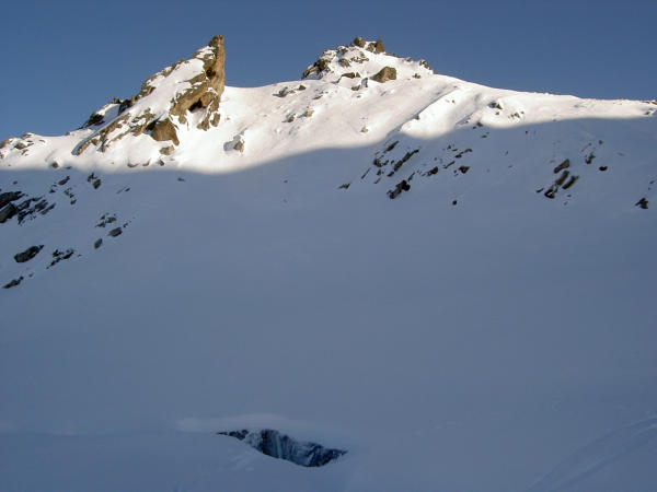 Gut gesetzte pulvrige Verhältnisse, die nachmittags zäh werden können. N-, NE- und NW-Hänge mit mehreren spontanen und z.T. grösseren Lawinenniedergängen angetroffen, welche am vergangenen Samstag abgegangen sein dürften. Anrisse meist in Muldenlagen. Während der heutigen Tour keine Anzeichen von Lawinengefahr angetroffen. Die Gletscherspalten am Jörigletscher sind nicht zu unterschätzen. Lagen sie vor einer Woche noch offen, sind sie nun gut getarnt, leicht überdeckt. Die Neuschneemenge auf dem Jörigletscher liegt bei durchschnittlich 30 cm. Der Wind hat den Schnee leicht gepresst, ist jedoch noch gut fahrbar (Fotos). Anstelle des Gipfels (siehe Bericht vom 2.11.03) empfehlen wir euch, auf dem Heimweg andere Gipfel einzusammeln, die ganz mit Skiern machbar sind.