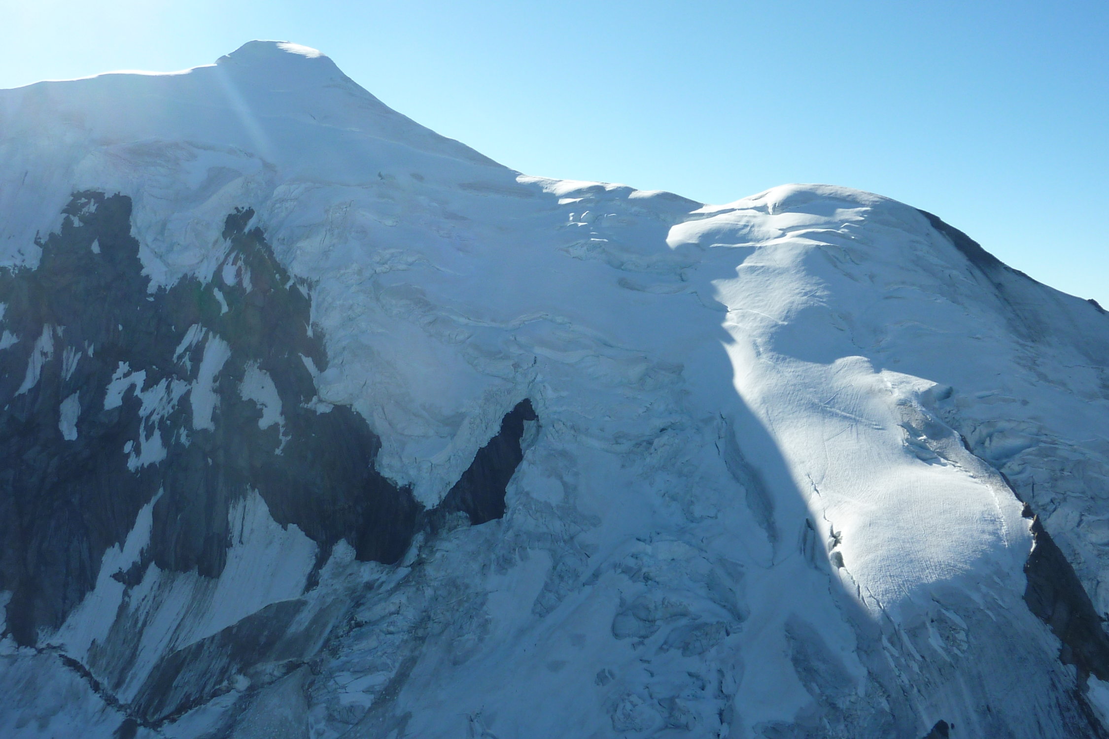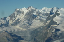 Perfekte Bedingungen am Weissmies-Südgrat, die Schneefelder auf der Südseite werden kleiner, was bei diesen auch heute sehr hohen Temperaturen nicht erstaunt. T-Shirt-Wetter,allenfalls eine leichte Jacke genügt. Ca. 30 Personen auf der Route, alles verteilt sich bestens. Die Almagellerhütte einmal mehr mit Top-Service, Morgenessen um 5 Uhr, dürfte auch eine gute halbe Stunde früher sein bei diesen metereologischen Verhältnissen. Die Nordwest-Flanke (s. Bild aus der Luft) sieht unglaublich zerklüftet aus, soll aber mit teilweise Umgehungen von Spalten und schlechten Brücken recht gut machbar sein.