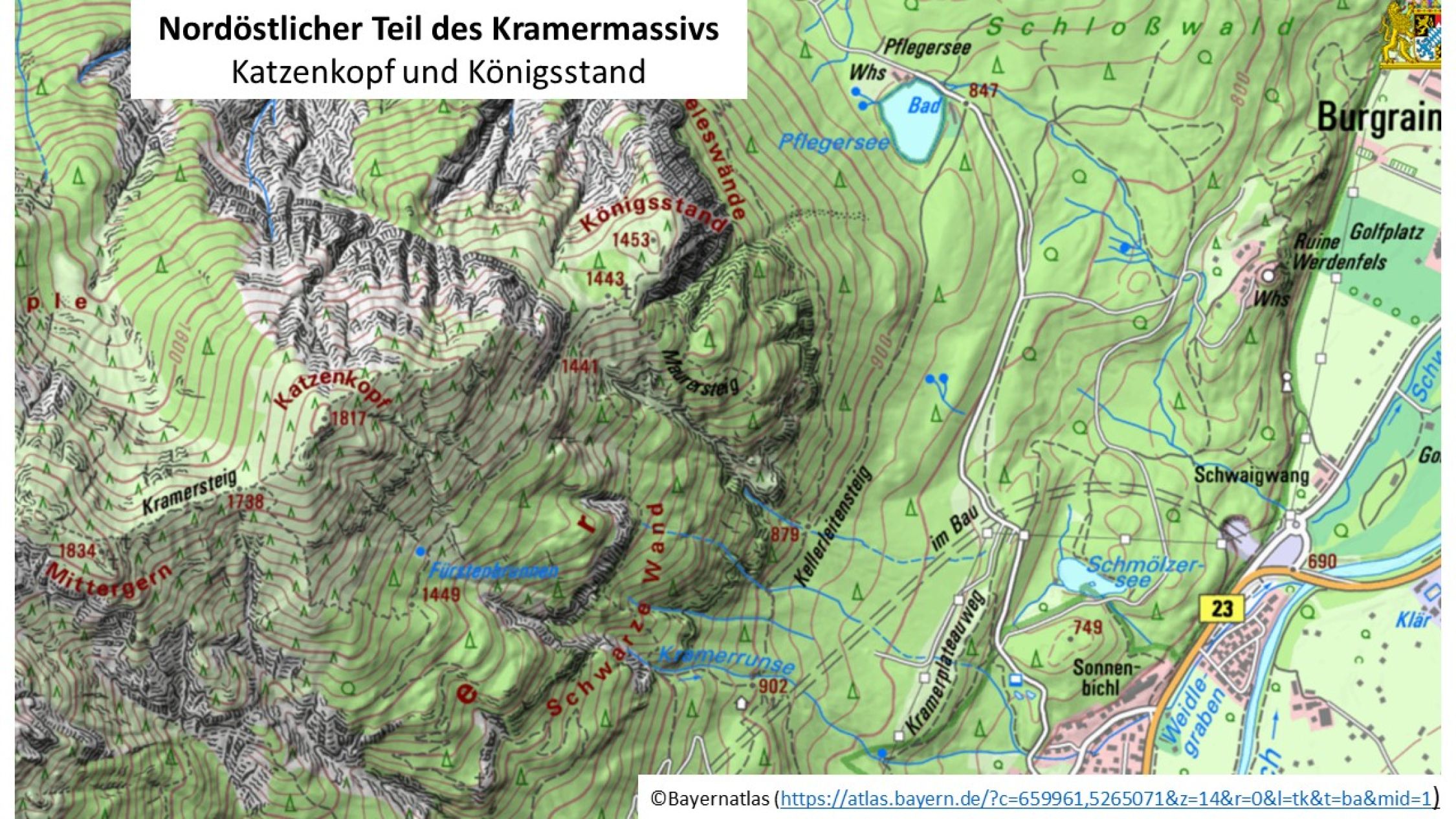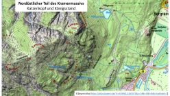 Der Kramersteig war im Bereich der ansteigenden Querung der Nordflanke (westlich vom 1834 m und östlich vom P. 1859 m) sowie auf den letzten 20 Höhenmetern in der N-Seite unterm Gipfel ziemlich vereist (eisige Spuren in dem wenigen Neuschnee). Insbesondere bei einer Überschreitung in West-Ost-Richtung mit Begehung dieser Passagen im Abstieg scheint dies ohne additive Ausrüstung eher heikel. Grödel oder Snowline o. ä. wären hilfreich.