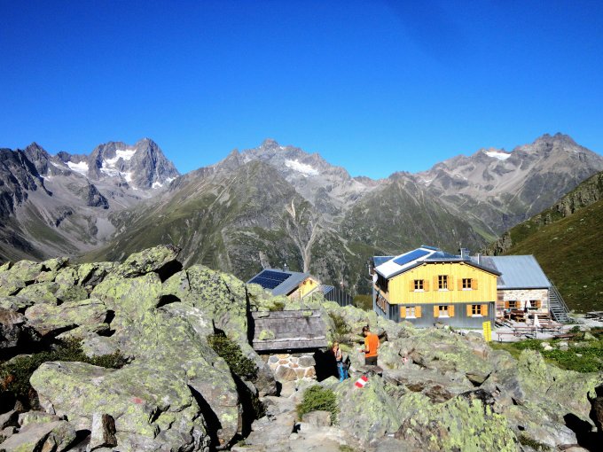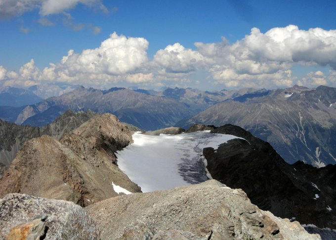 Der Abstieg über den Normalweg durch die Südflanke beginnt am Rand des Gletscherkessels, ist zu Beginn jedoch sehr steil, schuttig und steinschlaggefährdet. Wir sind daher bis zum Beginn der Drahtseile über den Westgrat zurückgestiegen und von hier über eine kettengesicherte Querung zum Normalweg gelangt, der dann über leichte Felsen und Geröll in die Talmulde führt.
