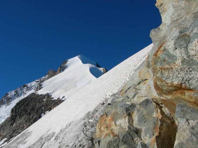Der Biancograt hat perfekter Trittschnee. Auch weiter am Grat zwisschen Piz Alv und Bernina sehr schoene Kletterei, Spallagrat problemlos. Achtung auf dem Fuorcla Crast'Aguezza. Ich bin ganz unerwartet in eine Spalte gesturzt. Weil das Seil gut gespannt war konnte ich einfach raus klettern. Weiter ueber Bellavistaterasse und Fortezza nach Morteratsch ohne Probleme.