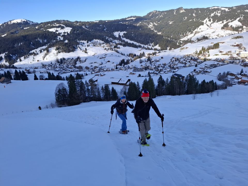 Herrliches Wetter, genug Schnee bis Oberiberg, jedoch nicht tragender Deckel auf der Nordseite und schwer in den S-Hängen.