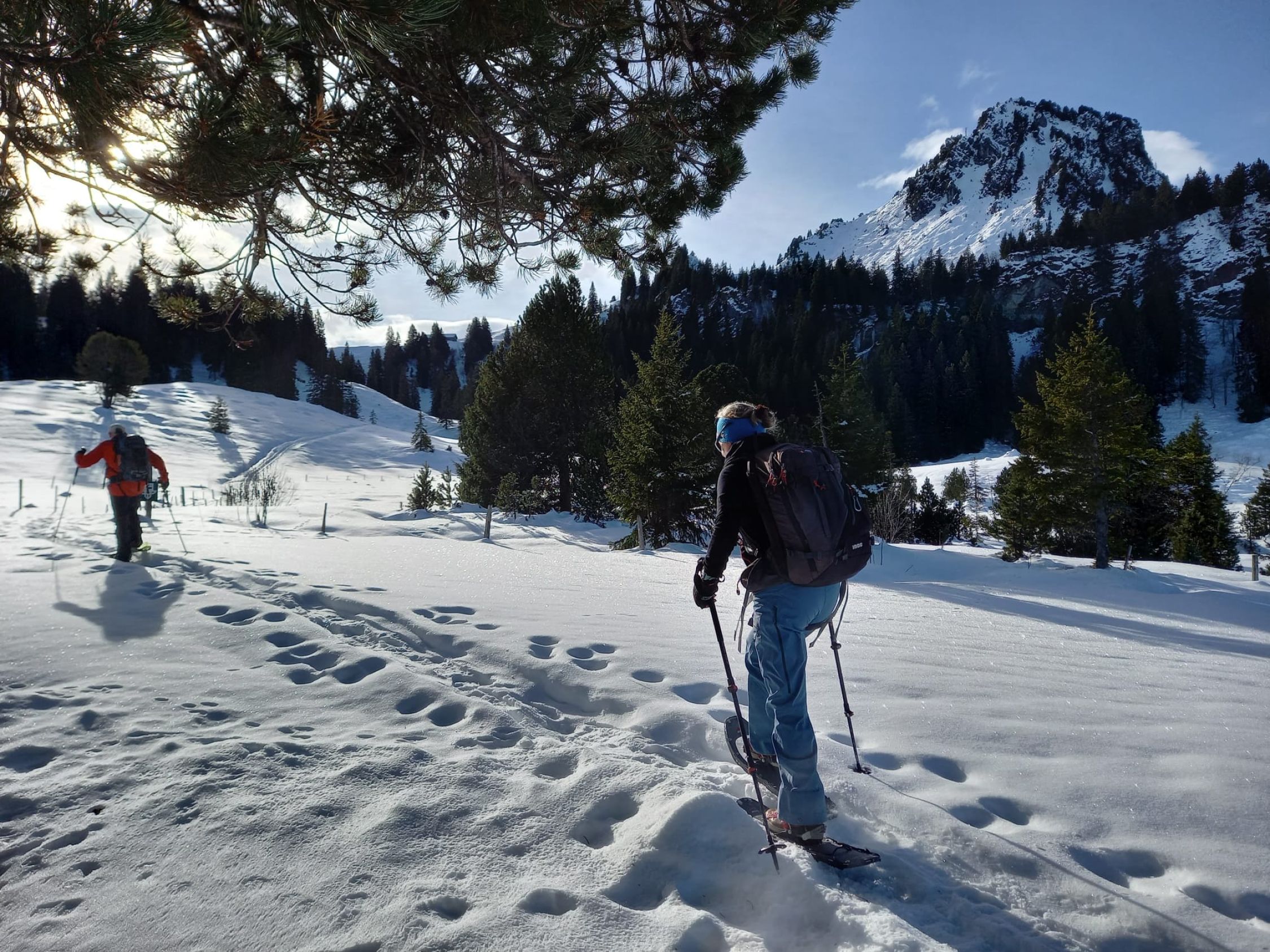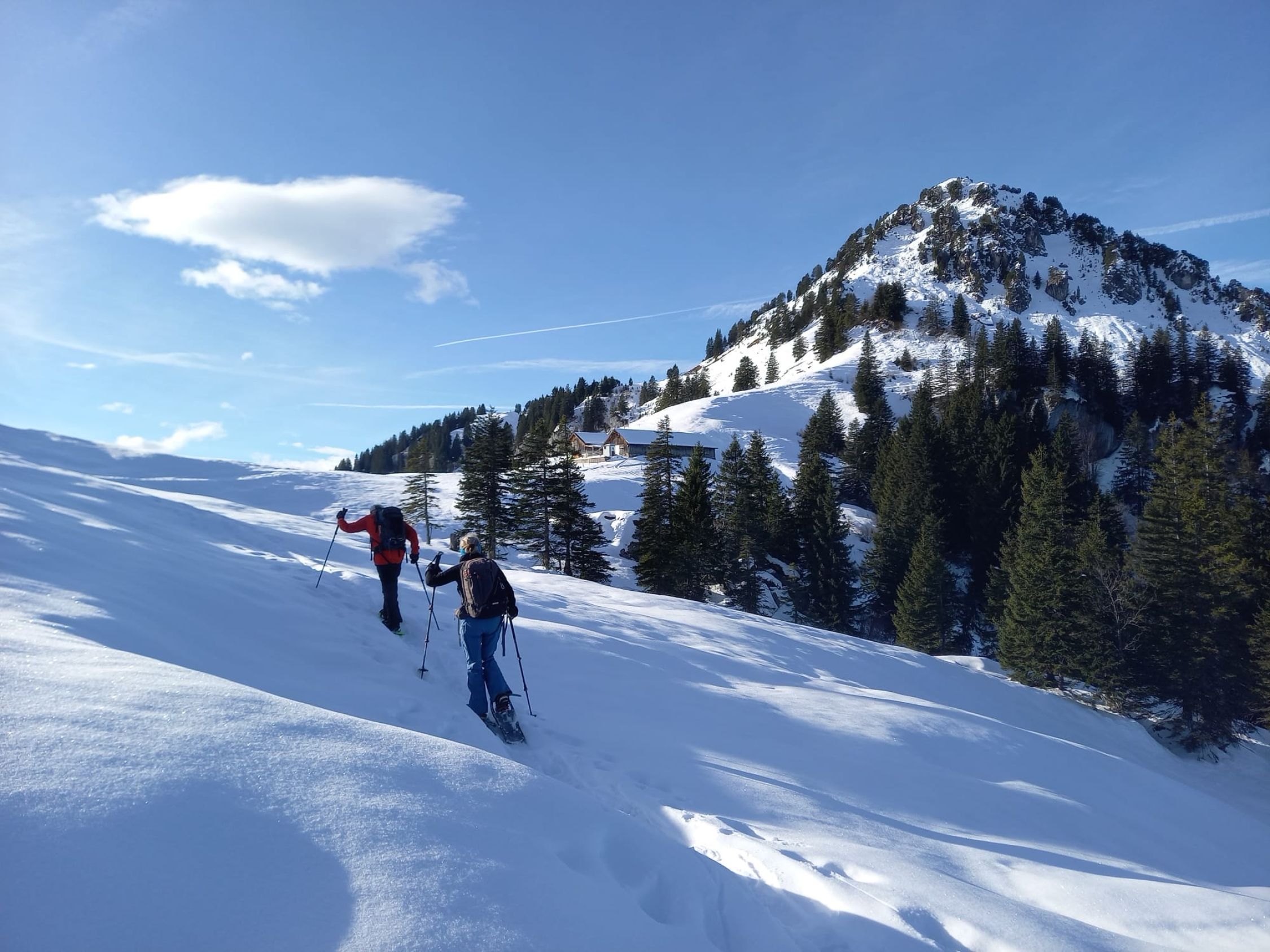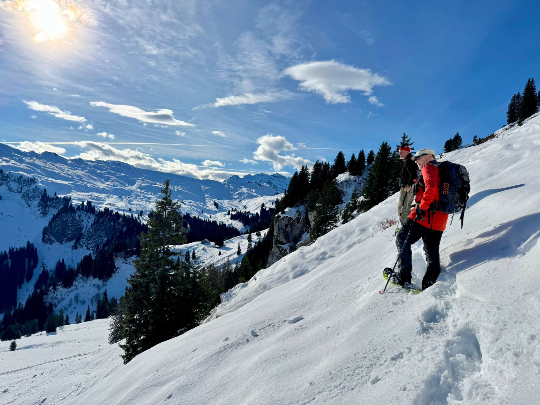 Herrliches Wetter, genug Schnee bis Oberiberg, jedoch nicht tragender Deckel auf der Nordseite und schwer in den S-Hängen.
