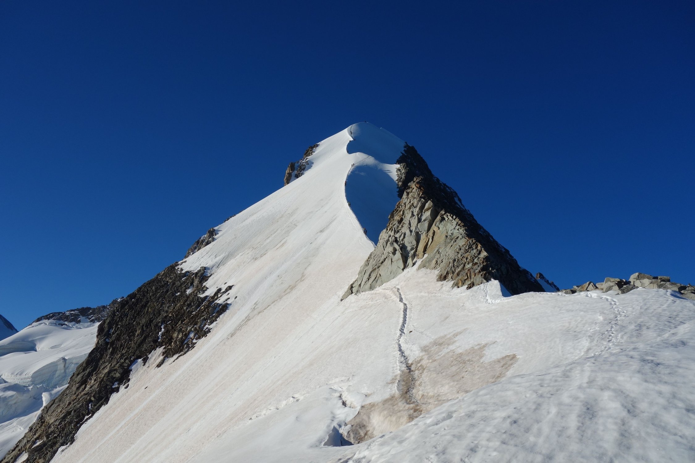 Aufstieg über den Firngrat bis zum Gipfel des Piz Bianco in perfektem Trittfirn.
