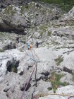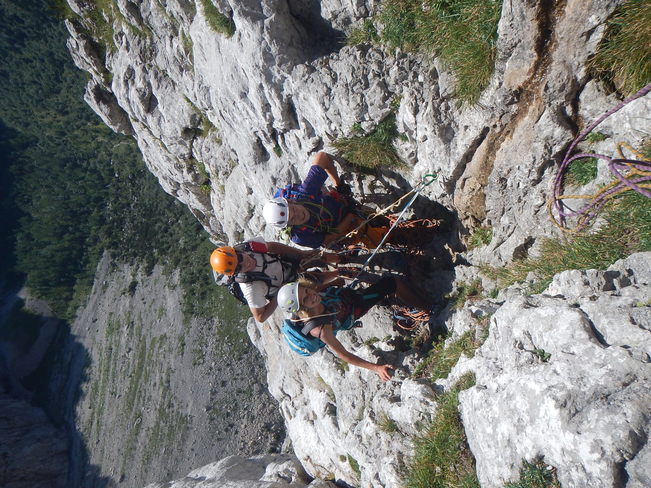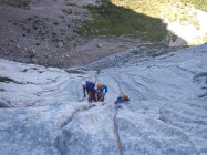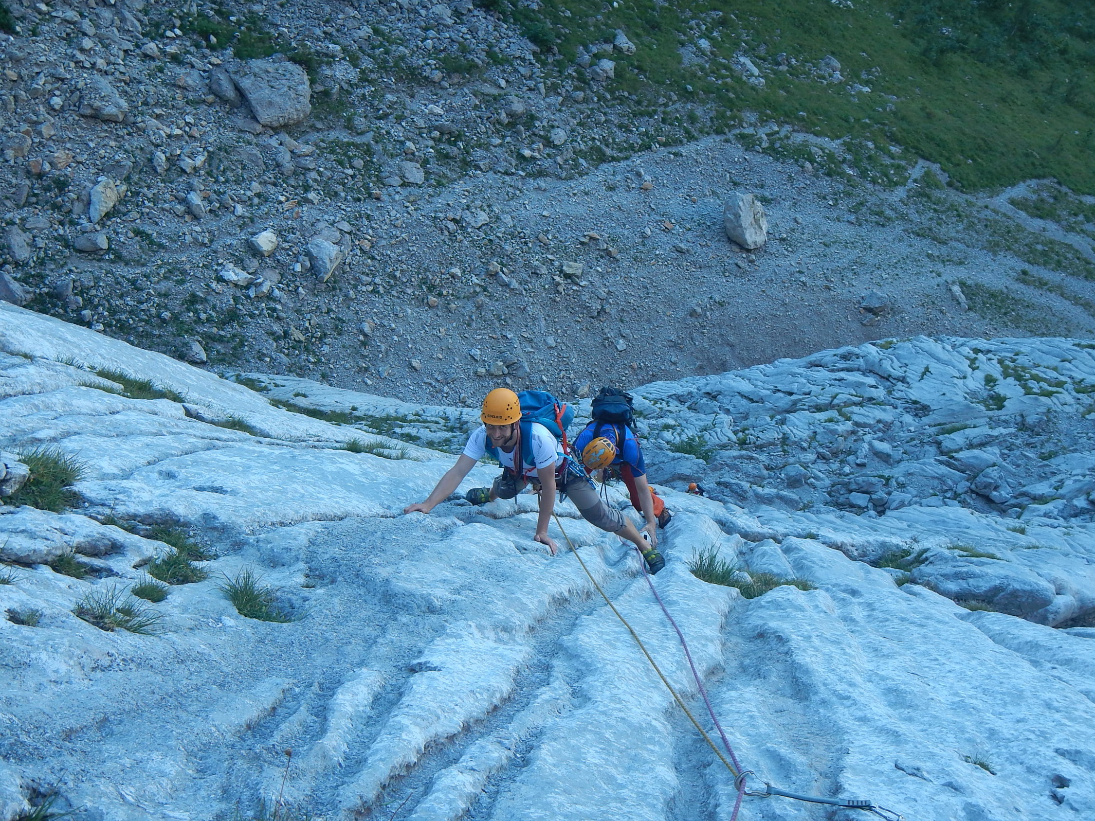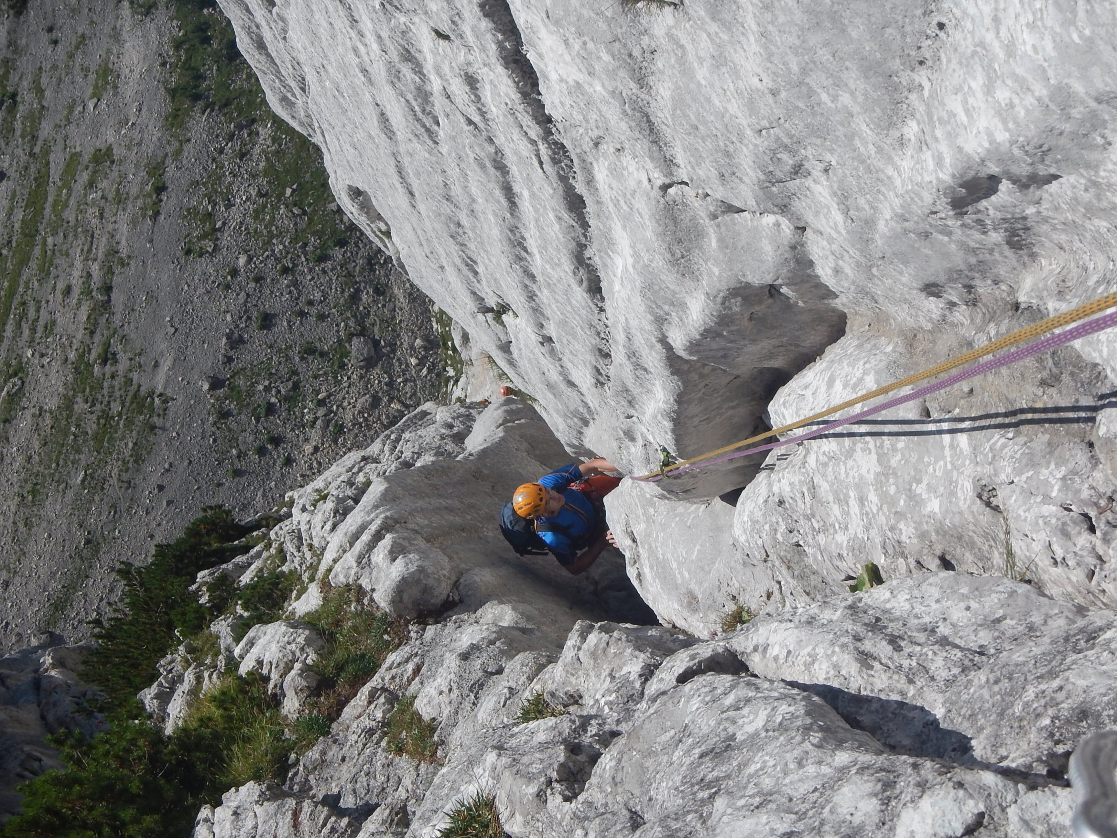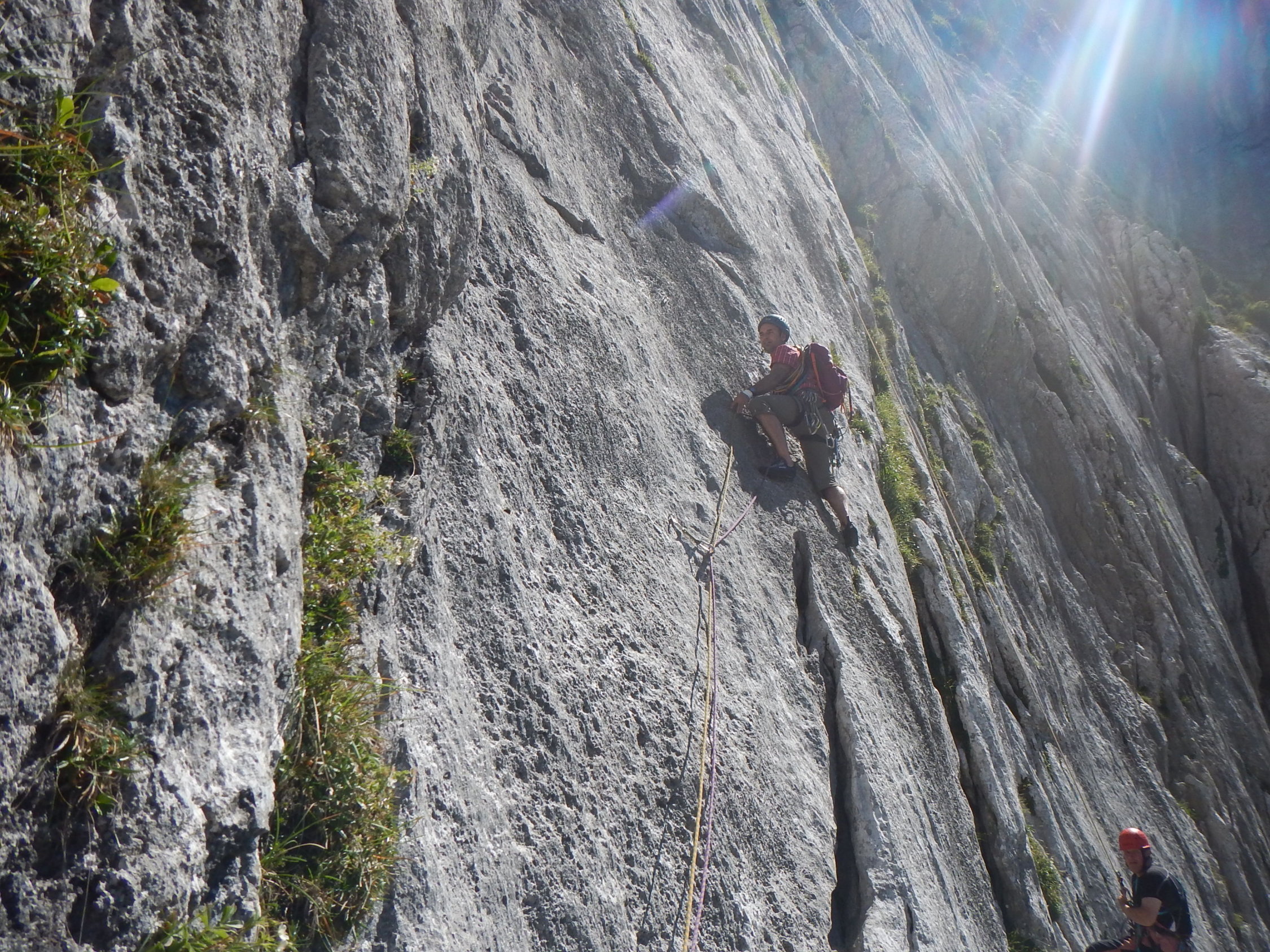 Alles trocken. Sonne schien ab 14 Uhr in die SW-Wand. Sehr schöne Tour in meist sehr gutem Fels, vorwiegend Platten mit Wasserrillen und teils auch rauhen kleingriffigen Kalkstrukturen, ab und zu auch Steilaufschwünge und Verschneidungen. Auf den Bändern liegen ab und zu Steine, v.a. beim Abseilen dadurch etwas Steinschlaggefahr. Bewertung teils eher hart, v.a. in den leichteren Seillängen. Insbesondere die letzten 3 SL sind z.T. hart bewertet, dort auch z.T. deutlich größere Hakenabstände als weiter unten. Ein paar Keile und Friends können dort nicht schaden.