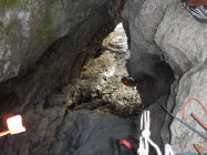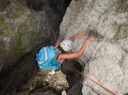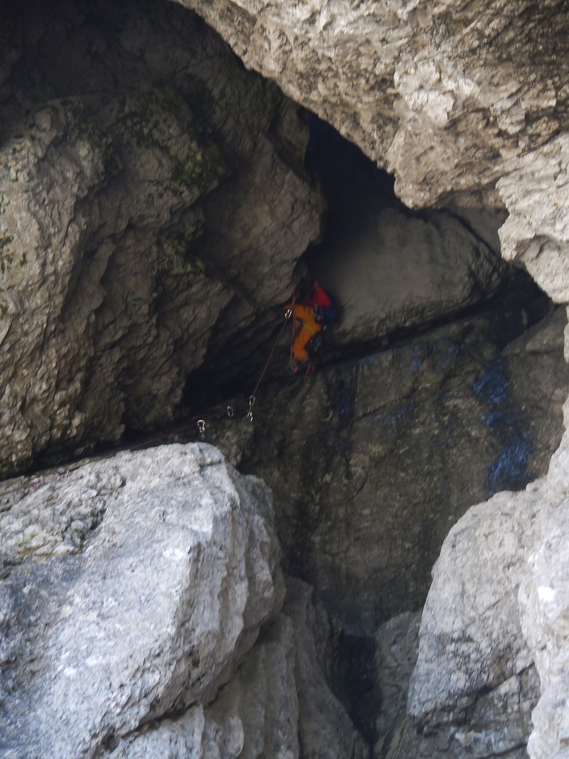 Beeindruckende Route in meist sehr gutem Fels. Highlight ist der bei uns z.T. nasse 60m-Schacht, den man in 2 SL z.T. in recht anstrengender, überhängender technischer Kletterei (5 A1, wie in gesamter Tour gute Bohrhaken in meist engen Abständen, Seilschlingen hängen) sowie etwas rutschiger, an kurzen Stellen etwas heikler Kletterei klettert. Felsqualität im Schacht ist z.T. mäßig, manche Griffe wackeln.