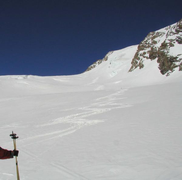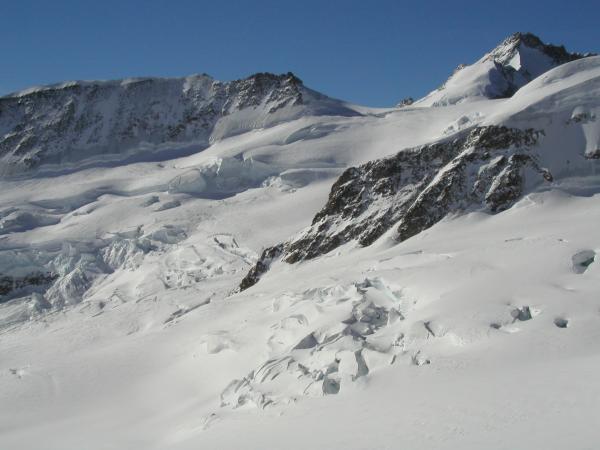 Die Spalten sind im generellen zugedeckt. Einige spalten sind nur dünn gedeckt. Auf dem Jungfraufirn: hart und wind gepresst. Aufstieg zum Louwitor: 10cm Wind verfrachteter Pulver, schlecht mit unterlagen verbunden. Abfahrt Louwitor-Aletschfirn: harte unterschicht, mit 5-10cm pulver oder unten sulz.