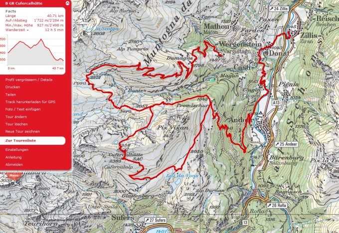 Ab Wergenstein Ab Wergenstein nach Dumagns, Alp Anarosa, Promischur, lai da Vons, SAC Hütte, Piz Calandari, Lai da Calandari, Fops, Promischur und auf hübschen Weglein nach Andeer.