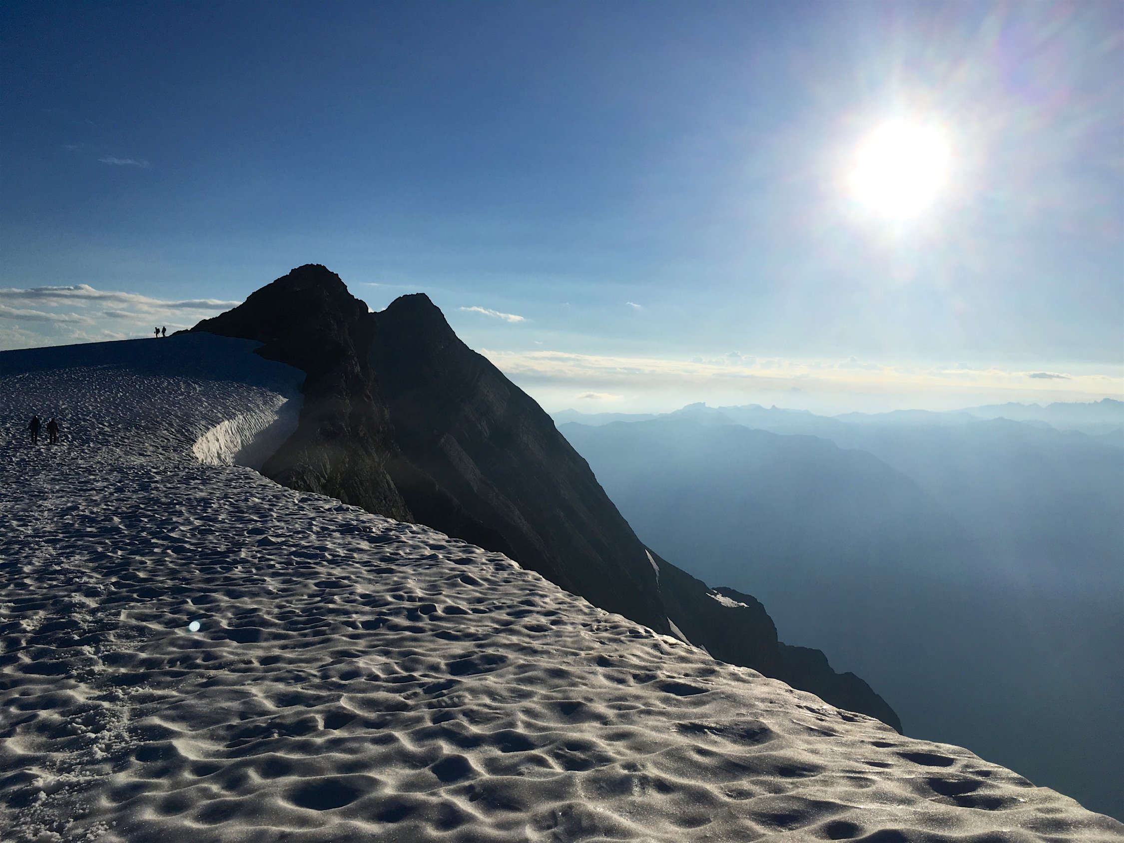 Top, trocken, sonnig mit leichter Bewölkung. Der obere Teil des Gletschers ist schneebedeckt, der untere Teil schneefrei. Klettersteig, Schwandergrat und Aufstieg zum Gipfel sind schneefrei und trocken.