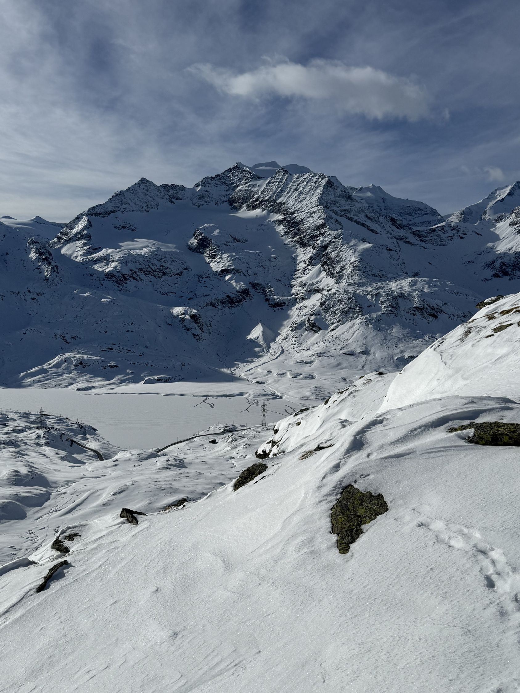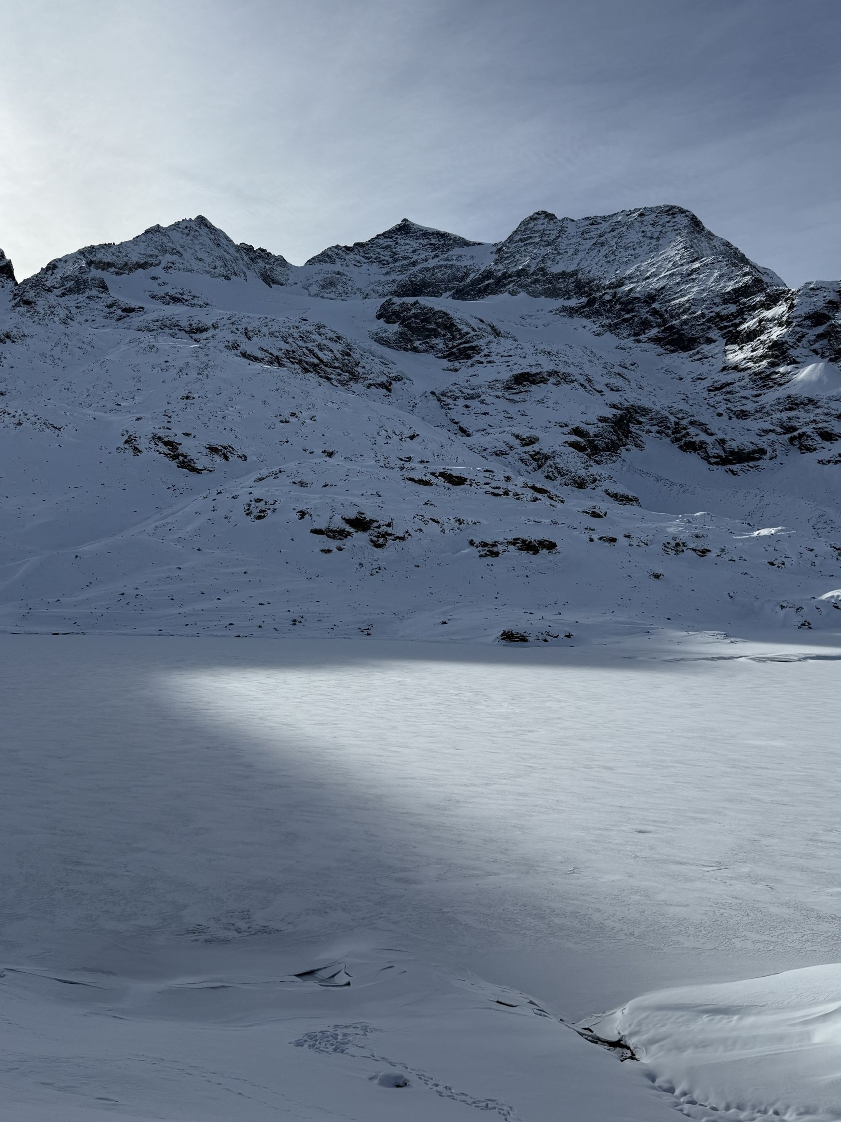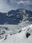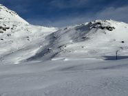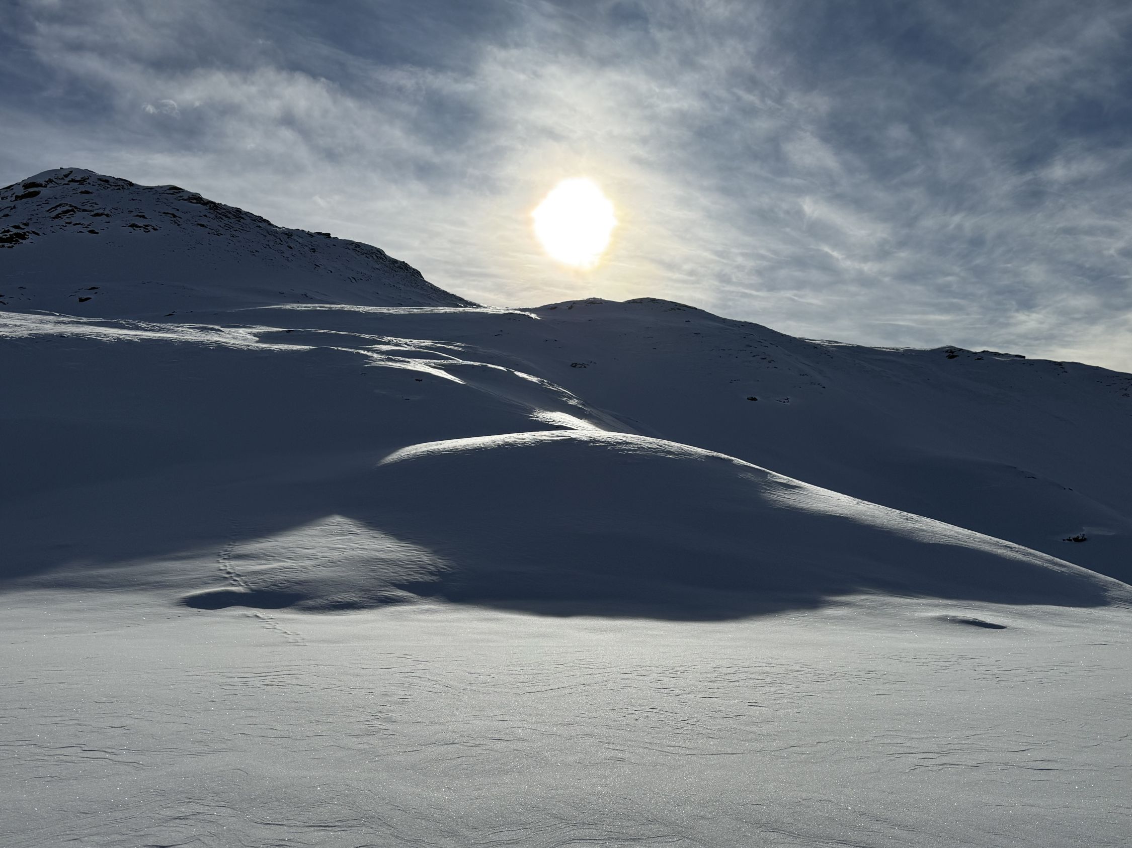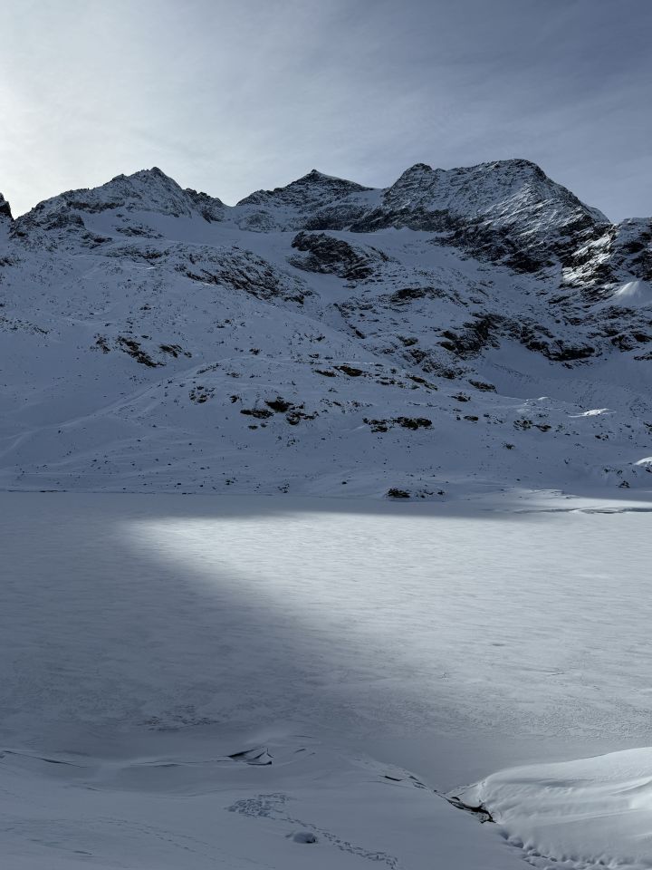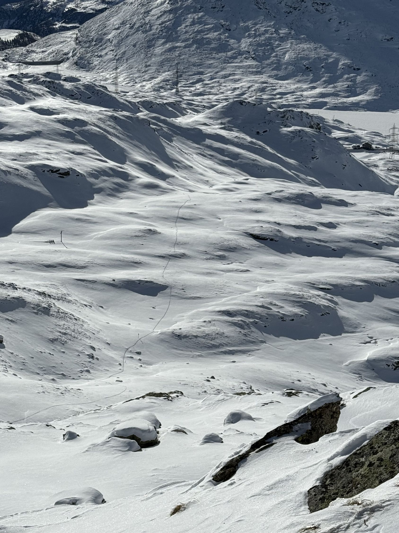 Start zur Skitourensaison im breiten Val dal Bügliett bis Südflanke Piz Lagalb 2700 m, ÖV Tour, WS. Start RhB Station Bernina Ospizio 2254 m. Minus 10 Grad. Windstill, blauer Himmel. Mit Ski bis Passtrasse und weiter in der Westflanke der Motta Bianca 2461 m im Schatten relativ flach bis zur Westflanke Punkt 2560. Viel Pulerschnee und keine Spuren. Nun in der Südflanke Piz Lagalb hoch bis 2700 m. Abfahrt zur grossen Kurve Passstrasse Bernina und Aufstieg zu Fuss zum Albergo Bernina und runter zur RhB Station. Der Zug von Tireno war leider überfüllt und alles altes Rollmaterial und viele Fenster offen! Abfahrt war leider nicht so toll trotz genügend Schnee, schwerer Pulverschnee und unten leicht gedeckelt.