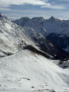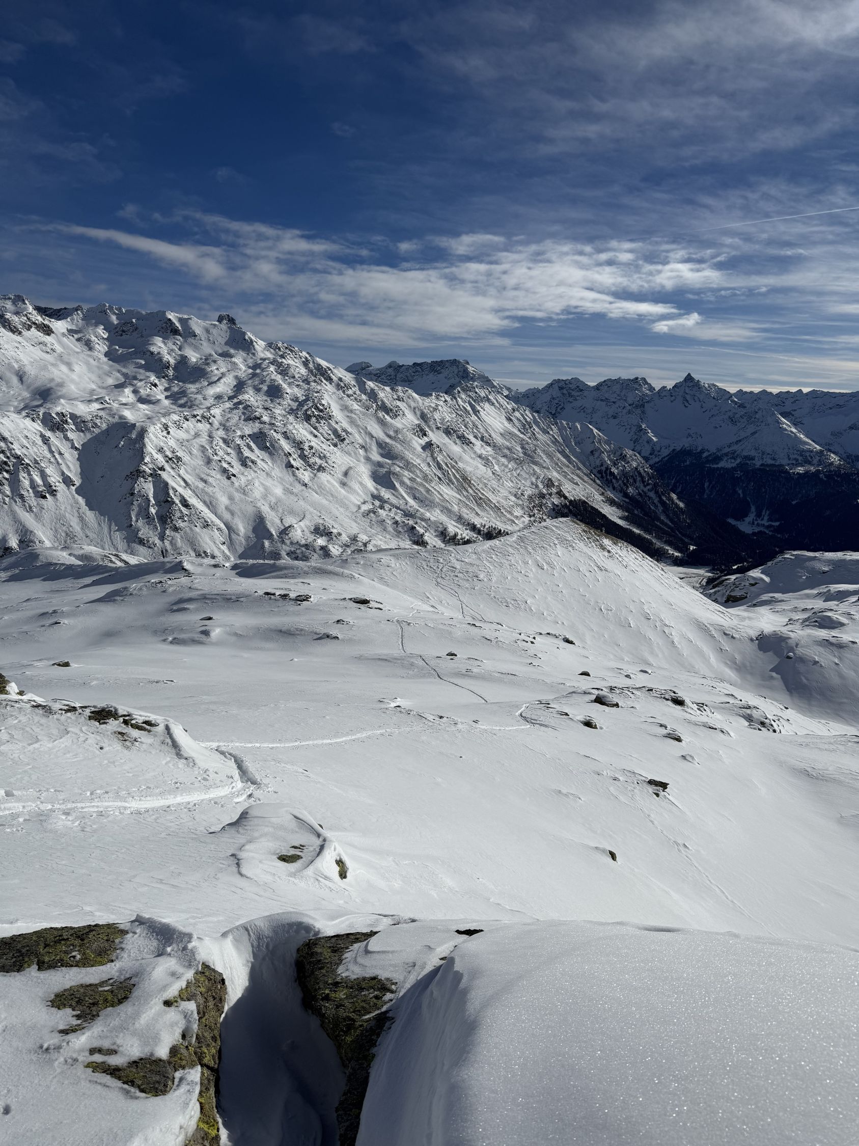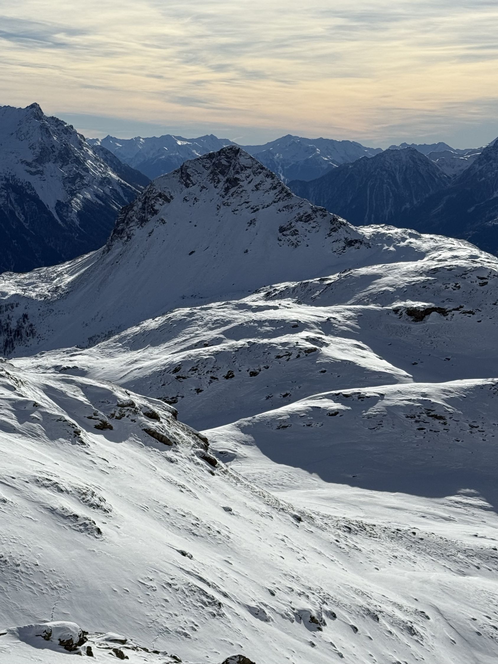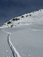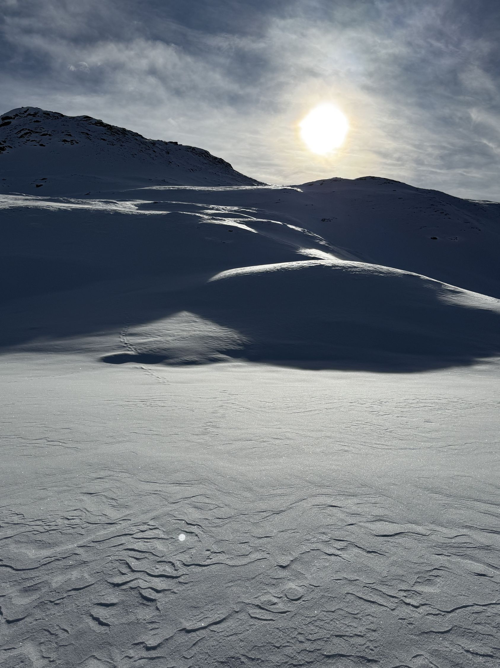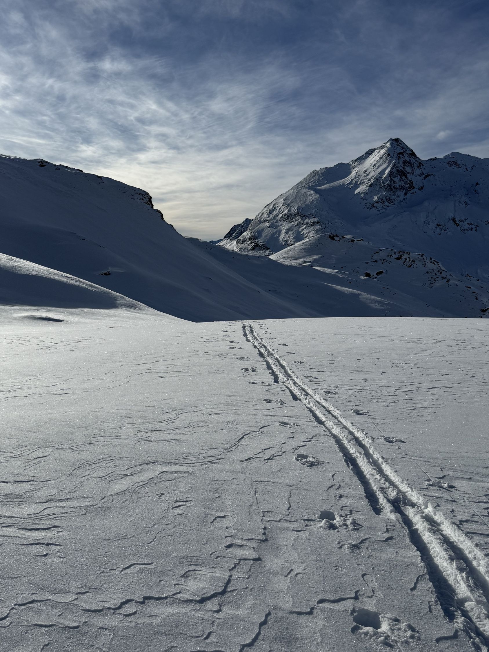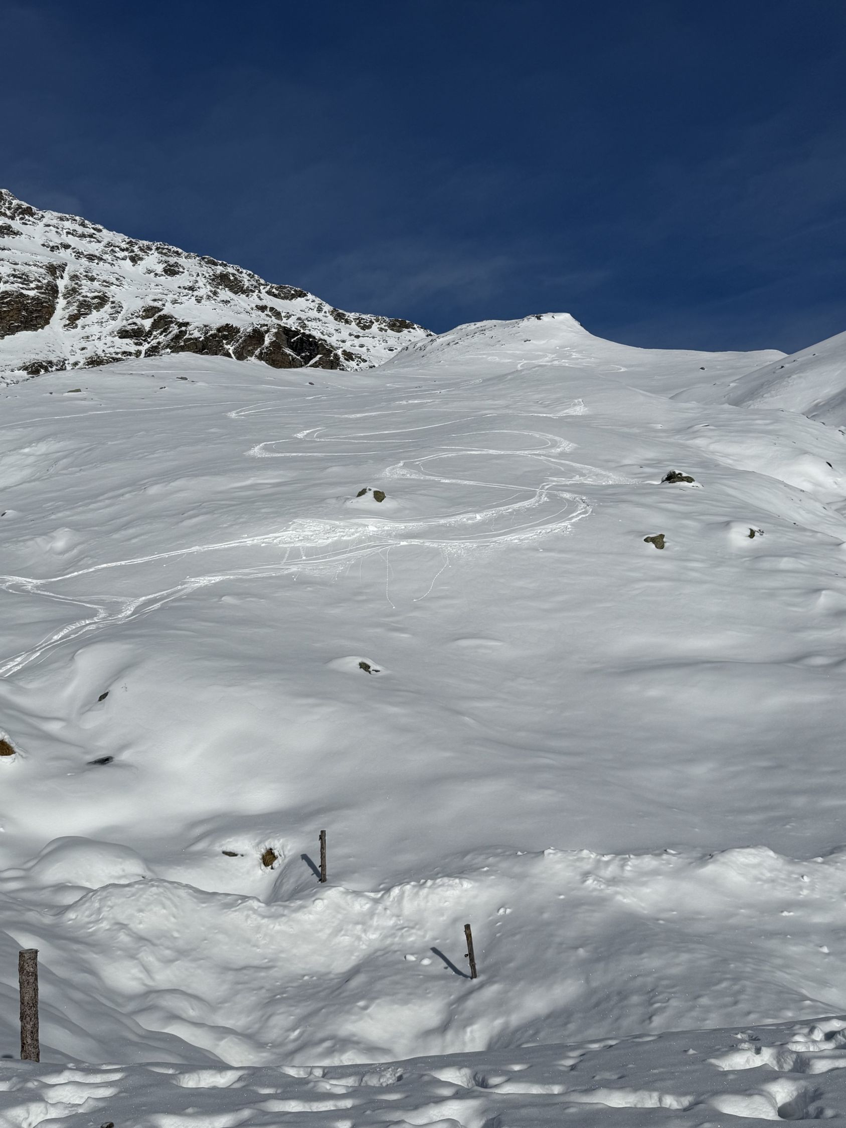 Start zur Skitourensaison im breiten Val dal Bügliett bis Südflanke Piz Lagalb 2700 m, ÖV Tour, WS. Start RhB Station Bernina Ospizio 2254 m. Minus 10 Grad. Windstill, blauer Himmel. Mit Ski bis Passtrasse und weiter in der Westflanke der Motta Bianca 2461 m im Schatten relativ flach bis zur Westflanke Punkt 2560. Viel Pulerschnee und keine Spuren. Nun in der Südflanke Piz Lagalb hoch bis 2700 m. Abfahrt zur grossen Kurve Passstrasse Bernina und Aufstieg zu Fuss zum Albergo Bernina und runter zur RhB Station. Der Zug von Tireno war leider überfüllt und alles altes Rollmaterial und viele Fenster offen! Abfahrt war leider nicht so toll trotz genügend Schnee, schwerer Pulverschnee und unten leicht gedeckelt.