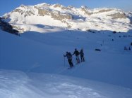 Spuren bis zum Gipfel mit einer Hartkruste. Wetter einwandfrei, sehr warm. Gipfel um 10.05 Uhr erreicht. Abfahrt Richtung Muotathal aber beim Punkt 2232 sind wir Nord-Westlich zum Punkt 1676, 1439. Super Schneeverhältnisse. erster Hang stark verfahren aber dann das reinste Vergnügen. Pulver, Pulver vom feinsten. Keine Spuren weit und breit. Ab Punkt. 1439 gegenaufstieg zur Höchi und Abfahrt nach Chäppeliberg.