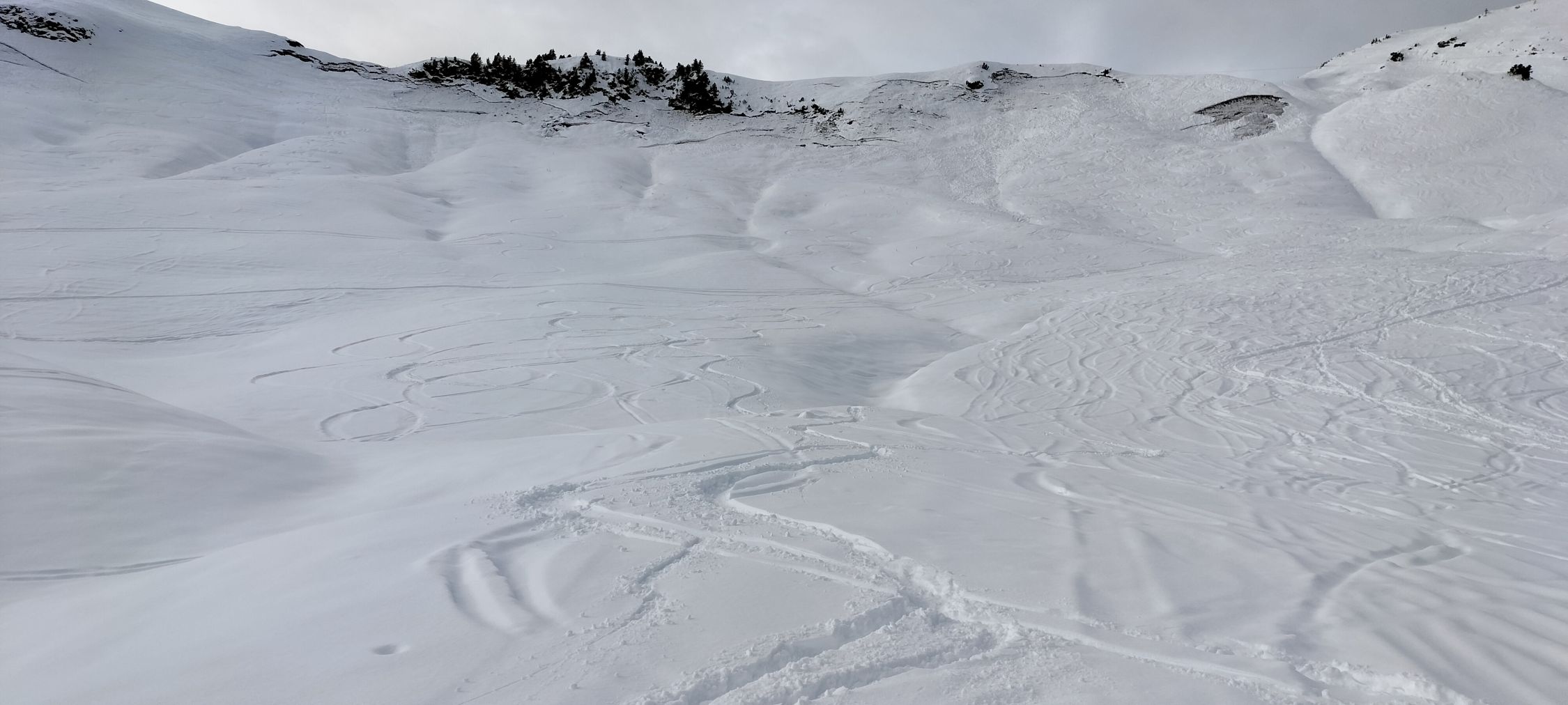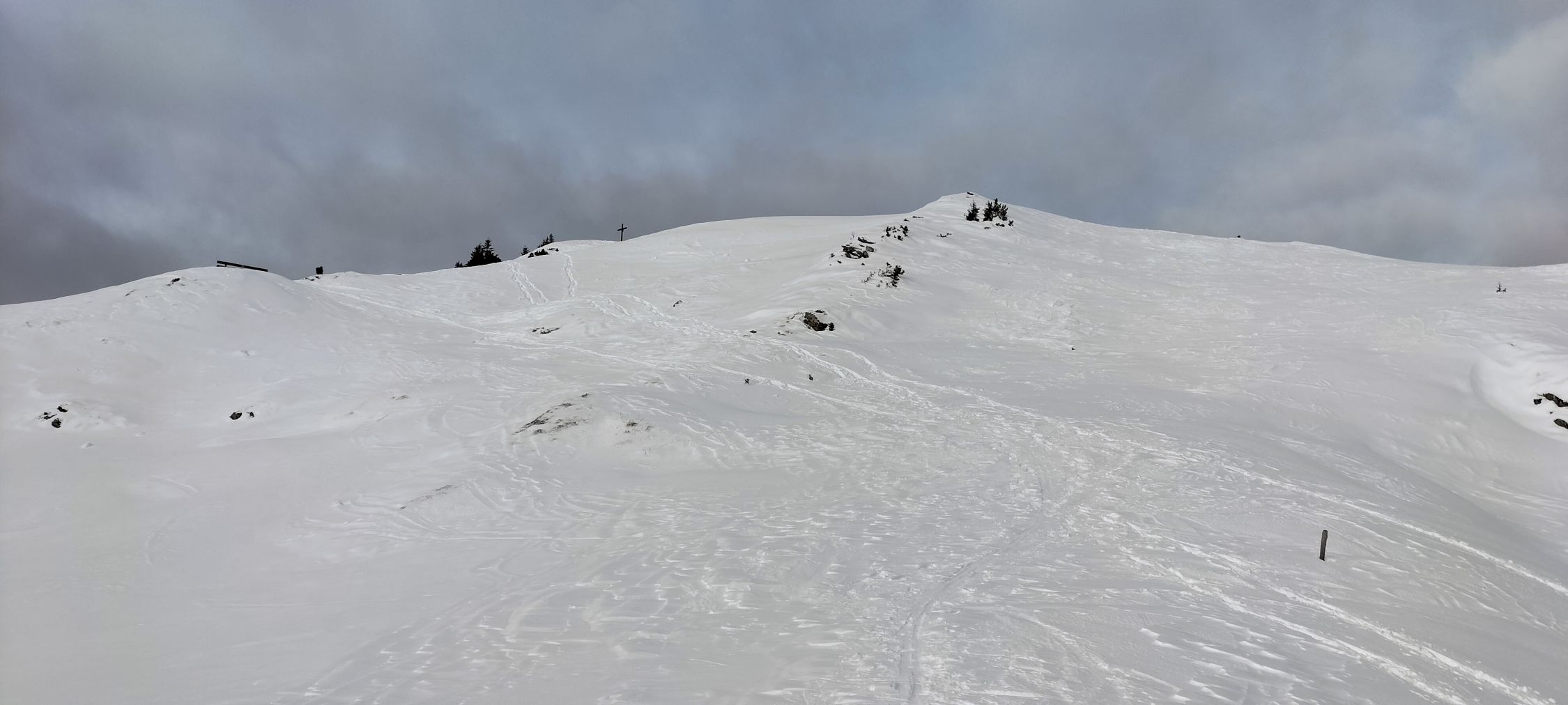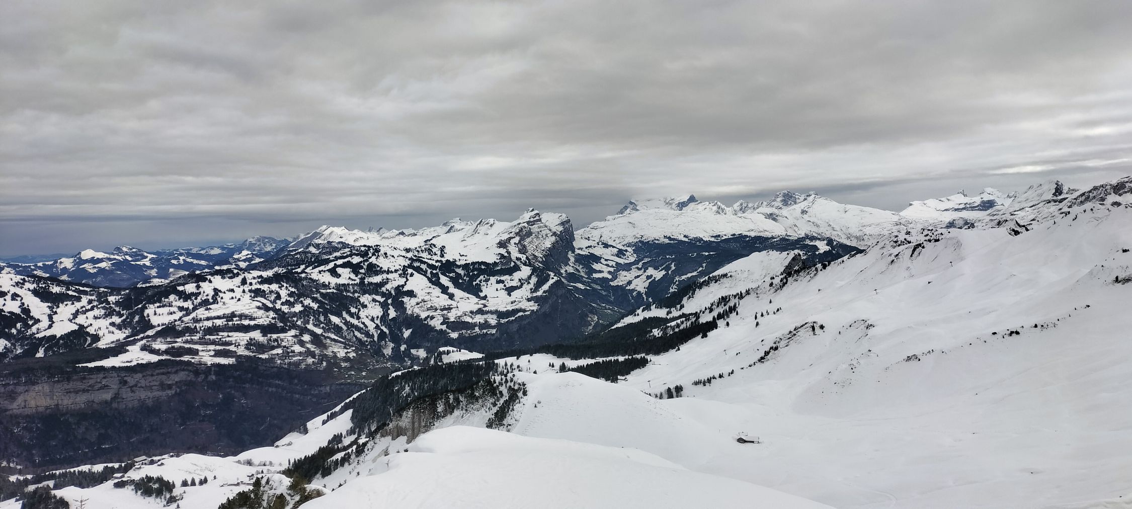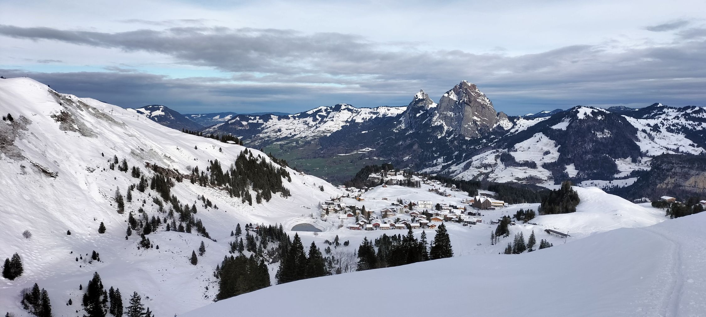 Start der Tour am 9.00 Uhr beim Stoos, das Wetter noch bedeckt, aber immer schöner, gute Unterlage mit 10 cm Pulverschnee vom Vortag.