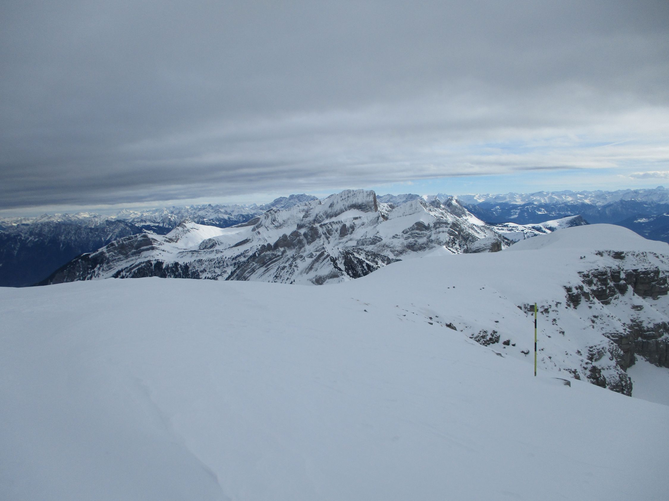 Unten wenig Schnee, vielleicht 10 bis 15 cm. Ab ca. 1600 m sehr gut, relevant vor allem für Skifahrer. Meine beiden Begleiter Vladi und Bernd konnten mit etwas Umsicht bis zum Parkplatz hinunterfahren.