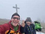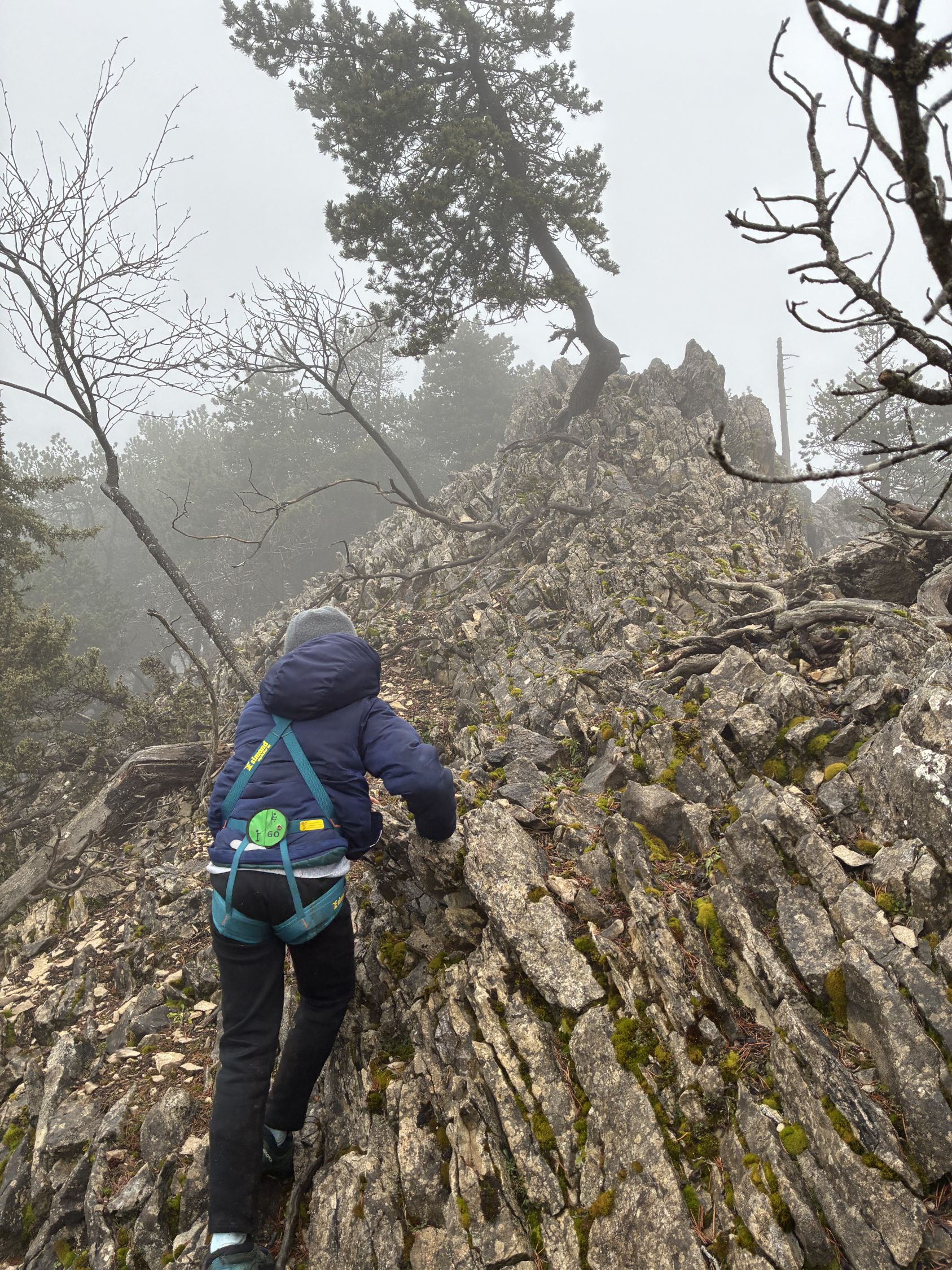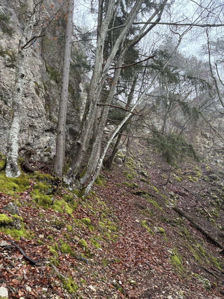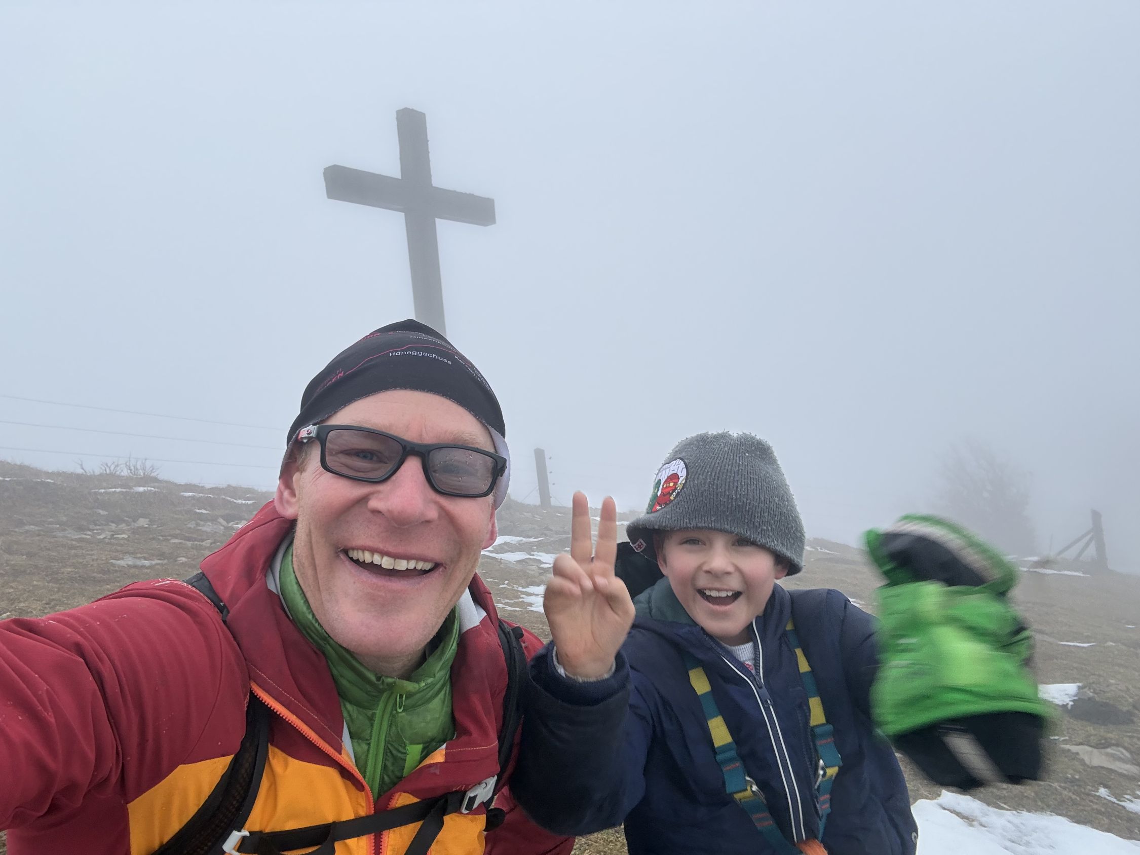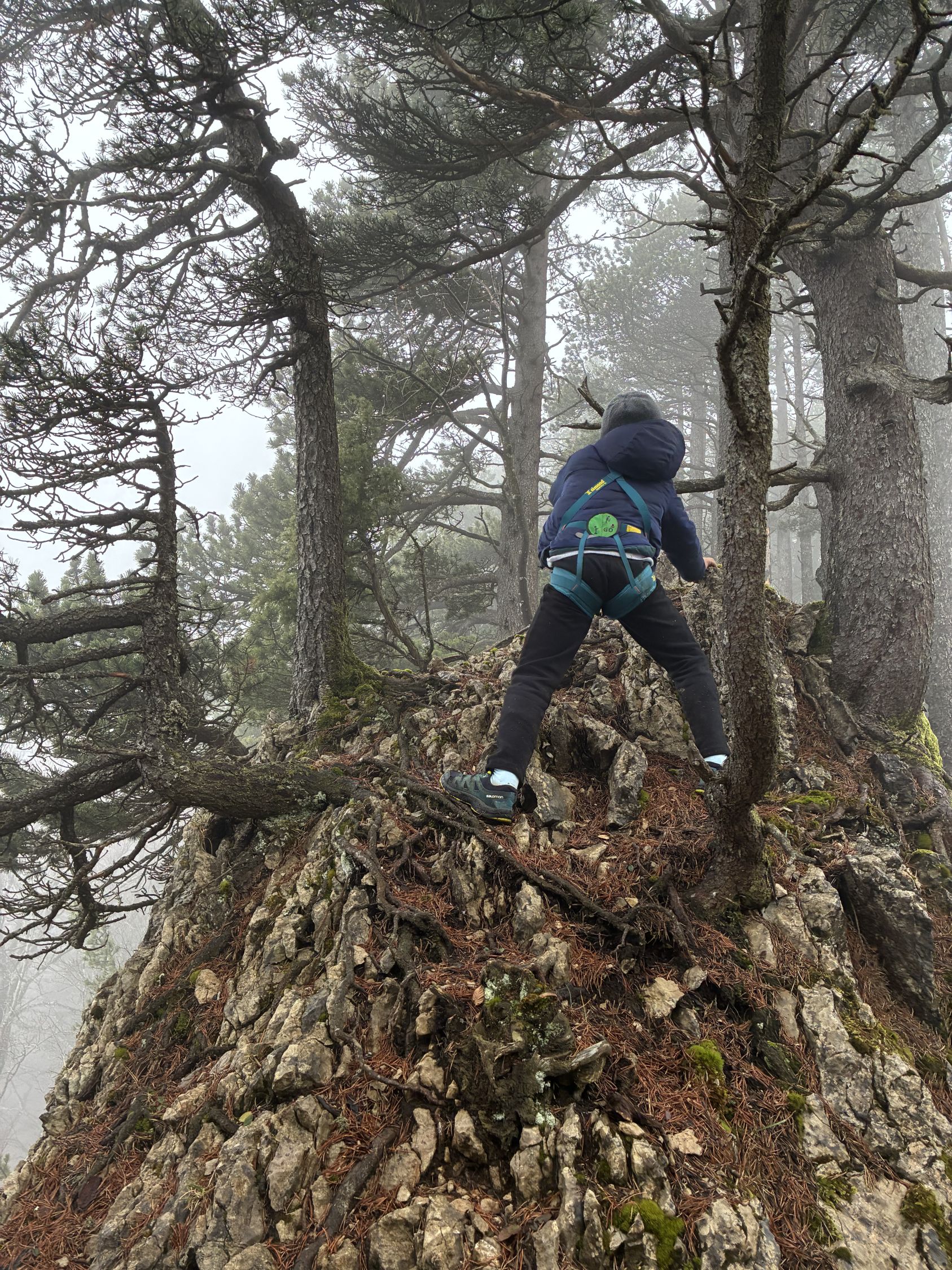 Heute schien der perfekte Tag für eine Reko-Tour. Gechilltes Wetter (ab und an leichter Nieselregen, Sicht teilweise über 100 m), wenig Volk unterwegs und ein starker Vorsteiger (mein 10-jähriger Sohn). Naja, der erste Aufschwung ist dann gleich einmal senkrecht, vllt hab ich da die Eingangsschwierigkeiten etwas unterschätzt... Irgendwann haben wir wenigstens einmal die Flanke in die Nordseite gewechselt, wirklich auf dem Grat waren wir dann erst gegen 1050 m. Man darf halt nicht zu stark hineinzoomen, so hat man zumindest einen Ostgrat-Integrale Eindruck.