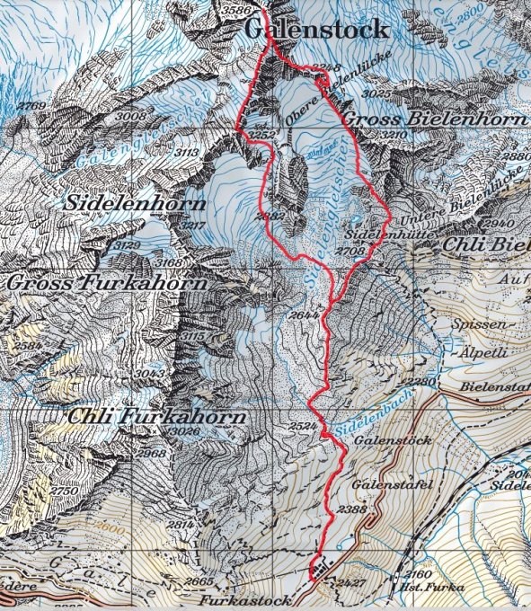 Auf dem Furkapass gestartet via Sidelenhütte. Kurz nach der Hütte beim WC-Haus ist die Abzweigung zu den Wegspuren die hinauf auf den Sidelengletscher leiten. Anfangs ist der Gletscher blank, im Aufstiegs Sinn eher rechts haltend, wo der Gletscher noch Schnee bedeckt ist, ab ca 2980m ist der Sidelengletscher noch gut mit Schnee bedeckt der am morgen früh hart und gut tragend war. Beim Einstieg zum Klettersteig ist eine grosse quer Gletscherspalte links zu umgehen.