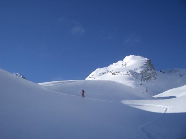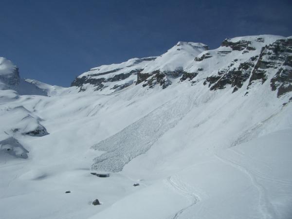 Tour auf Alvier bis kurz vor Couloir-Ausstieg, danach umgekehrt. Schon gegen 9.30 Uhr durch die Erwärmung überall kleinere Schneeabgänge. Auf ca 1500m hinter uns ordentlicher Schneebrettabgang.
