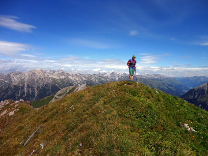 Der weitere Routenverlauf über den Schwarzen Kranz und die Gsteinsspitze ist weglos, orientierungsmässig aber recht übersichtlich. Felsstufe am Nordgrat des Schwarzen Kranzes I-II (Kamin), an der Gsteinsspitze II und etwas ausgesetzt. Sonst abwechslungsreiches Gras-Schrofen-Gelände, leichtes Gekraxel und tolle Ausblicke in die Allgäuer, Lechtaler und Bregenzerwald- Berge.