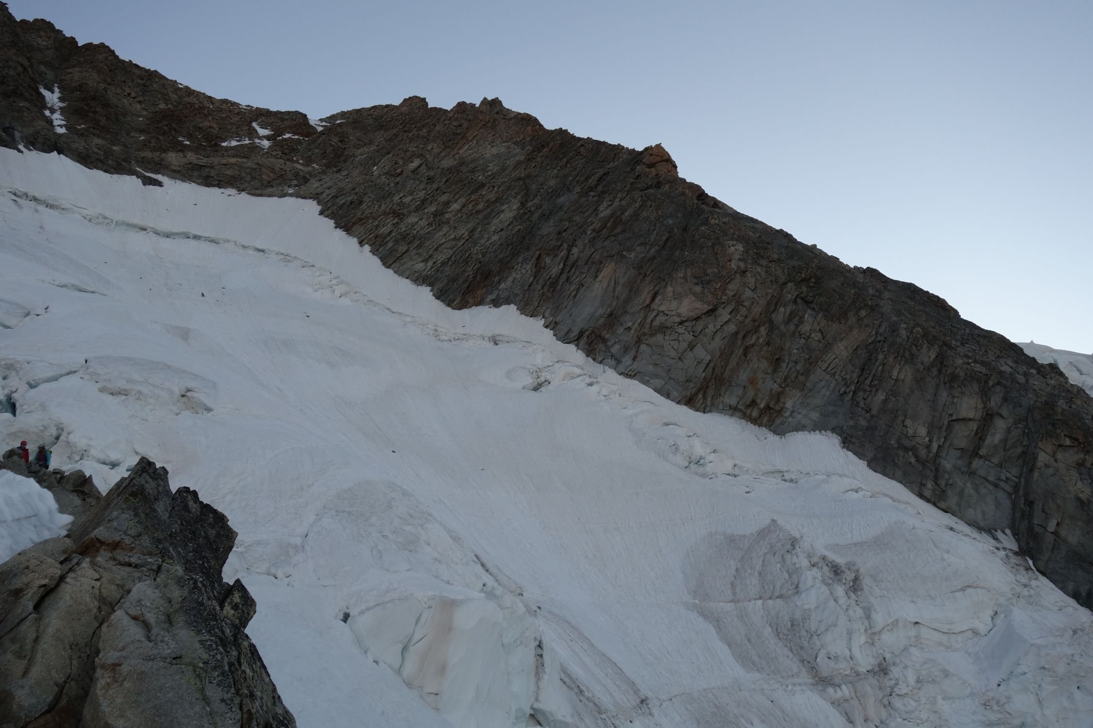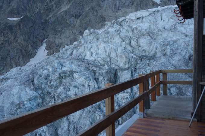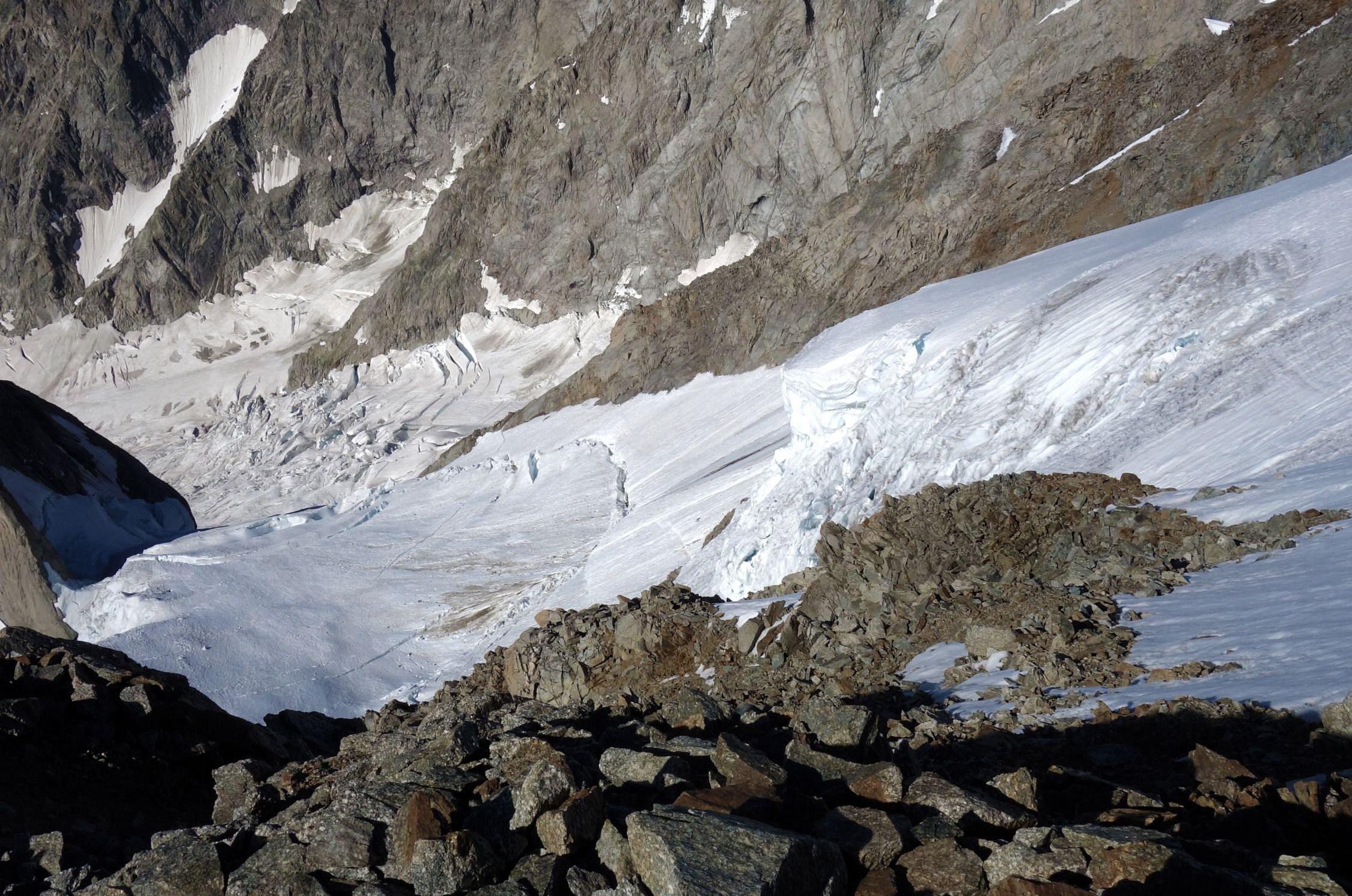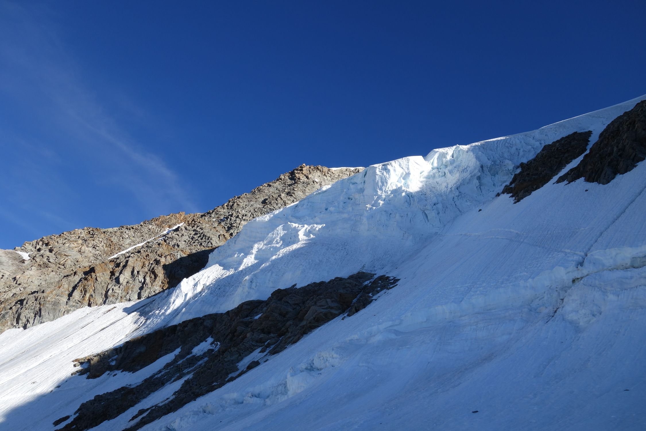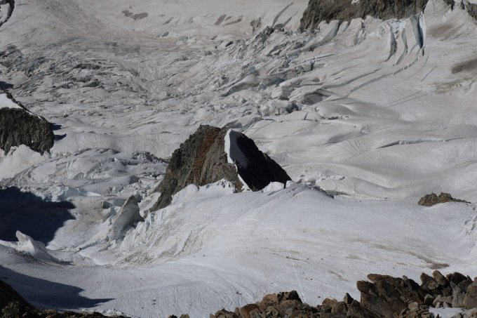 Fels trocken, teilweise sehr brüchig da zu trocken; der Grat ab Pt. Whymper ist nahezu schneefrei. Im Aufstieg unterhalb der Reposoirfelsen teilweise einige Meter Blankeis. Der Serac nach der Whymperrippe ist momentan relativ harmlos (vgl. Photos).