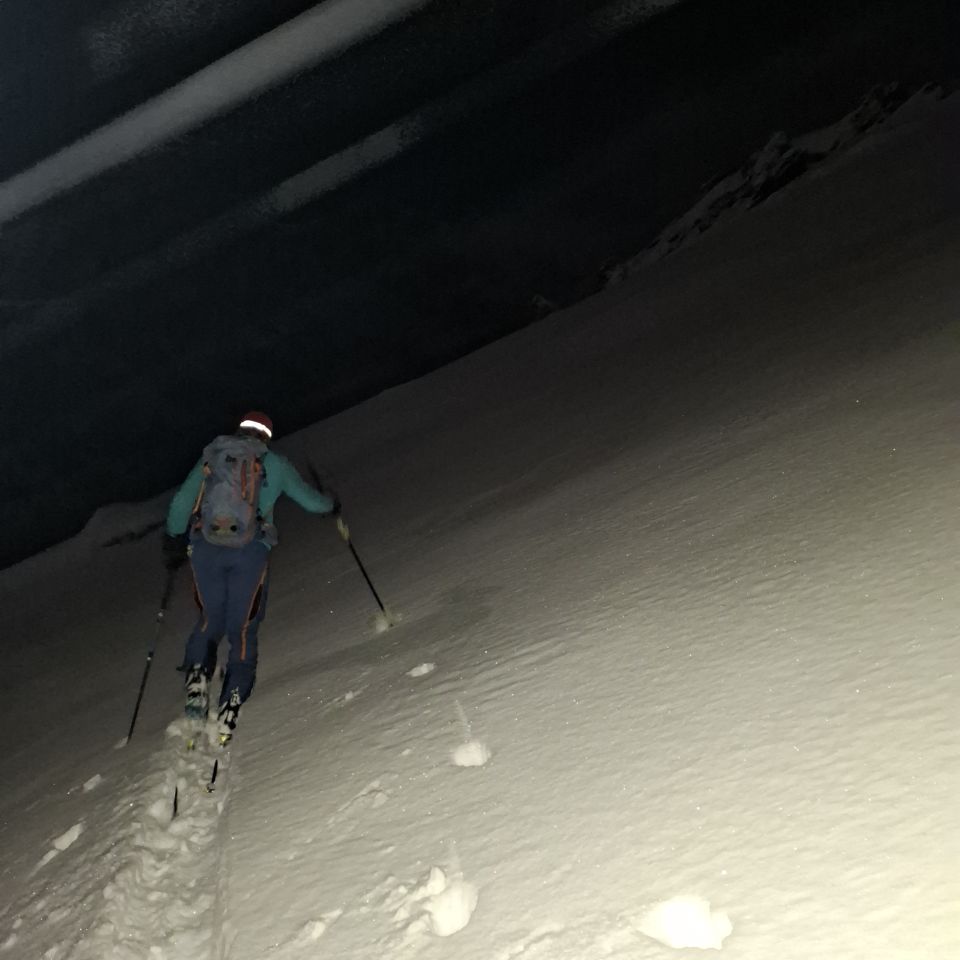 Wir gingen bereits am vortag von der Hütte bei schönem Mondschein bis auf eine Höhe von 2000m und da war es eigentlich grad noch besser da in der Nacht etwas Wind den Schnee bearbeitete. Also die Neuschneeauflage war teilweise gepresst.