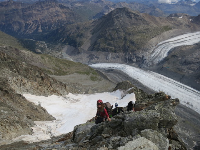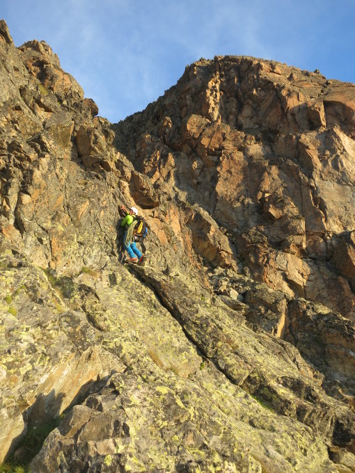 Gute Verhältnisse, gesamter Grat ist schneefrei. Wichtig ist es, am Einstieg zum ersten Felsaufschwung die Hütte gerade noch zu sehen - weiter links kommt man unter Überhänge. Schöner Grat, wenig frequentiert, teilweise aber brüchiger Fels. Im Abstieg über den Normalweg teils eisige, lästige Stellen.