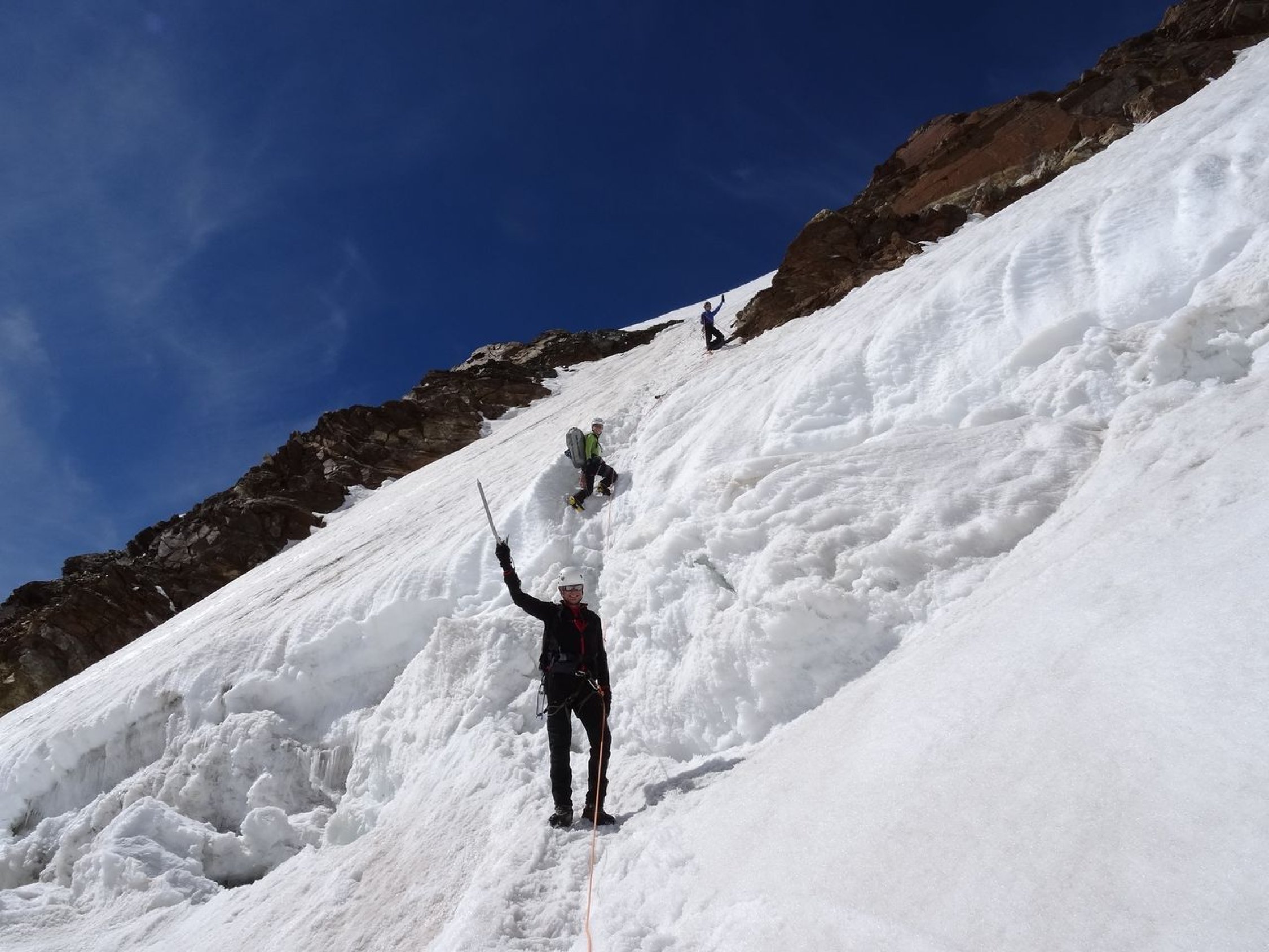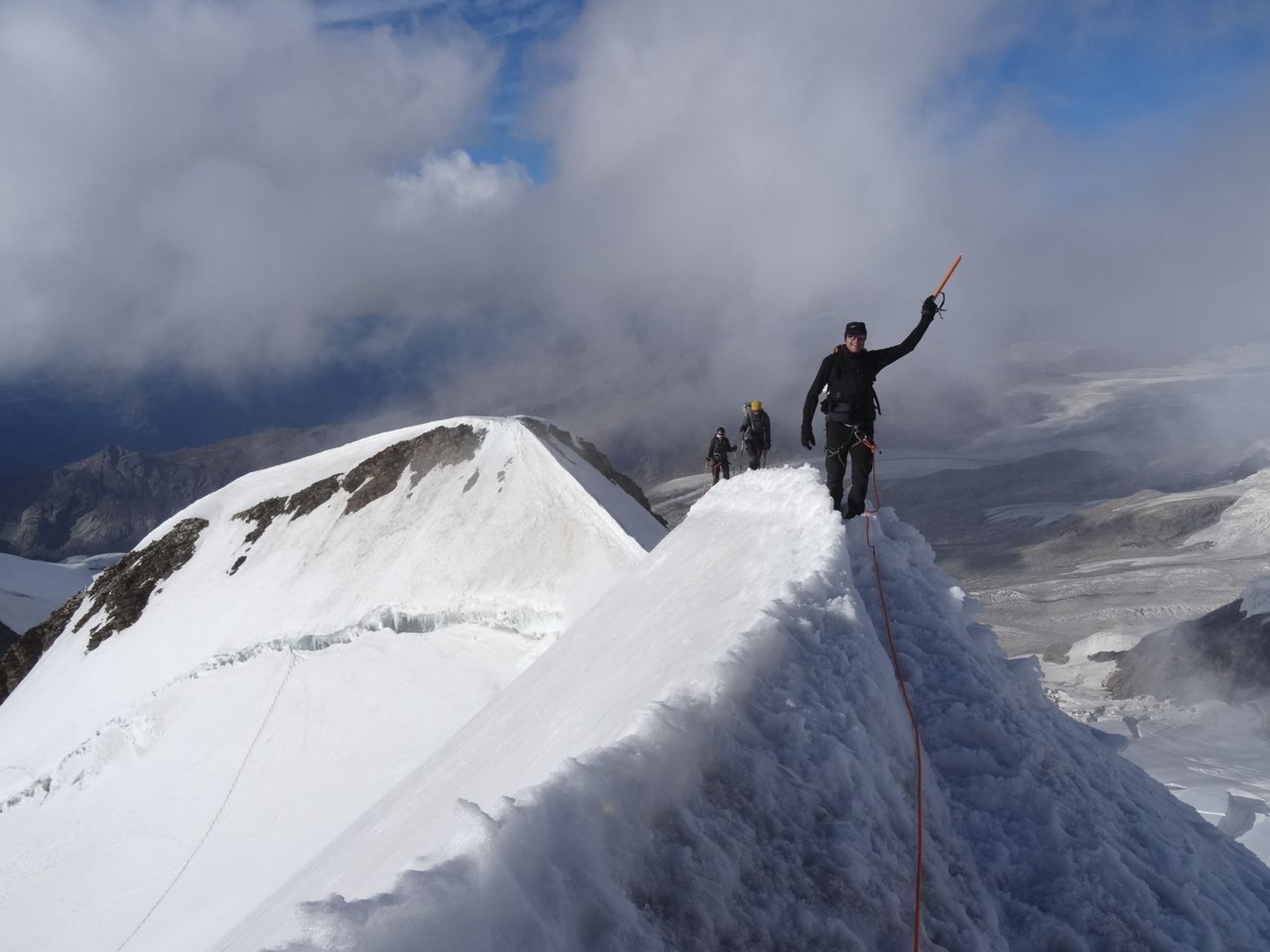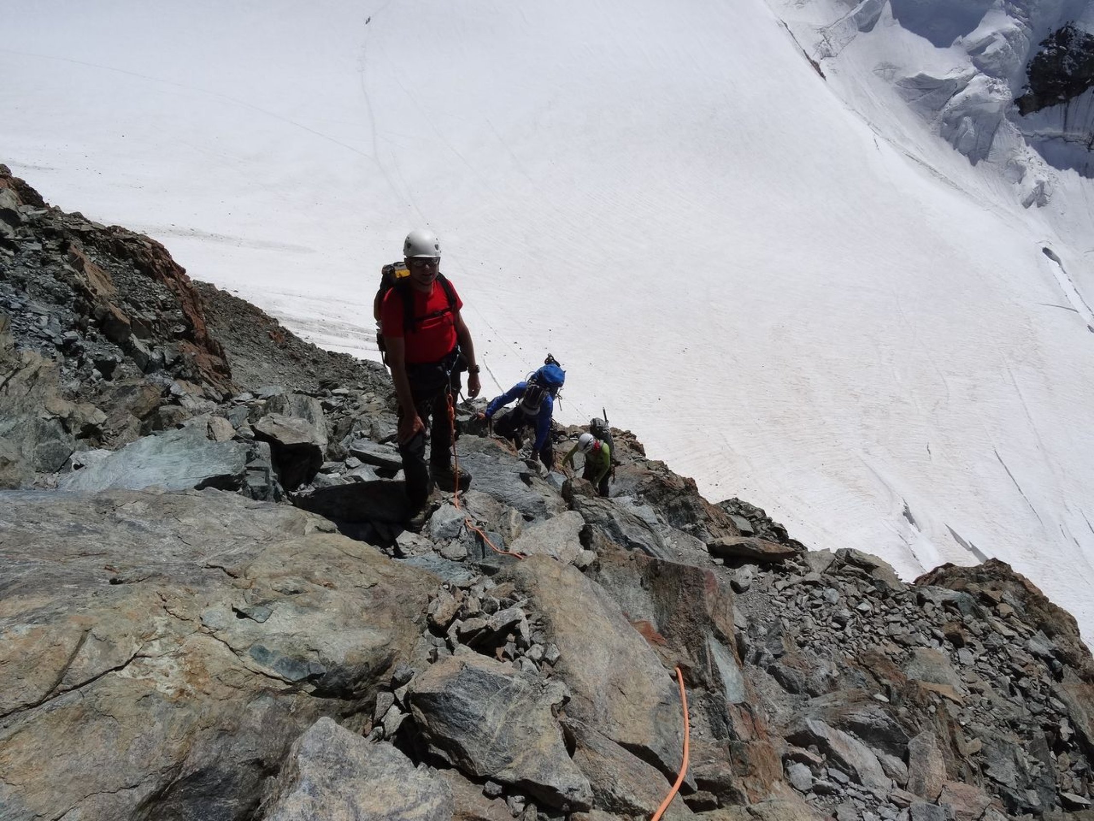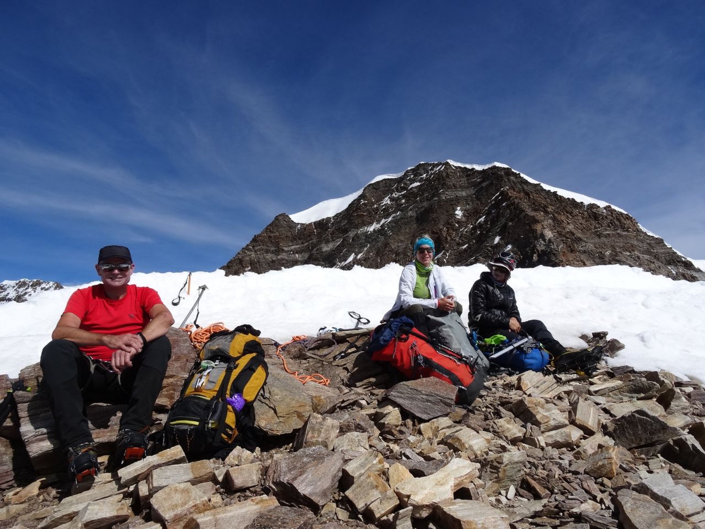 Übergang von der Quintino Sella-Hütte zur Regina Margherita-Hütte via Il Naso (nachdem mein Bruder und ich im Vorjahr über den Liskamm gingen). Dabei sind wir noch auf die Piramide Vincent und Felsinsel Balmenhorn aufgestiegen. Zwei von uns sind zusätzlich noch auf das Schwarzhorn, die Ludwigshöhe und die Parrotspitze gegangen (was mein Bruder und ich bereits letztes Jahr erledigten). Mit der Erreichung der Hütte ist auch die Signalkuppe erklommen. Es herrschten beste Verhältnisse. Bei der Überschreitung von Il Naso gab es in den Steilpassagen (NW- und SO-seitig) Eis und es musste entsprechend gesichert werden.
