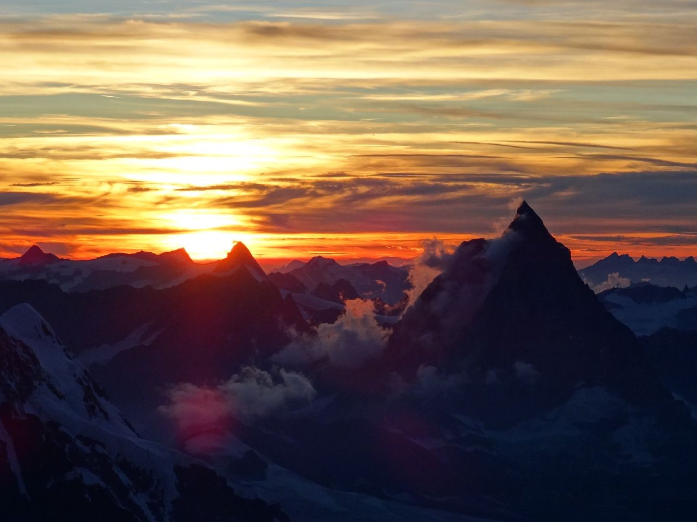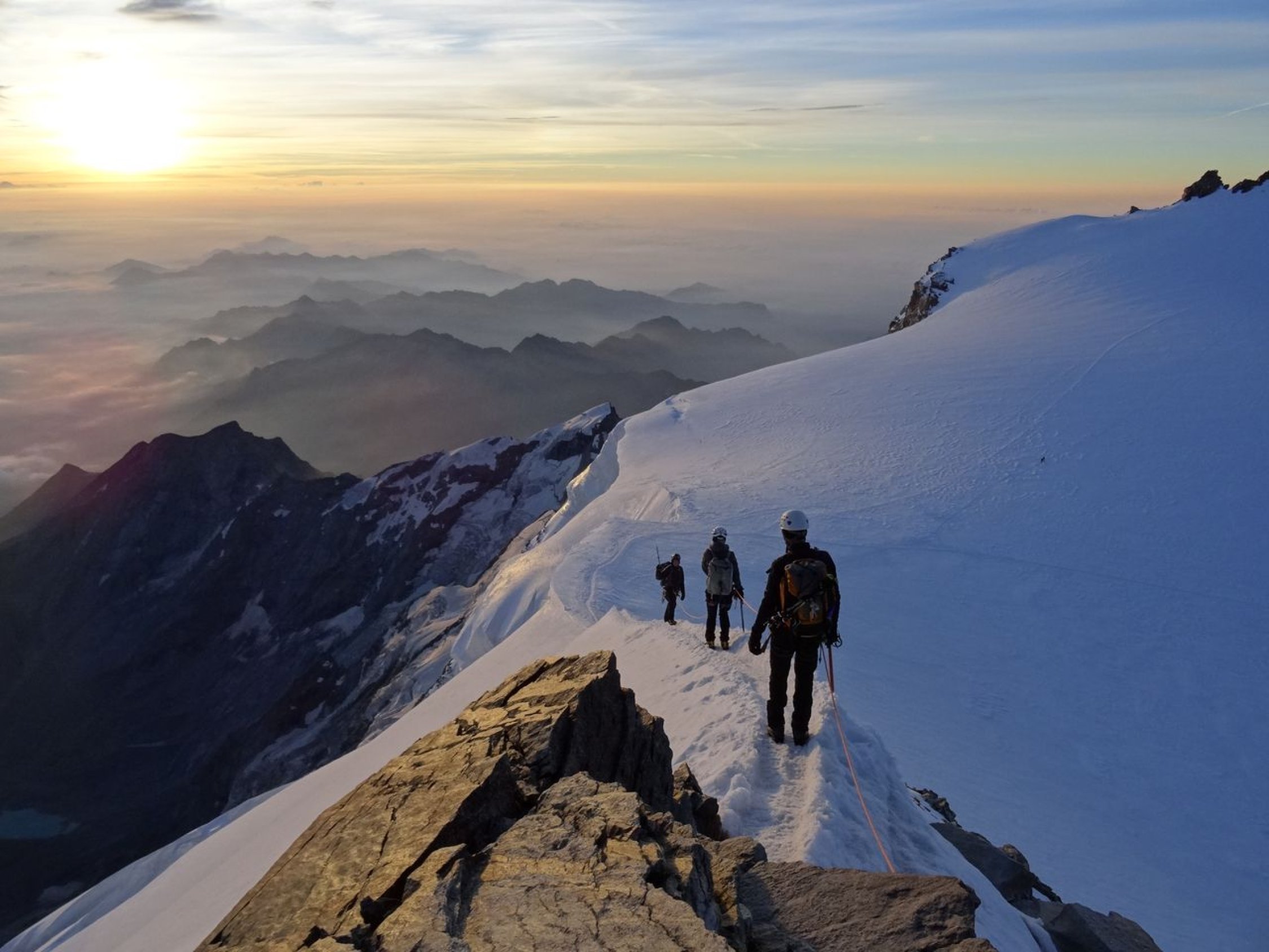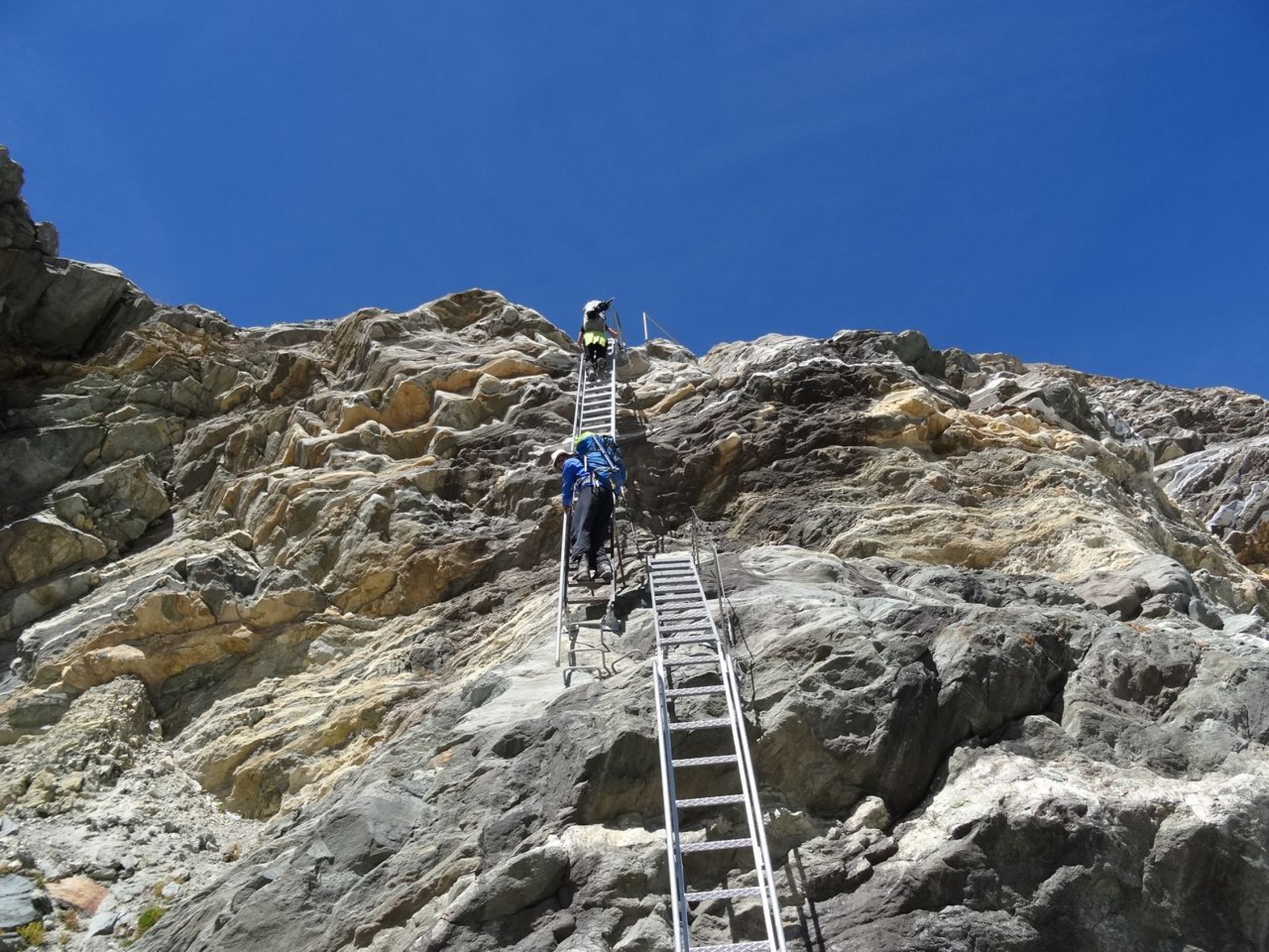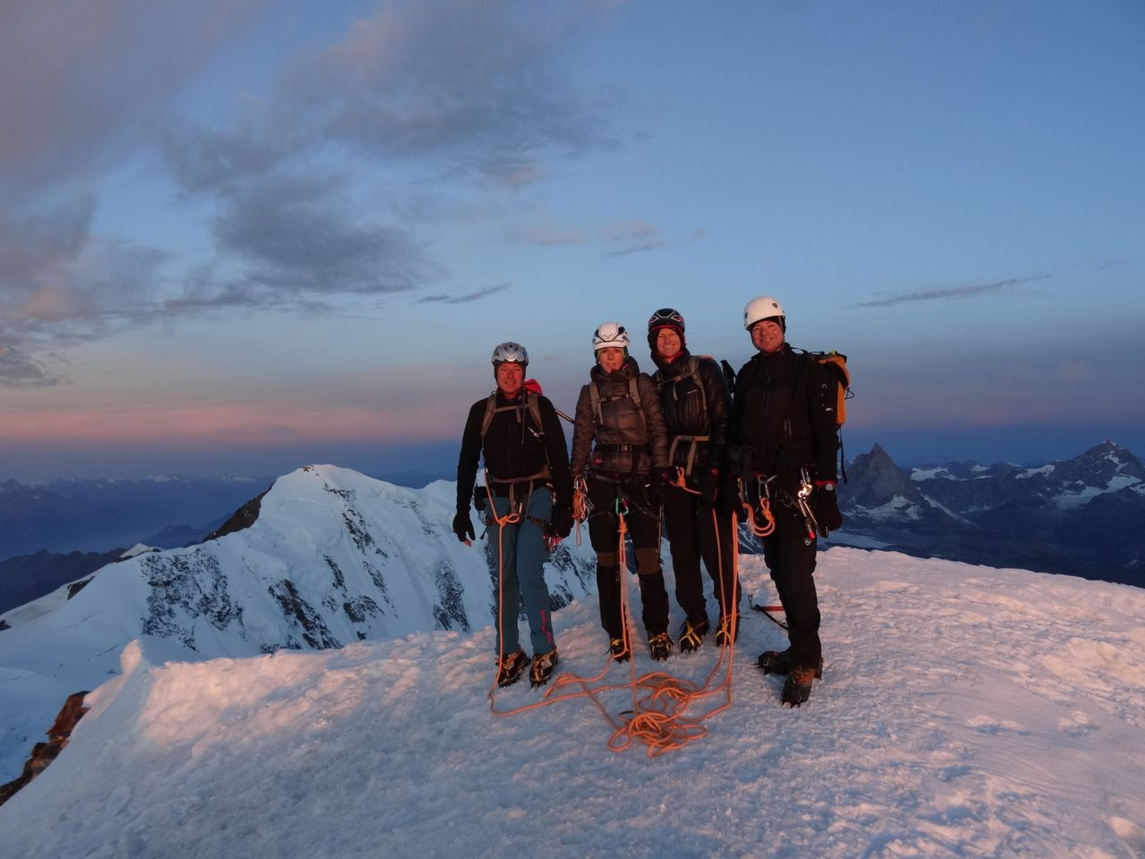 Übergang von der Quintino Sella-Hütte zur Regina Margherita-Hütte via Il Naso (nachdem mein Bruder und ich im Vorjahr über den Liskamm gingen). Dabei sind wir noch auf die Piramide Vincent und Felsinsel Balmenhorn aufgestiegen. Zwei von uns sind zusätzlich noch auf das Schwarzhorn, die Ludwigshöhe und die Parrotspitze gegangen (was mein Bruder und ich bereits letztes Jahr erledigten). Mit der Erreichung der Hütte ist auch die Signalkuppe erklommen. Es herrschten beste Verhältnisse. Bei der Überschreitung von Il Naso gab es in den Steilpassagen (NW- und SO-seitig) Eis und es musste entsprechend gesichert werden.