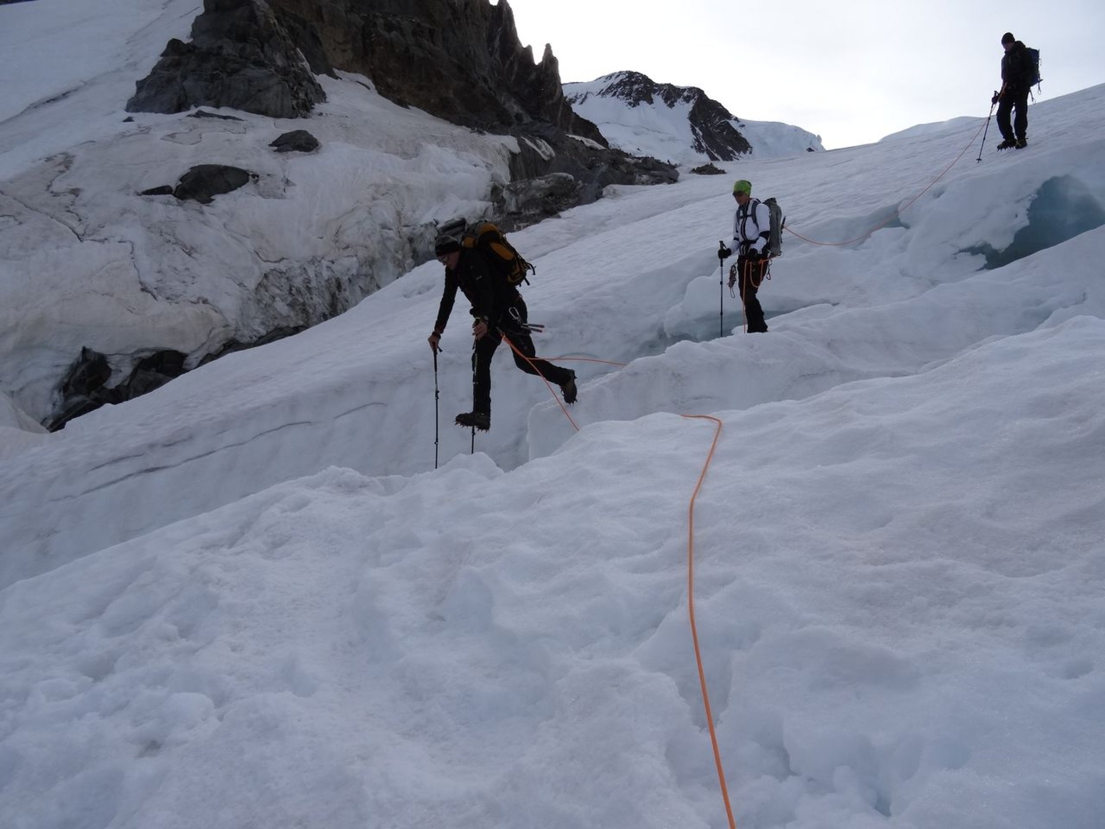 Statt dessen stiegen wir über den Grenzgletscher zur Monte Rosa-Hütte ab. Es war eine ganz neue Erfahrung, mit dem Spaltengewirr zurecht zu kommen. Dank ausgeprägter Spur war die Orientierung jedoch gut möglich. Einmal musste wegen einer geschmolzenen Schneebrücke ein kleiner Umweg gemacht werden.
