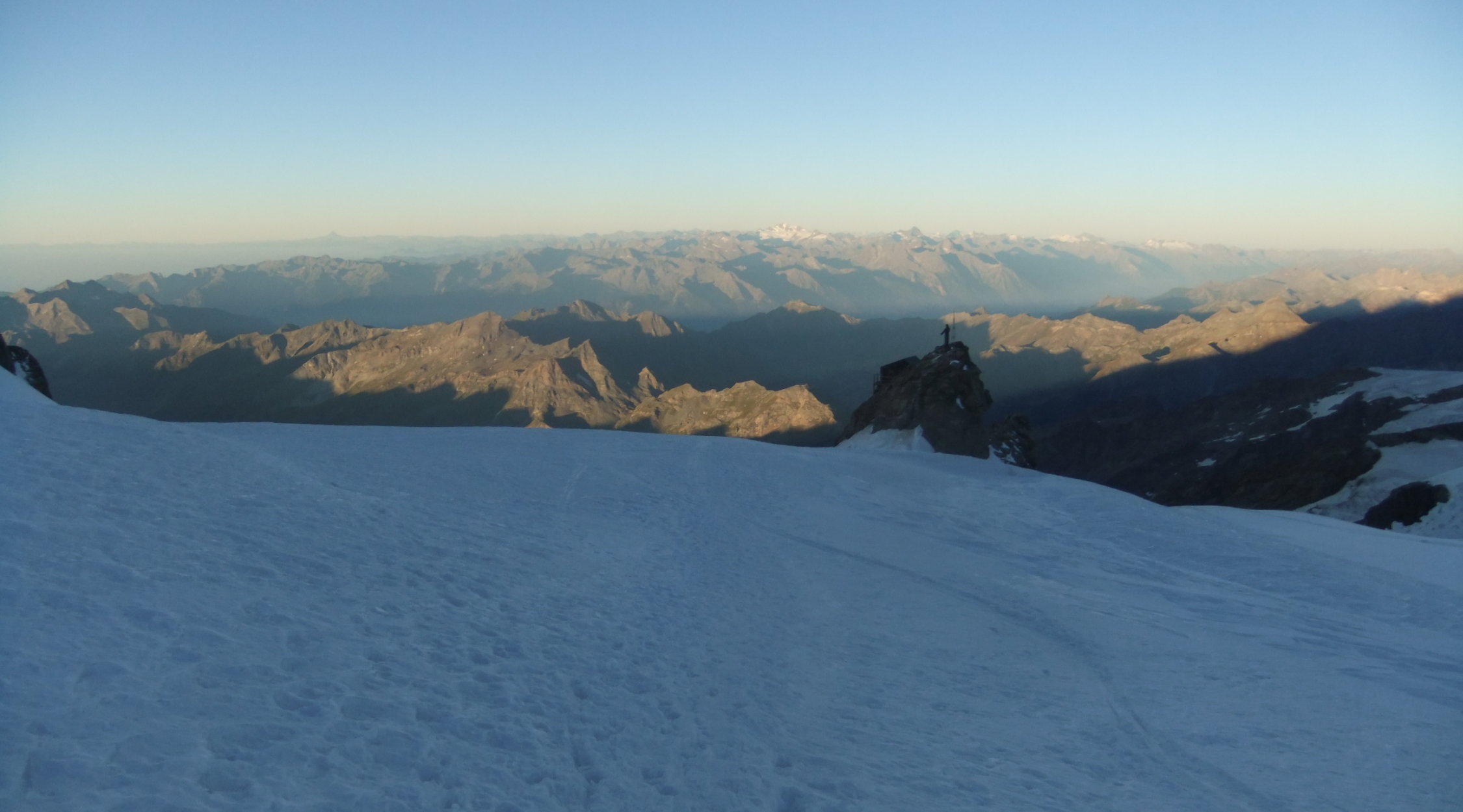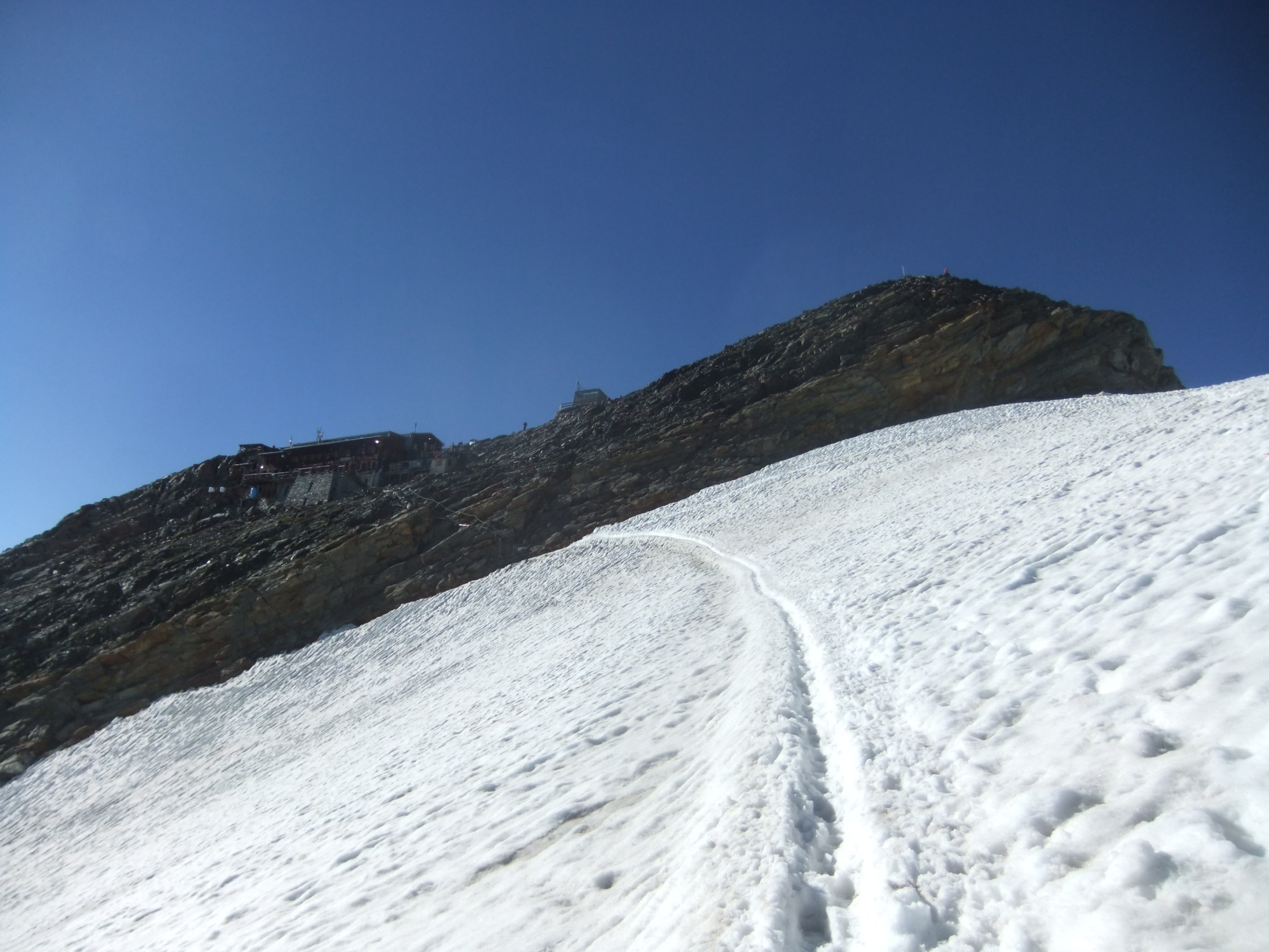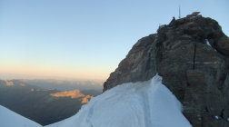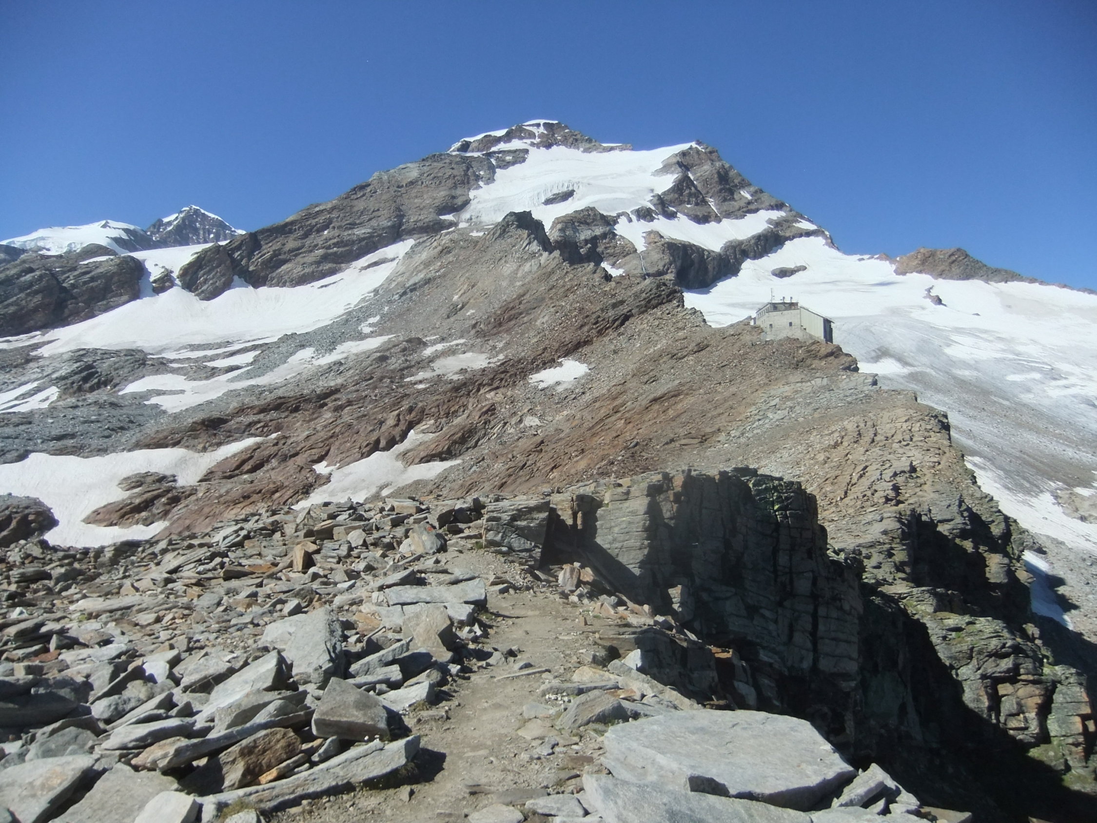 Da ich am Vortag viel Zeit hatte, um zur Hütte aufzufahren, verzichtete ich auf die Auffahrt mit der Gondelseilbahn zum Indren-Gletscher, sondern lief den alten Hüttenzustieg vom Passo dei Salati. Zum Punta Indren und querte von dort den Ghiacciaio d’Indren. Wer bei diesen Temperaturen nachmittags zur Capanna Gnifetti aufsteigt, kämpft auf dem Garstelet-Gletscher, diesen trockenen Fußes zu überwinden. Denn der Steig ist dann reinste Wasserrinne. Kollektiv denkende Berggänger benutzen ihren Pickel auch dafür, wenn sie dort entlang gehen, hangabwärts Ablaufrinnen frei zu hacken (!). Ansonsten versucht man besser etwas oberhalb der Spuren den Gletscher mit seinen Wasserbächen zu überwinden.
