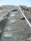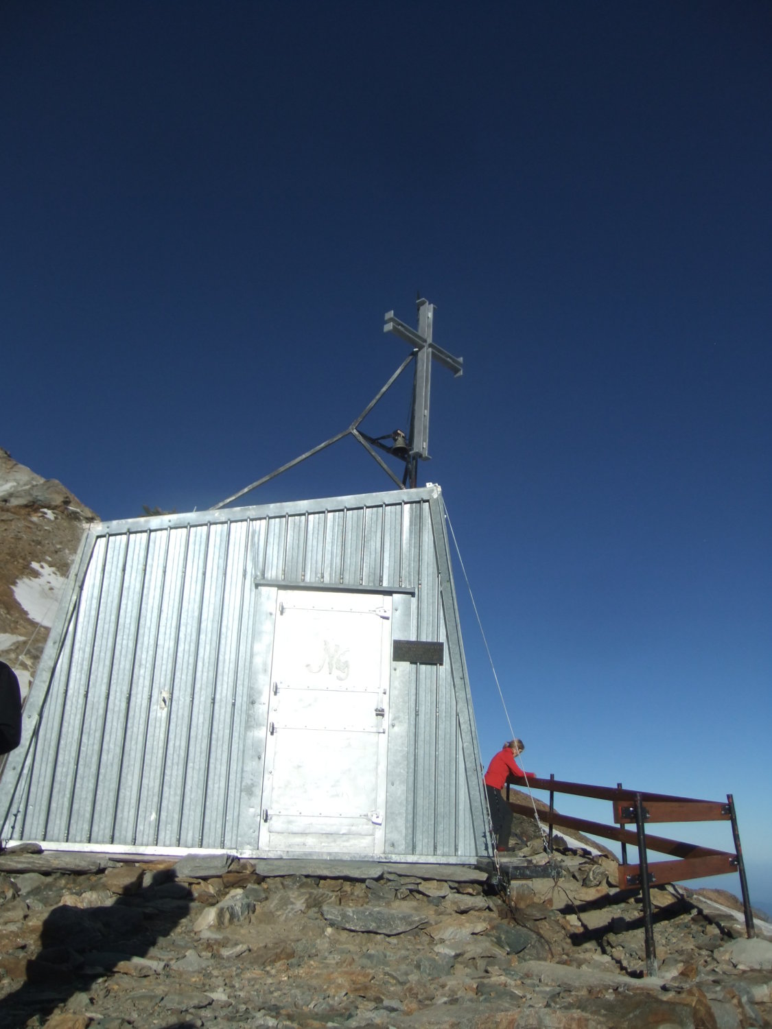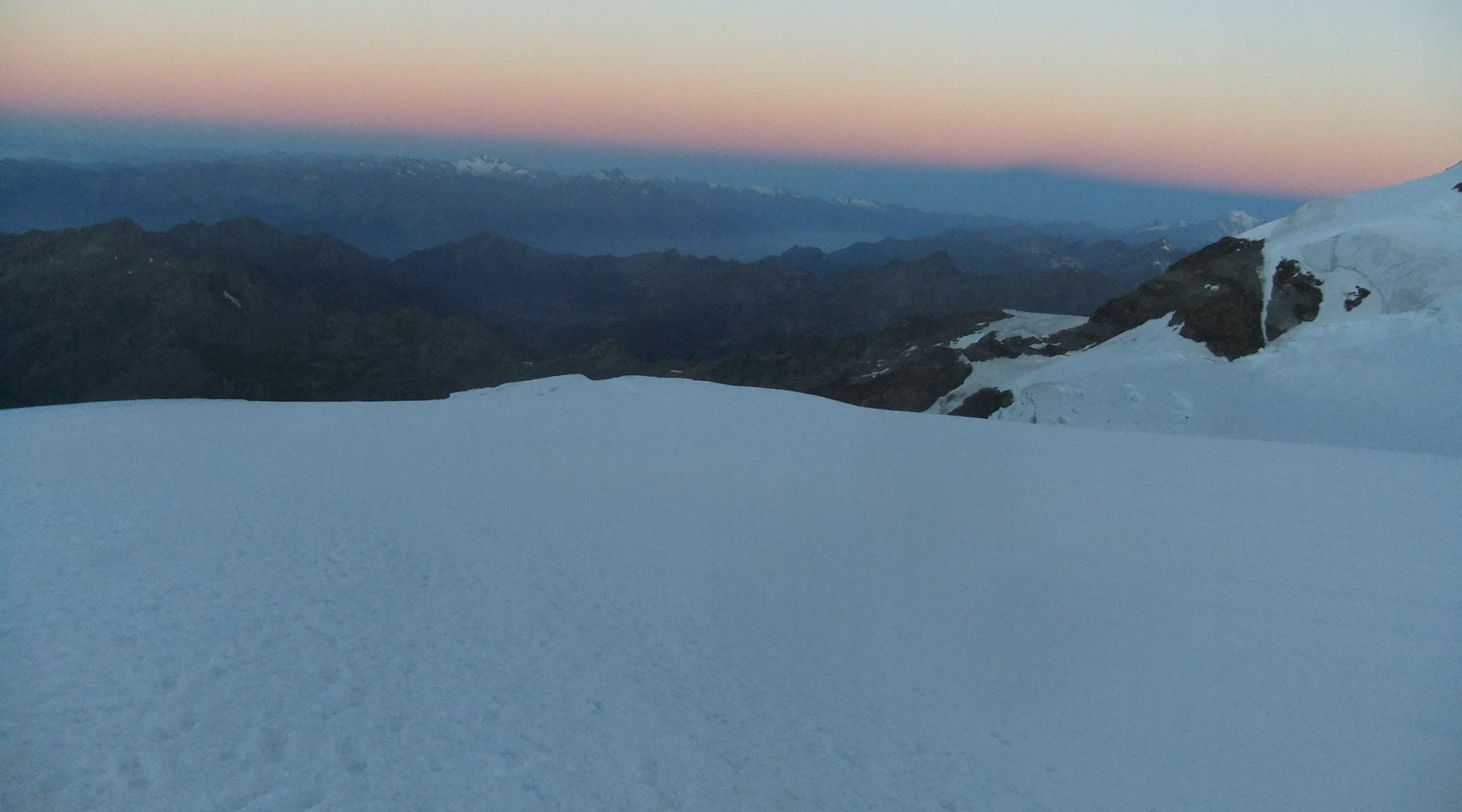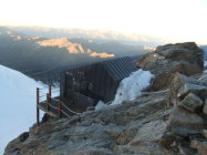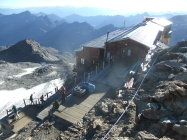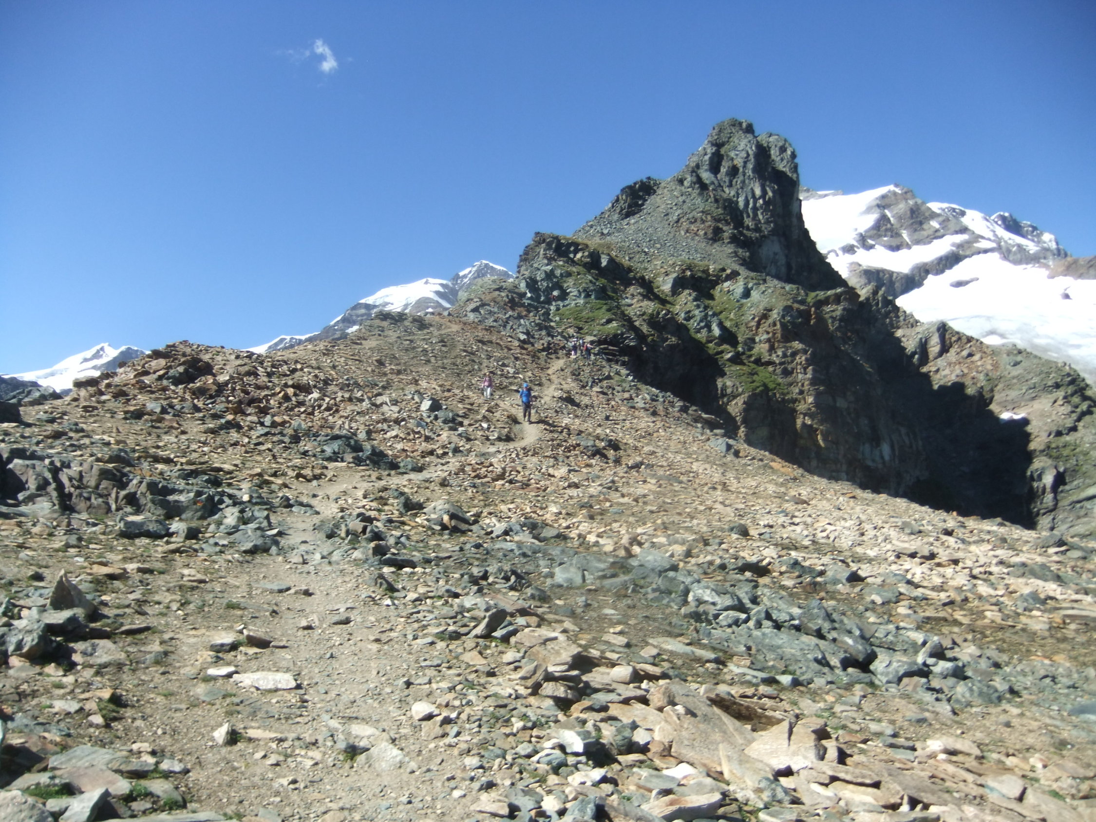Da ich am Vortag viel Zeit hatte, um zur Hütte aufzufahren, verzichtete ich auf die Auffahrt mit der Gondelseilbahn zum Indren-Gletscher, sondern lief den alten Hüttenzustieg vom Passo dei Salati. Zum Punta Indren und querte von dort den Ghiacciaio d’Indren. Wer bei diesen Temperaturen nachmittags zur Capanna Gnifetti aufsteigt, kämpft auf dem Garstelet-Gletscher, diesen trockenen Fußes zu überwinden. Denn der Steig ist dann reinste Wasserrinne. Kollektiv denkende Berggänger benutzen ihren Pickel auch dafür, wenn sie dort entlang gehen, hangabwärts Ablaufrinnen frei zu hacken (!). Ansonsten versucht man besser etwas oberhalb der Spuren den Gletscher mit seinen Wasserbächen zu überwinden.
