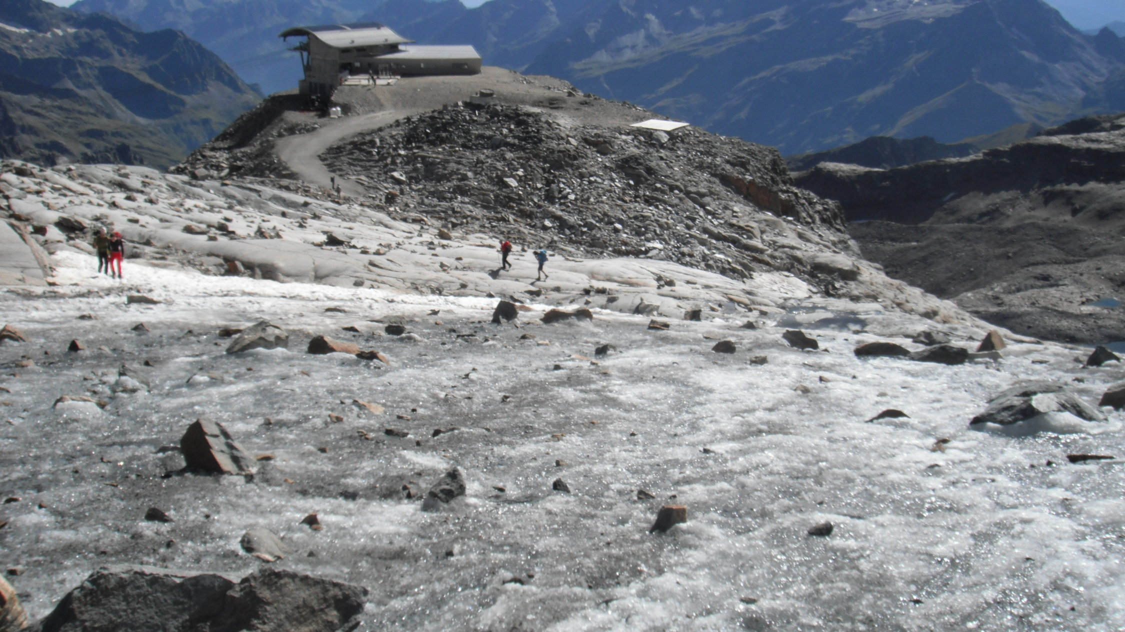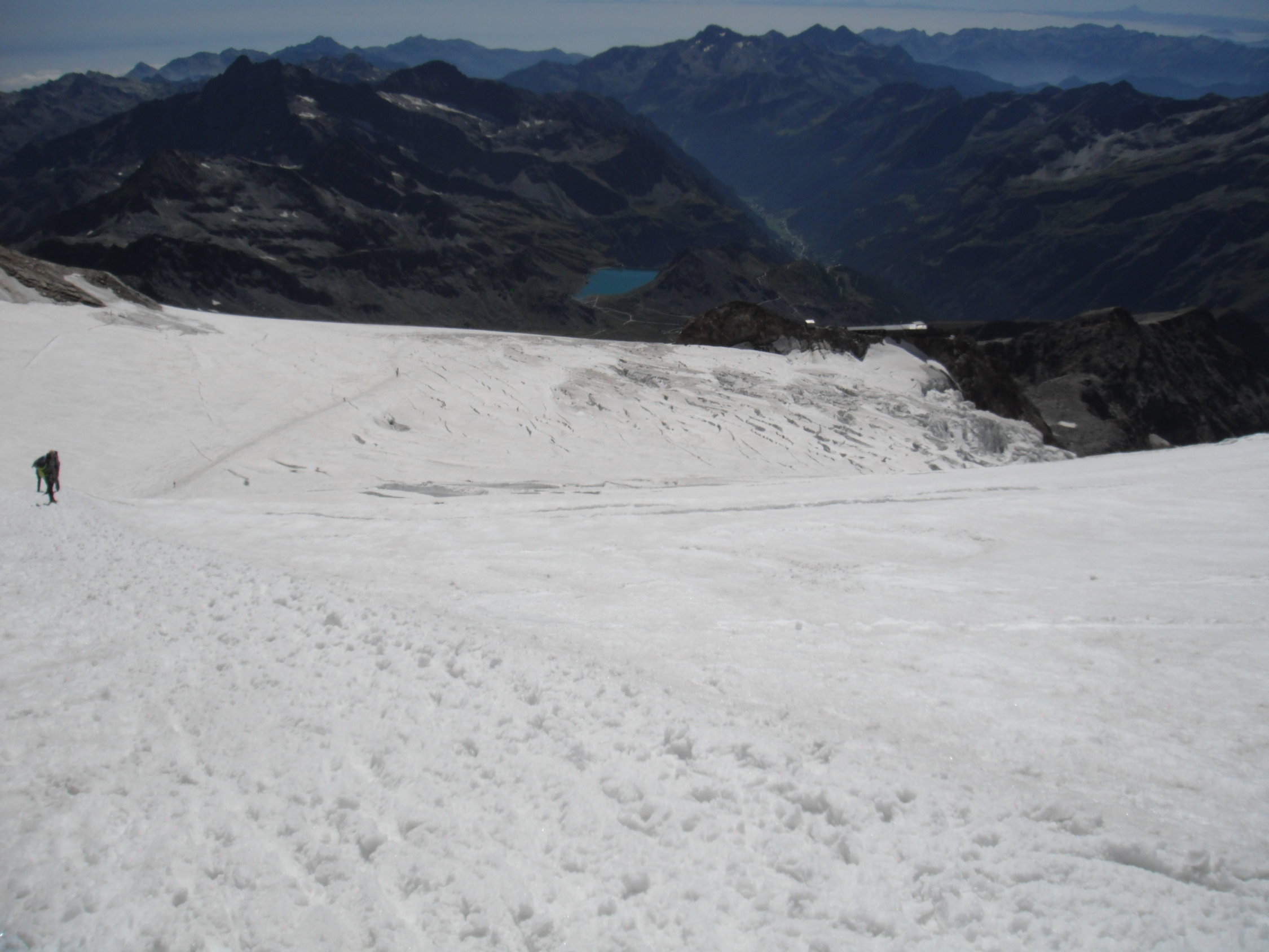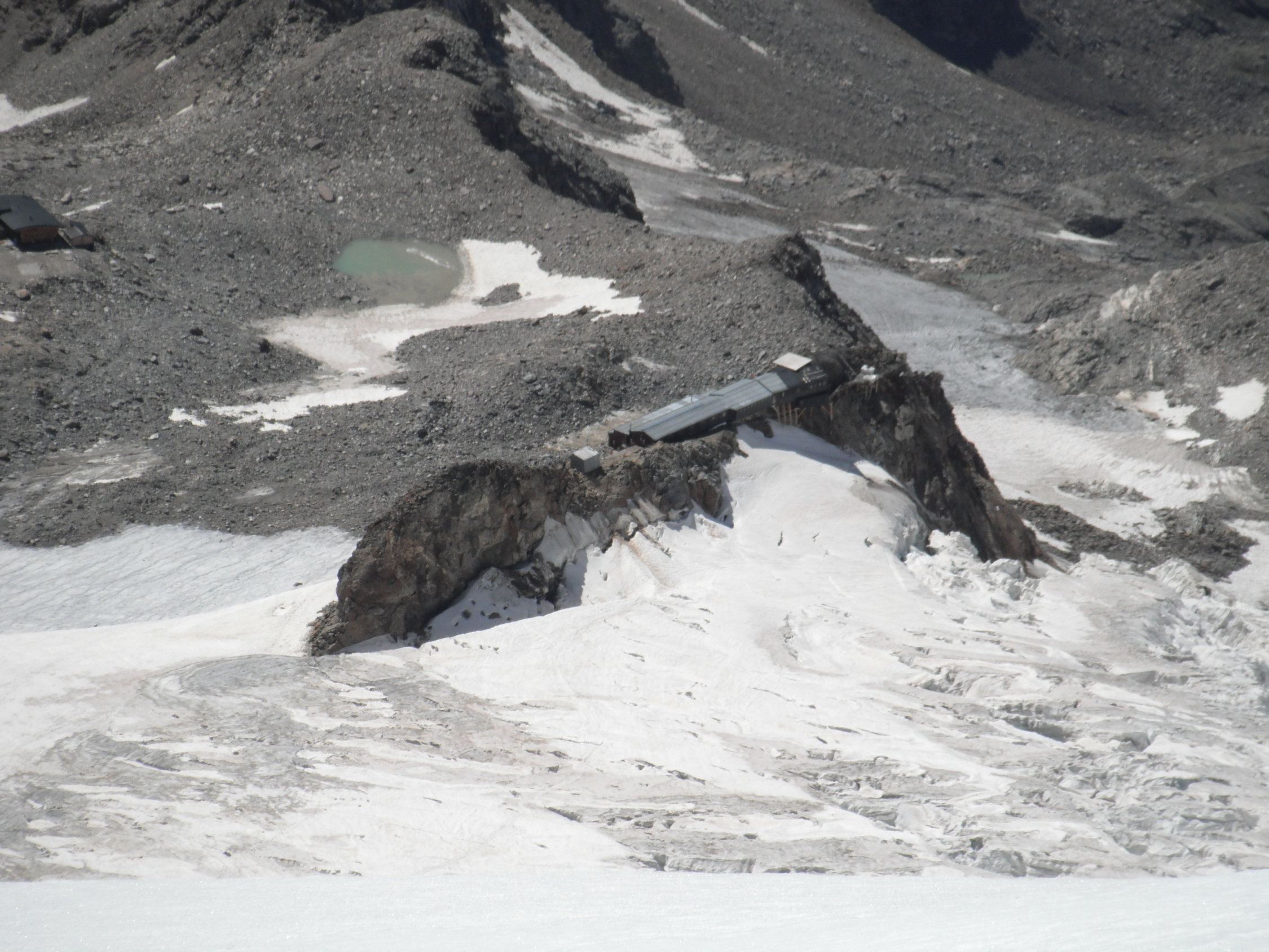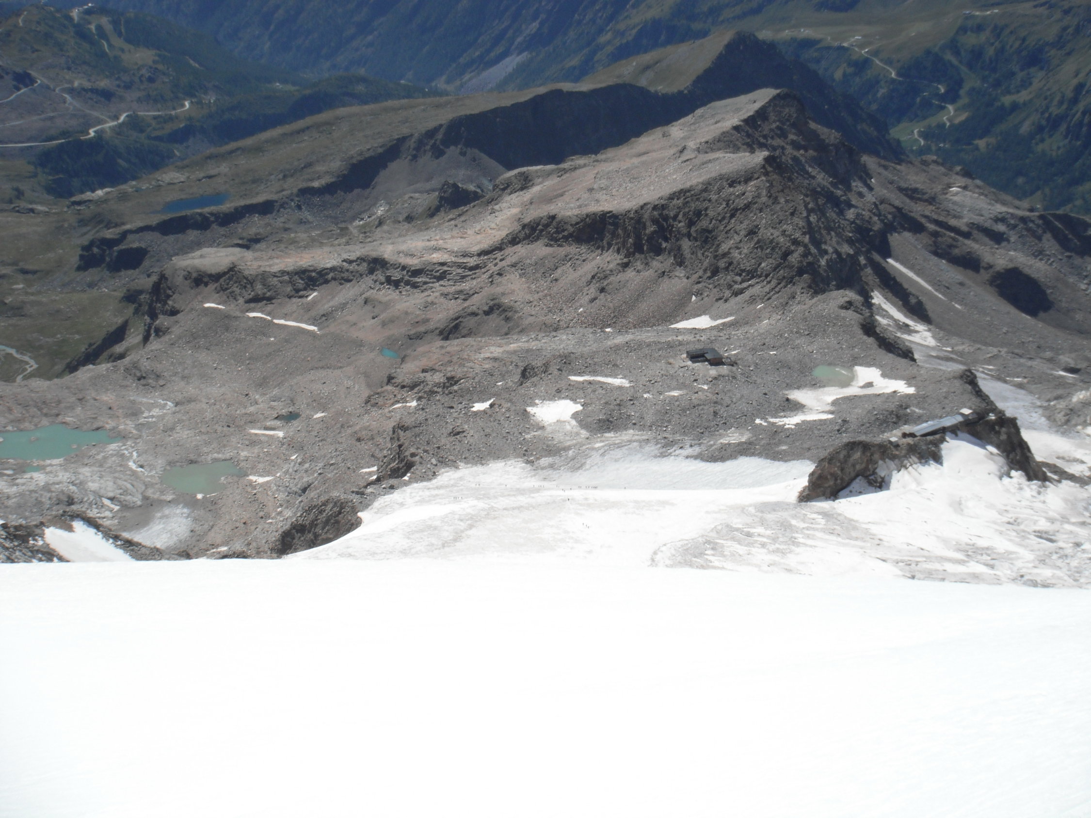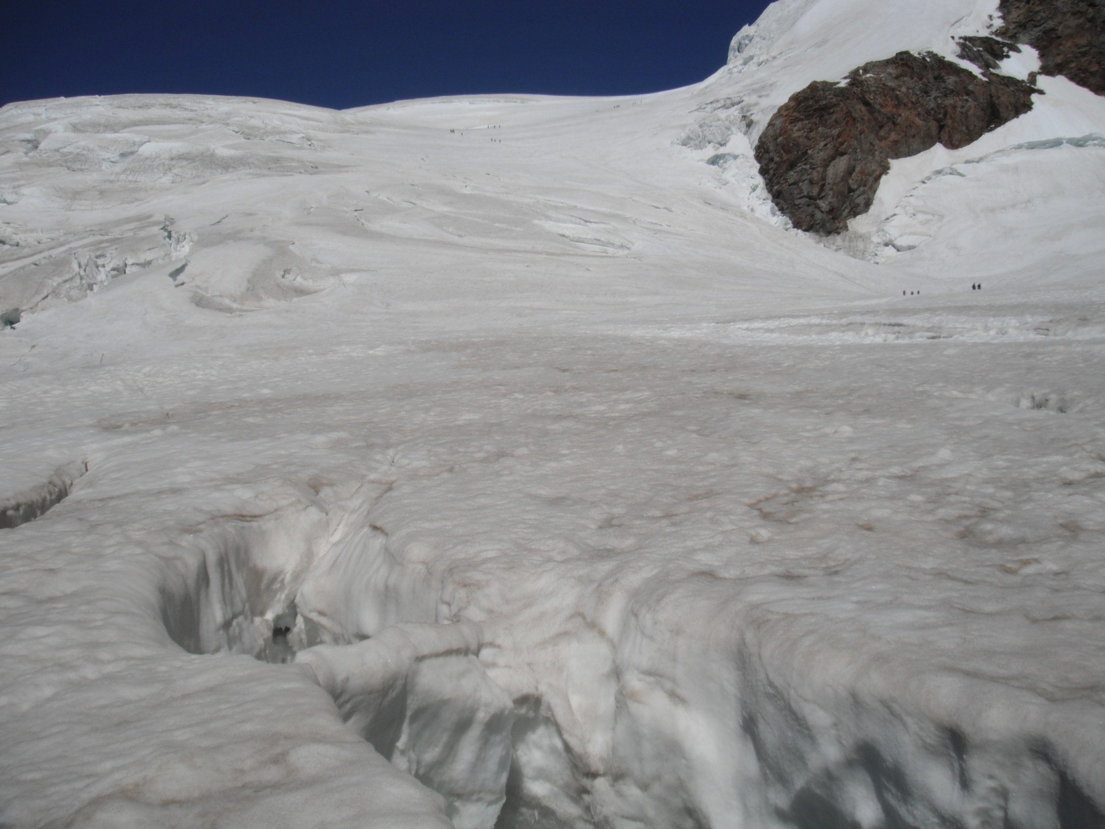 Da ich am Vortag viel Zeit hatte, um zur Hütte aufzufahren, verzichtete ich auf die Auffahrt mit der Gondelseilbahn zum Indren-Gletscher, sondern lief den alten Hüttenzustieg vom Passo dei Salati. Zum Punta Indren und querte von dort den Ghiacciaio d’Indren. Wer bei diesen Temperaturen nachmittags zur Capanna Gnifetti aufsteigt, kämpft auf dem Garstelet-Gletscher, diesen trockenen Fußes zu überwinden. Denn der Steig ist dann reinste Wasserrinne. Kollektiv denkende Berggänger benutzen ihren Pickel auch dafür, wenn sie dort entlang gehen, hangabwärts Ablaufrinnen frei zu hacken (!). Ansonsten versucht man besser etwas oberhalb der Spuren den Gletscher mit seinen Wasserbächen zu überwinden.