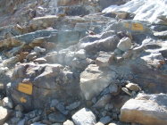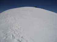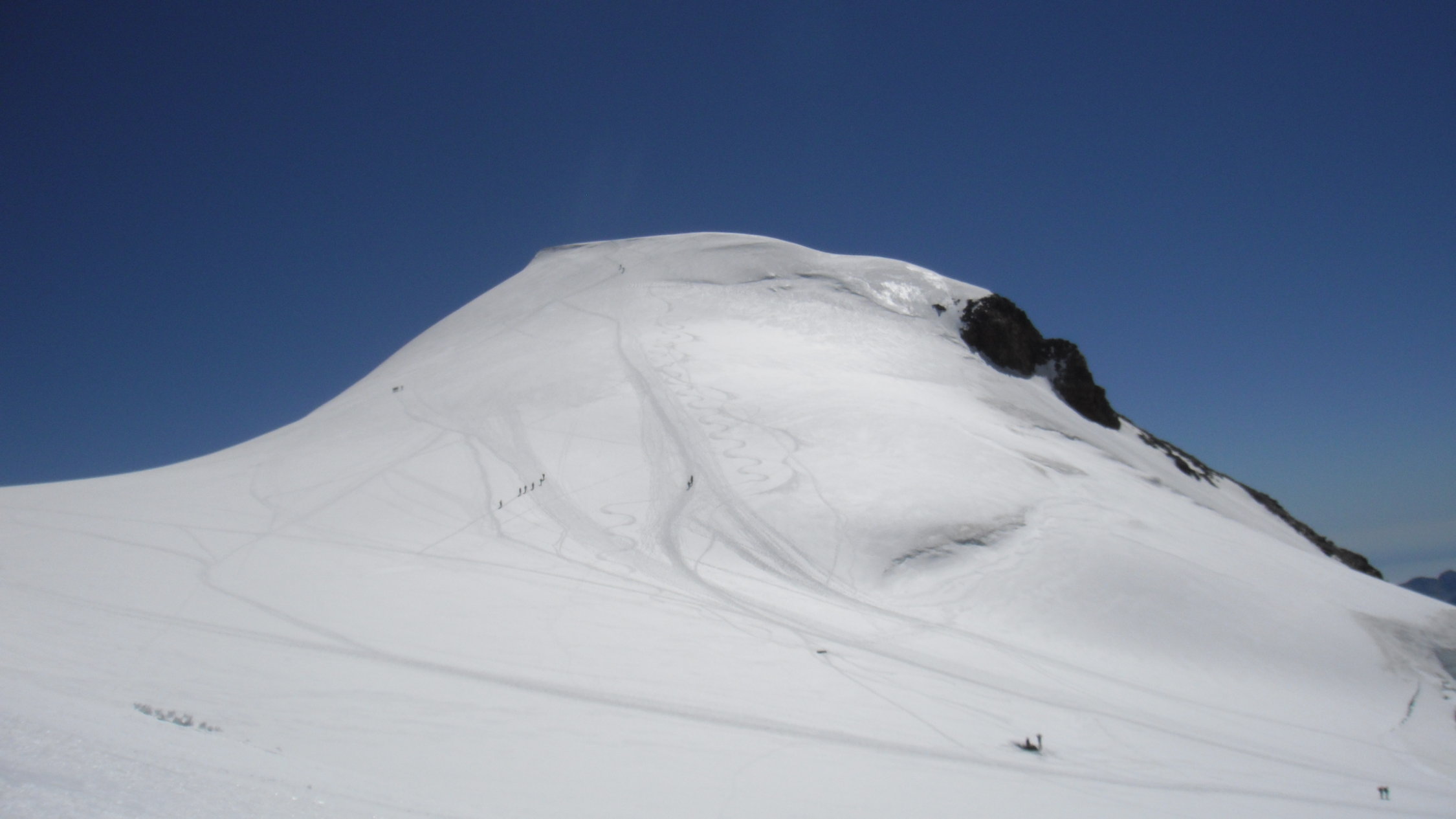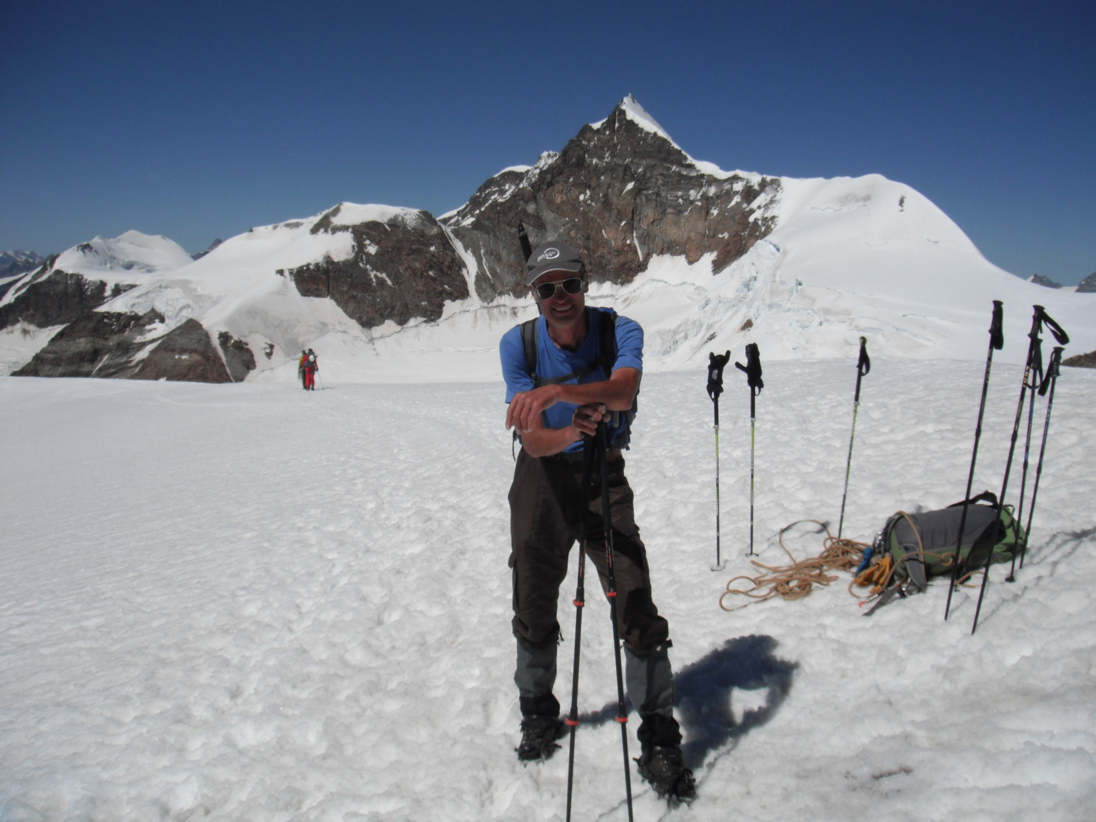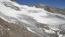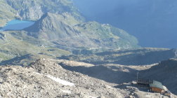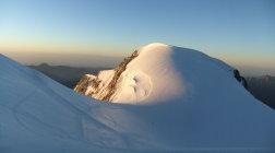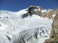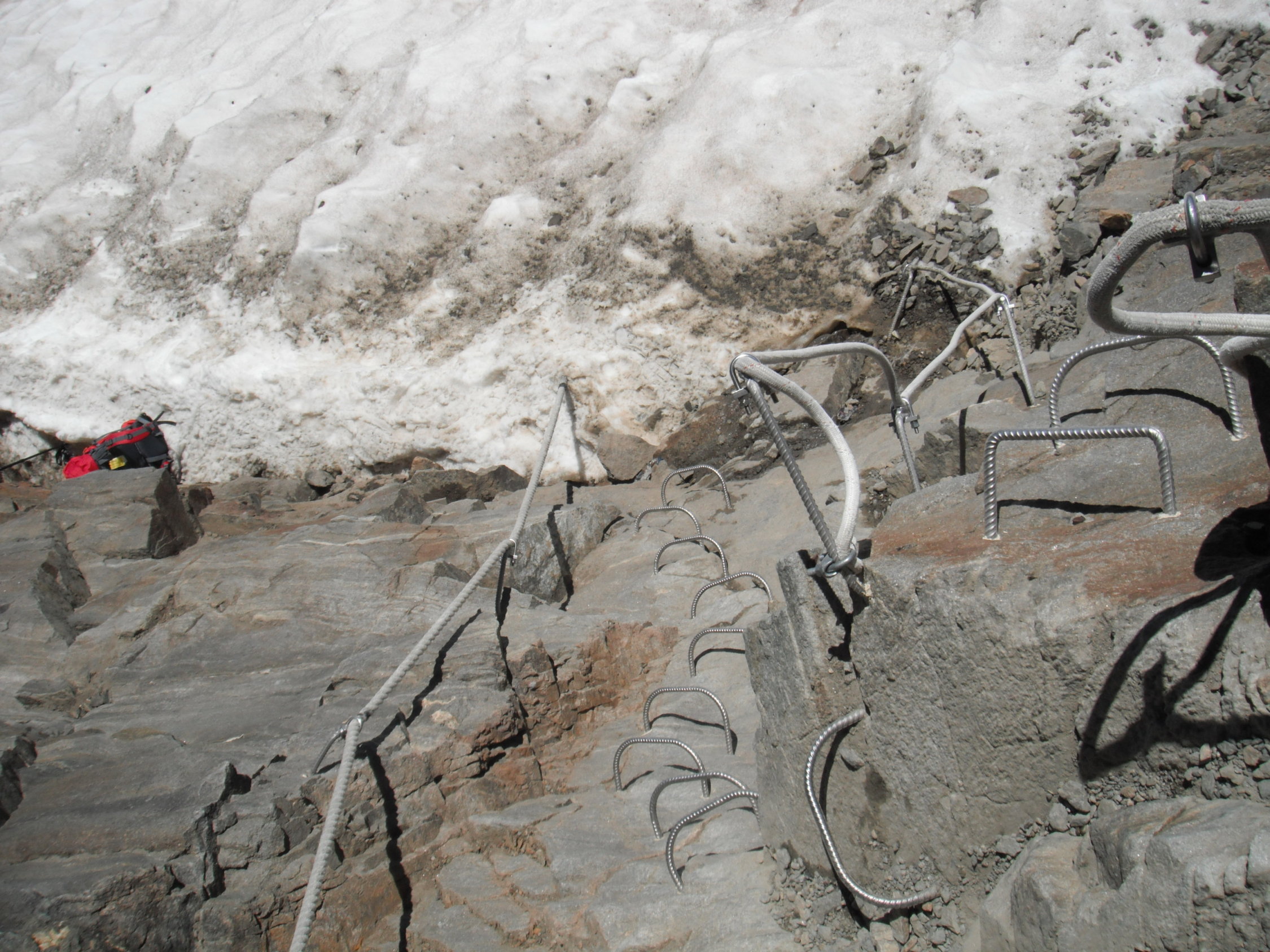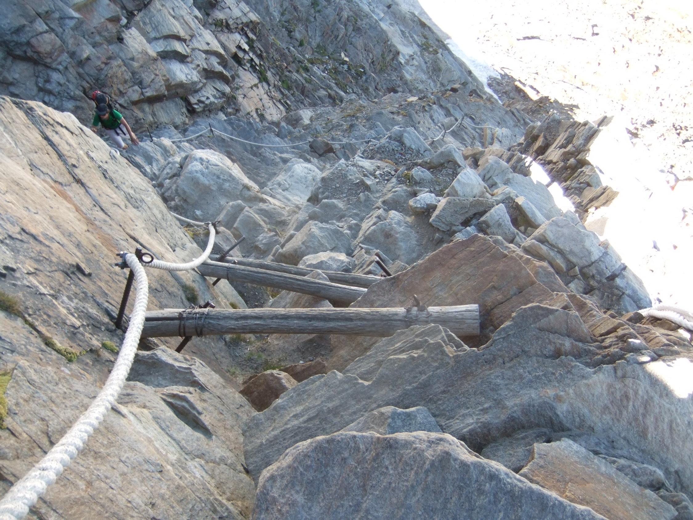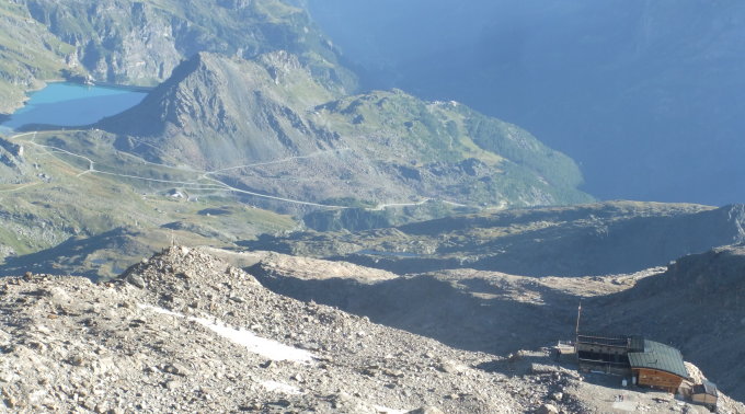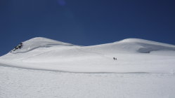 Da ich am Vortag viel Zeit hatte, um zur Hütte aufzufahren, verzichtete ich auf die Auffahrt mit der Gondelseilbahn zum Indren-Gletscher, sondern lief den alten Hüttenzustieg vom Passo dei Salati. Zum Punta Indren und querte von dort den Ghiacciaio d’Indren. Wer bei diesen Temperaturen nachmittags zur Capanna Gnifetti aufsteigt, kämpft auf dem Garstelet-Gletscher, diesen trockenen Fußes zu überwinden. Denn der Steig ist dann reinste Wasserrinne. Kollektiv denkende Berggänger benutzen ihren Pickel auch dafür, wenn sie dort entlang gehen, hangabwärts Ablaufrinnen frei zu hacken (!). Ansonsten versucht man besser etwas oberhalb der Spuren den Gletscher mit seinen Wasserbächen zu überwinden.