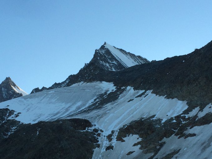 Gute Verhältnisse. Obwohl vom Tal aus die Reste des Schneefalls vom 4-5. September noch gut sichtbar waren, war der Fels auf der Route trocken und perfekt zum Klettern. Steigeisen erst auf 4150 müM angezogen. Am Firngrat zum Gipfel wird der Schnee langsam knapp, aber noch gut begehbar, auch ohne Eisschrauben zu setzen. Zuletzt in die Felsen ausgewichen.