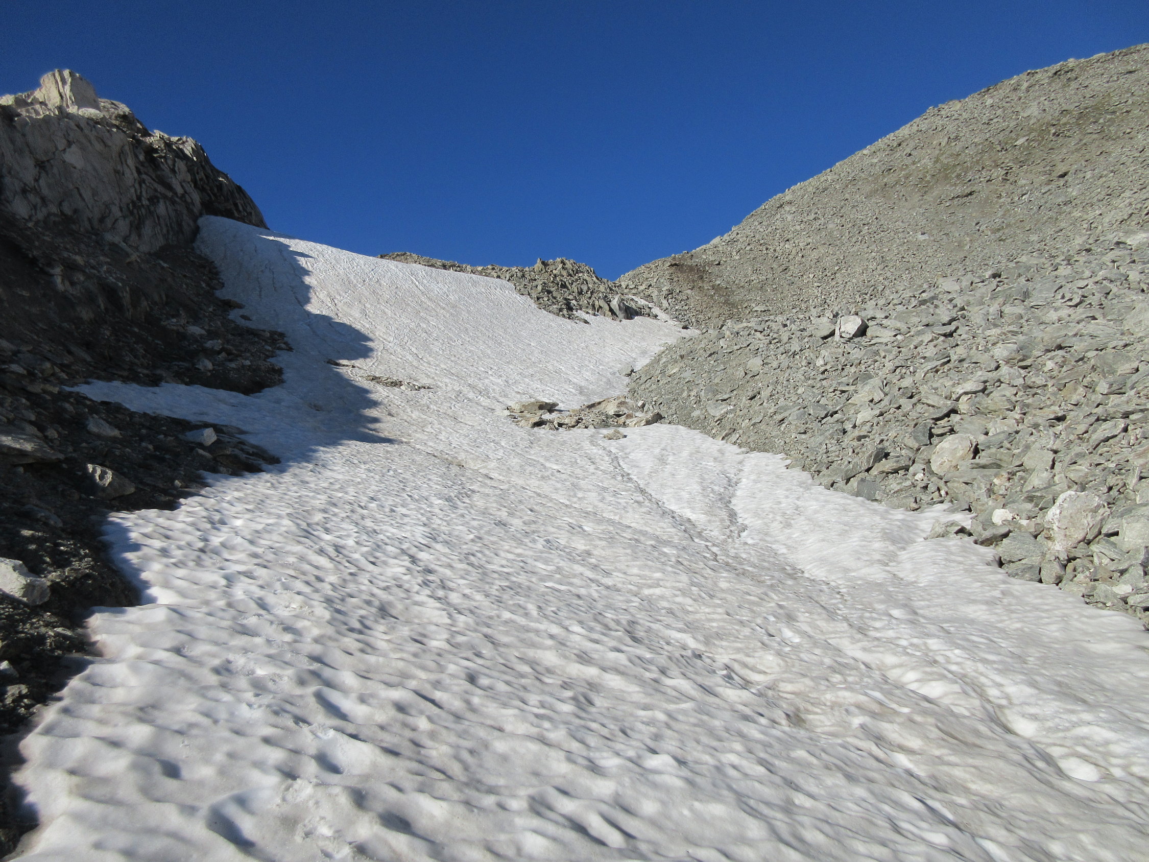 Beim Abstieg Markierungen auch unklar, selber Weg gesucht via kleinem Firnfeld und in weitem Linksbogen wieder zum Parkplatz bei P. 2427 (ca. 1 km vor der Passhöhe, auf der Urnerseite).