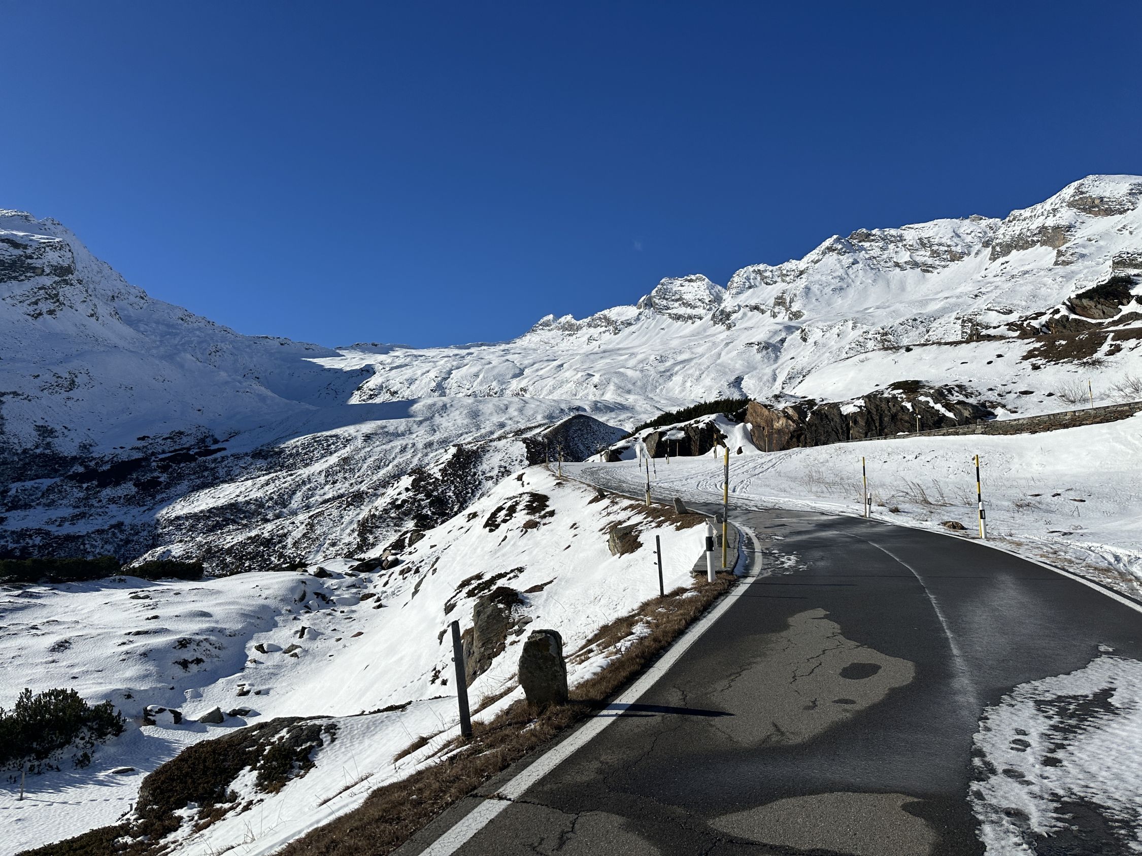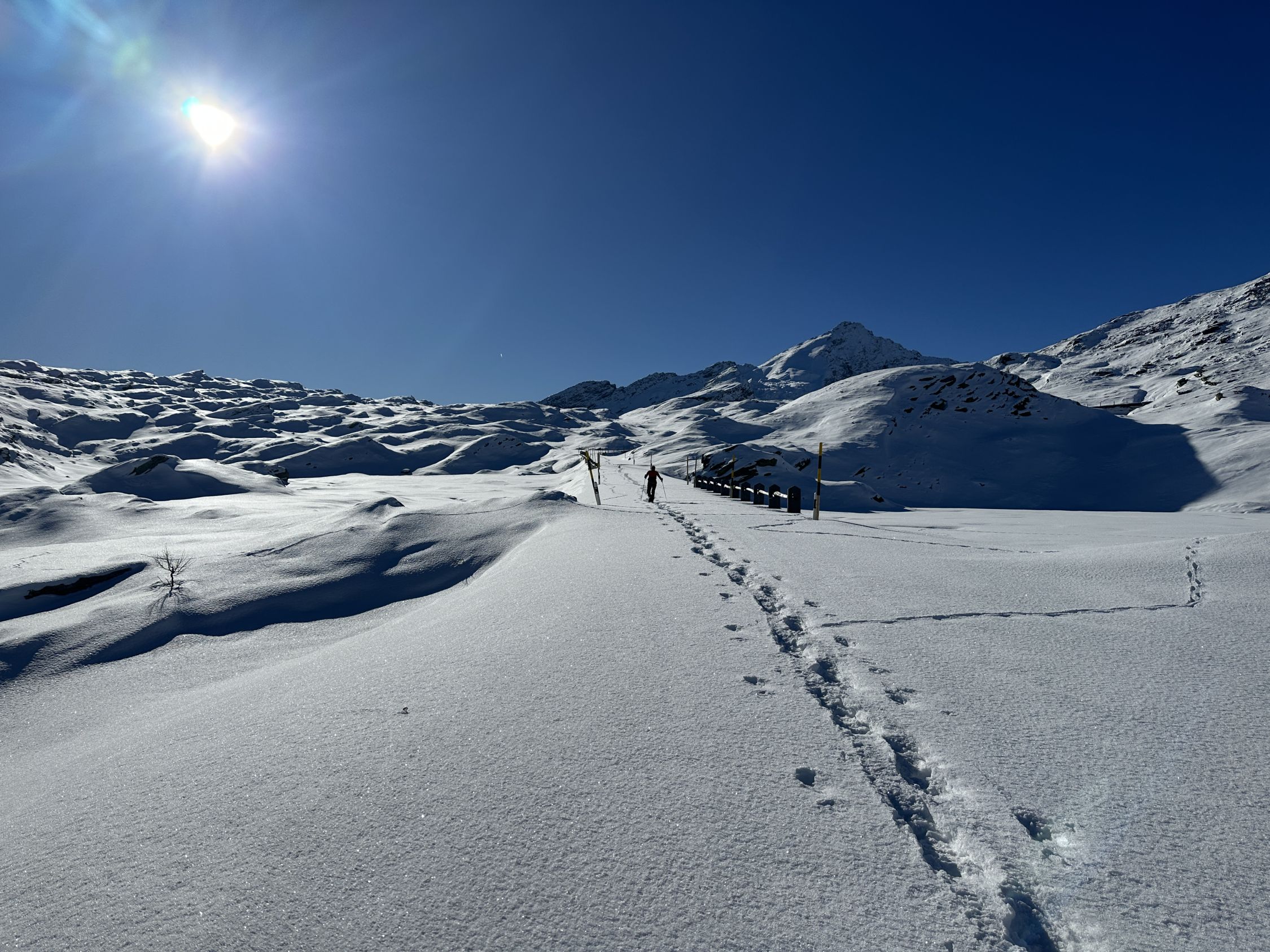 Nordseitig winterlich, Schneeschuhe wären hilfreich, südseitig sind wir der Passstrasse entlang gewandert, wenig Schnee, Strasse teilweise aper.