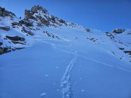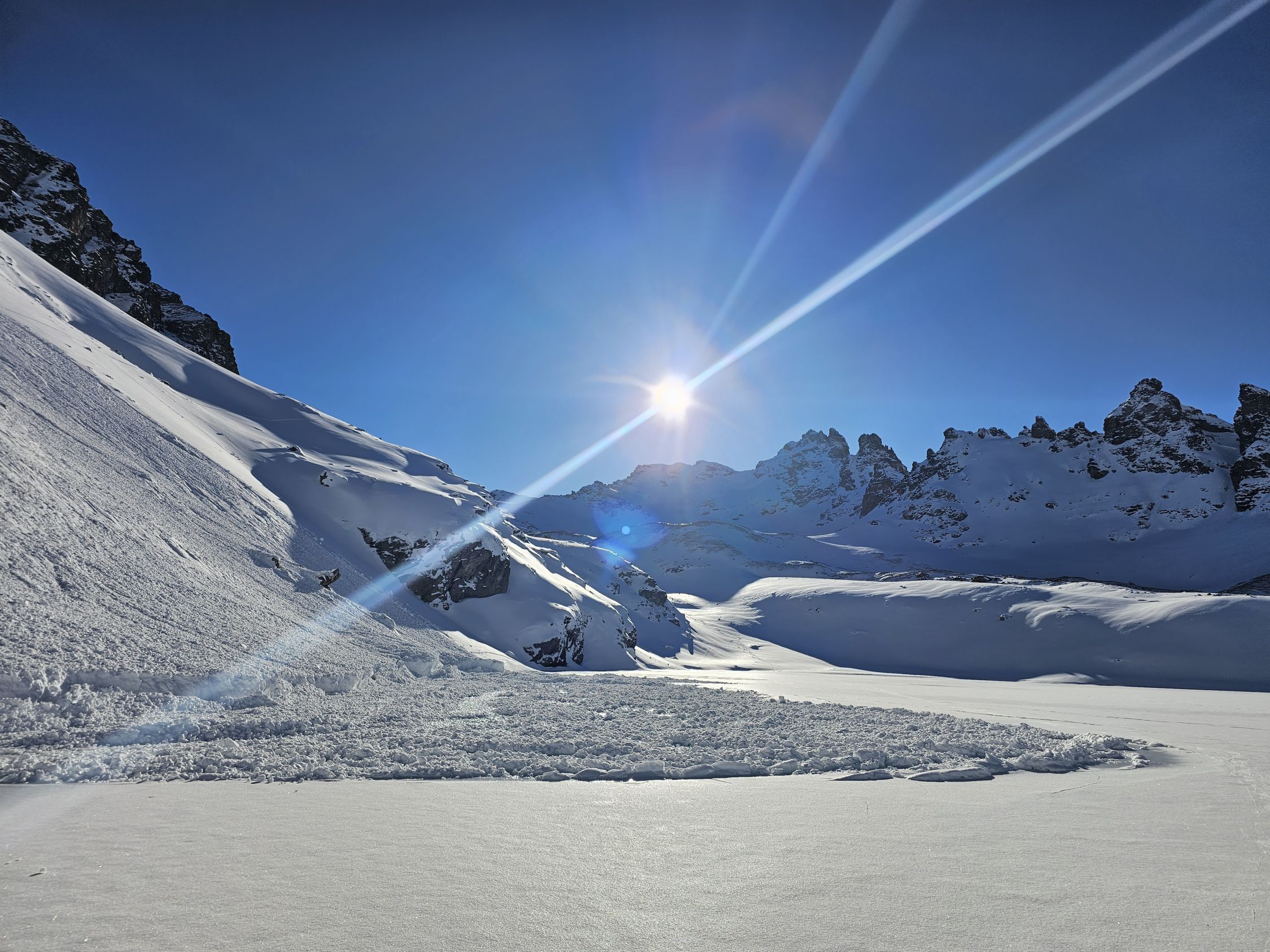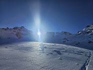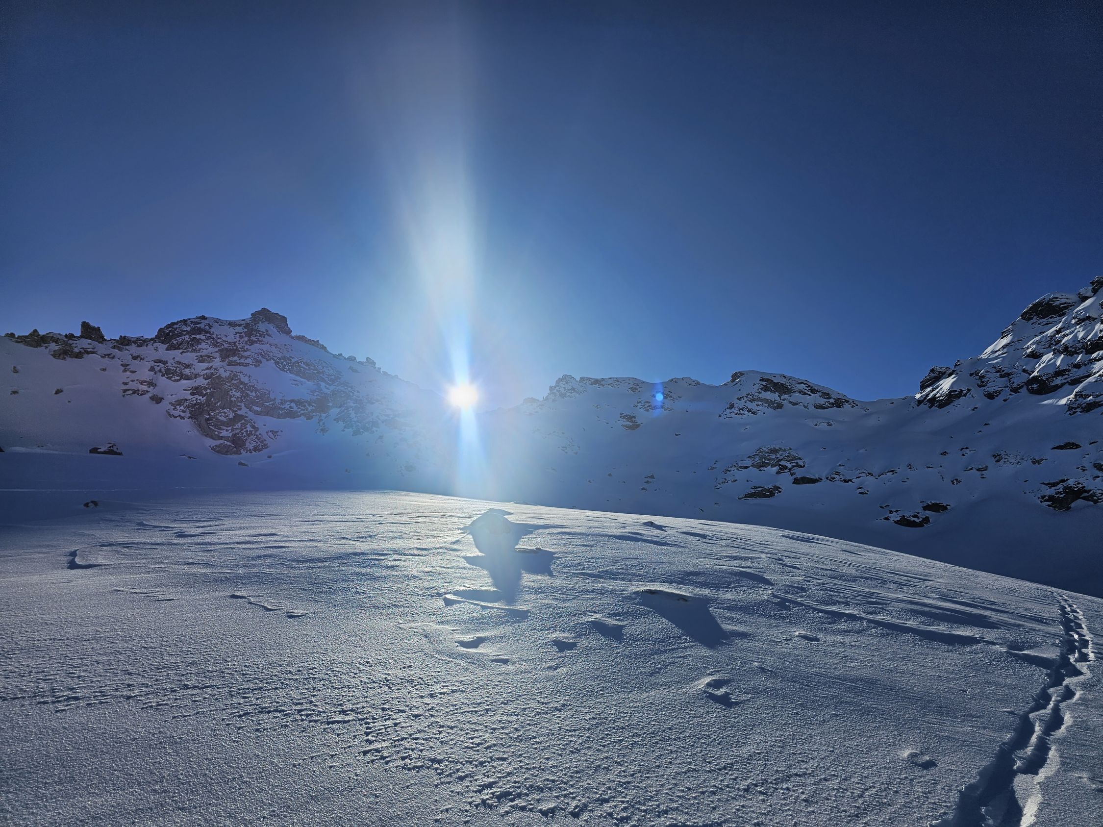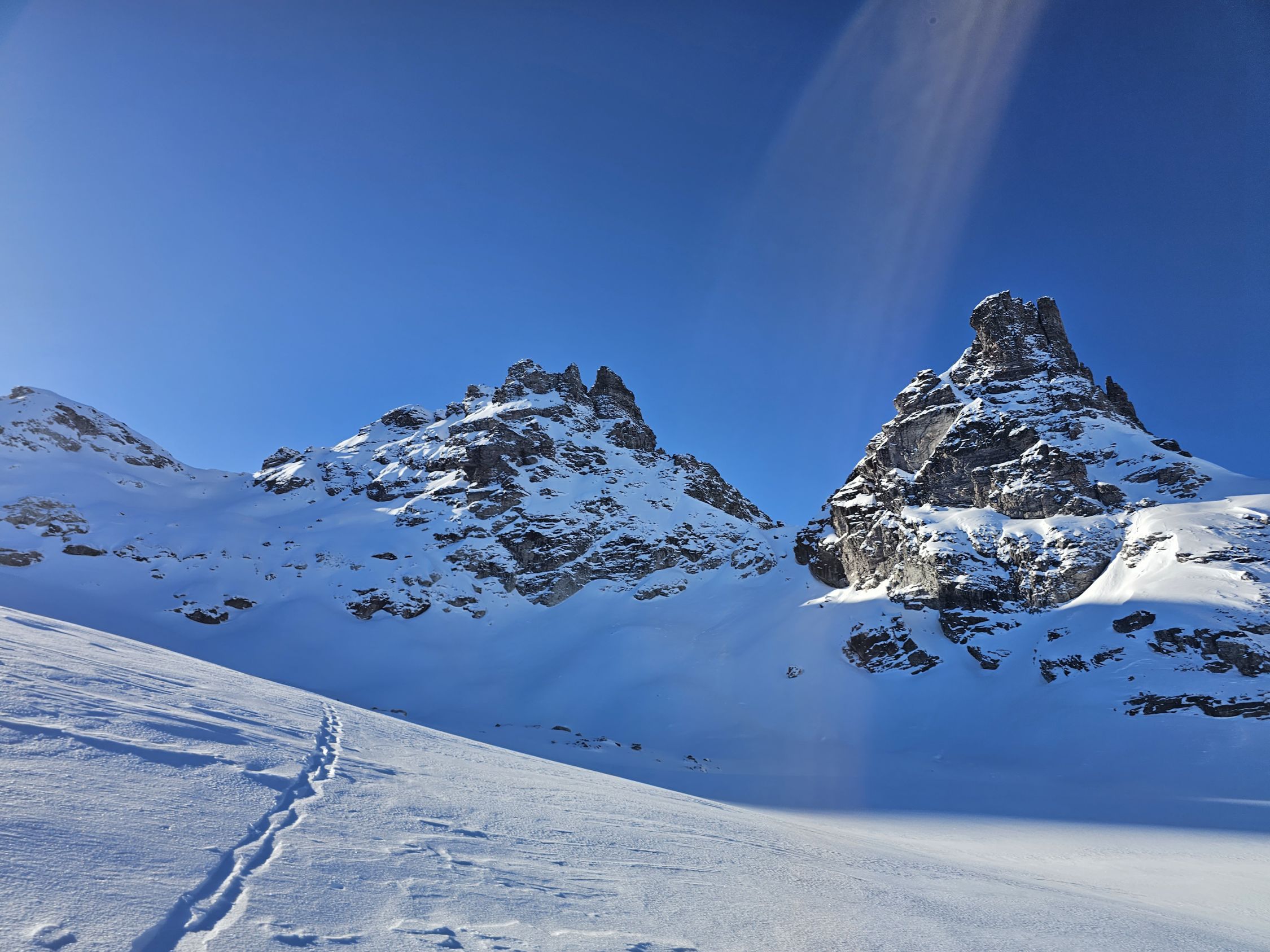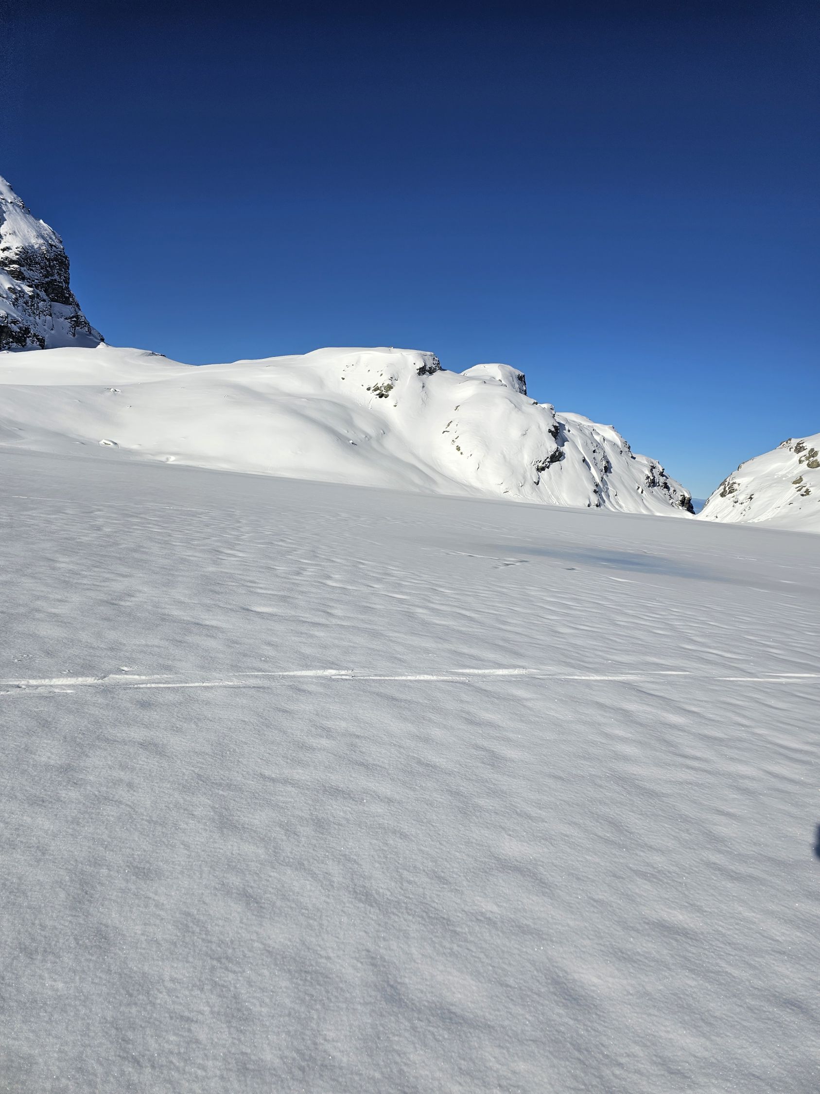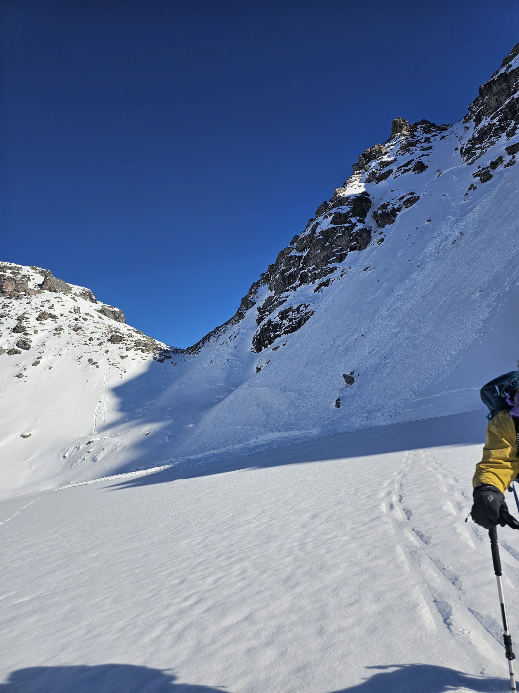 Wir sind nur bis zum Skidepot aufgestiegen, Gipfelgrat war noch nicht gespurt, aber es kam noch eine andere zweier Gruppe nach uns. Im Bereich des Skidepots, eher etwas heikler als das Bulletin, oberste schicht reisst....