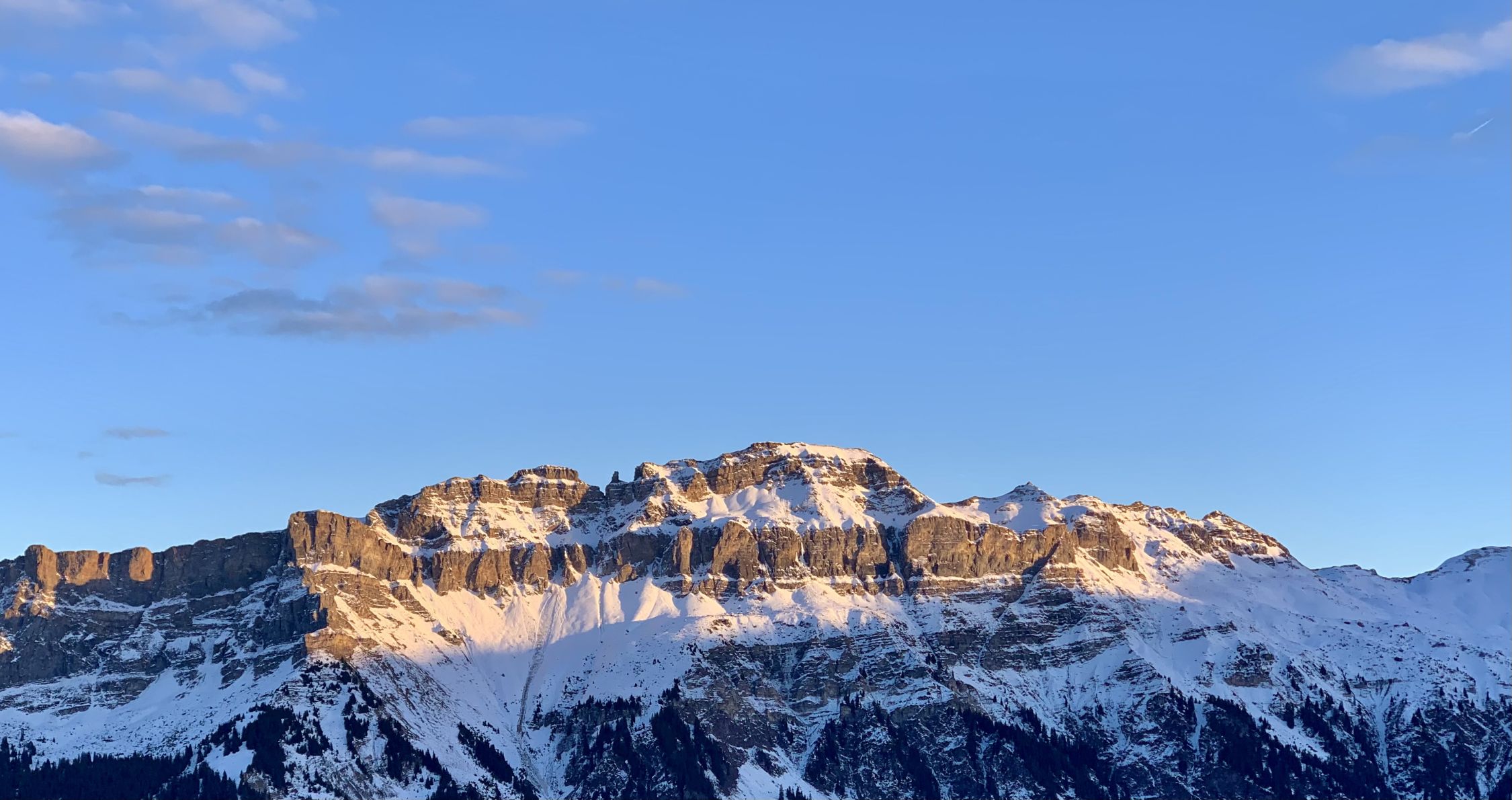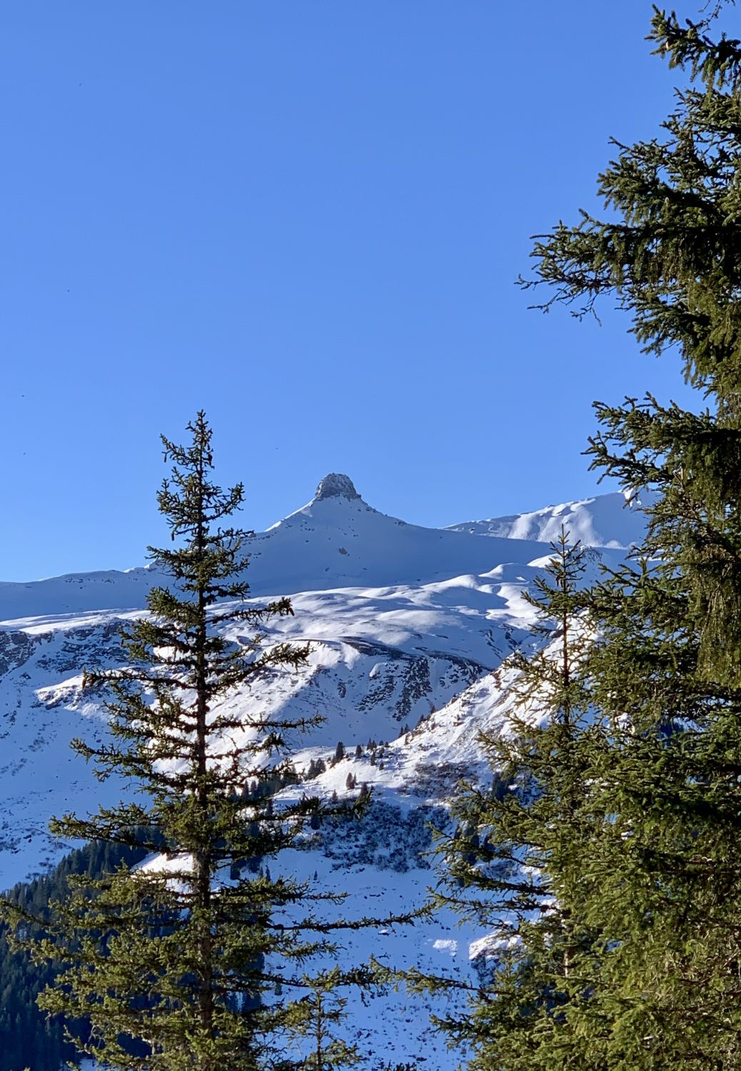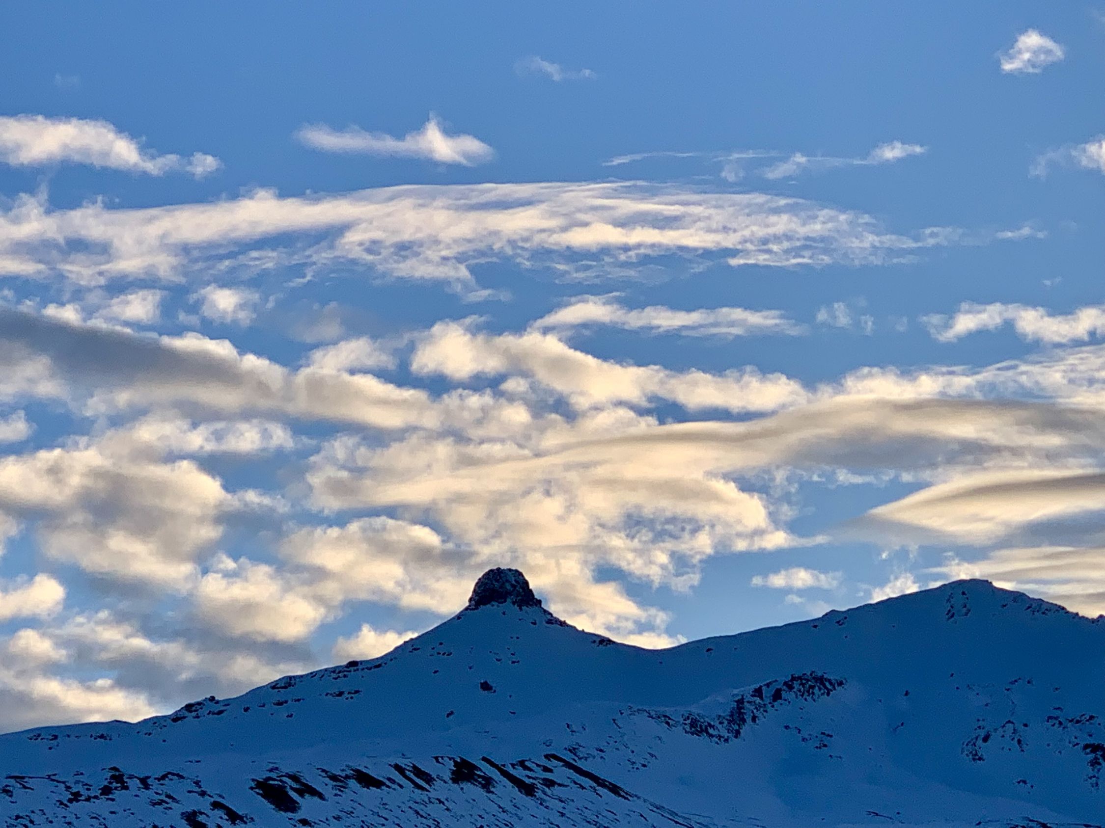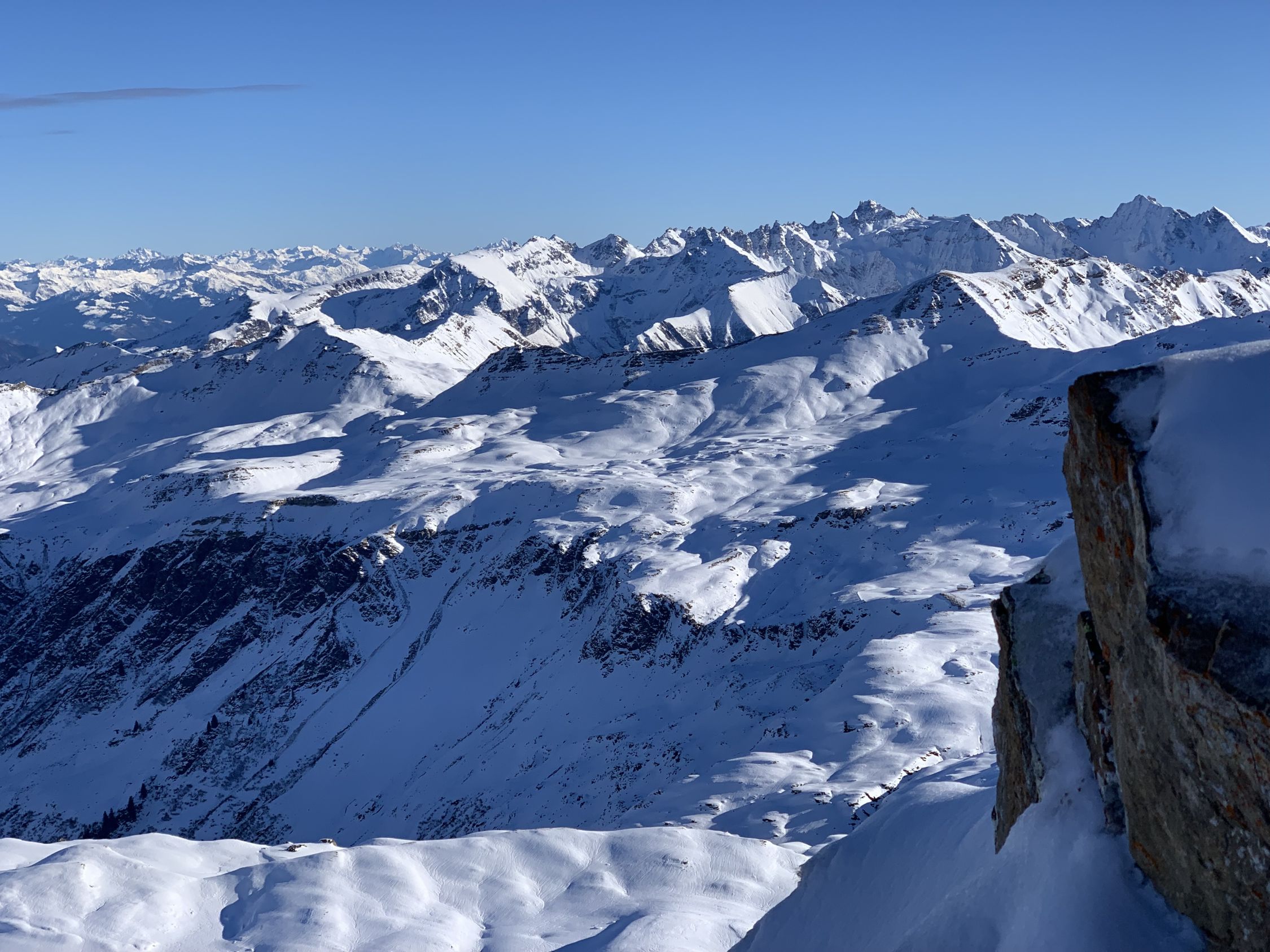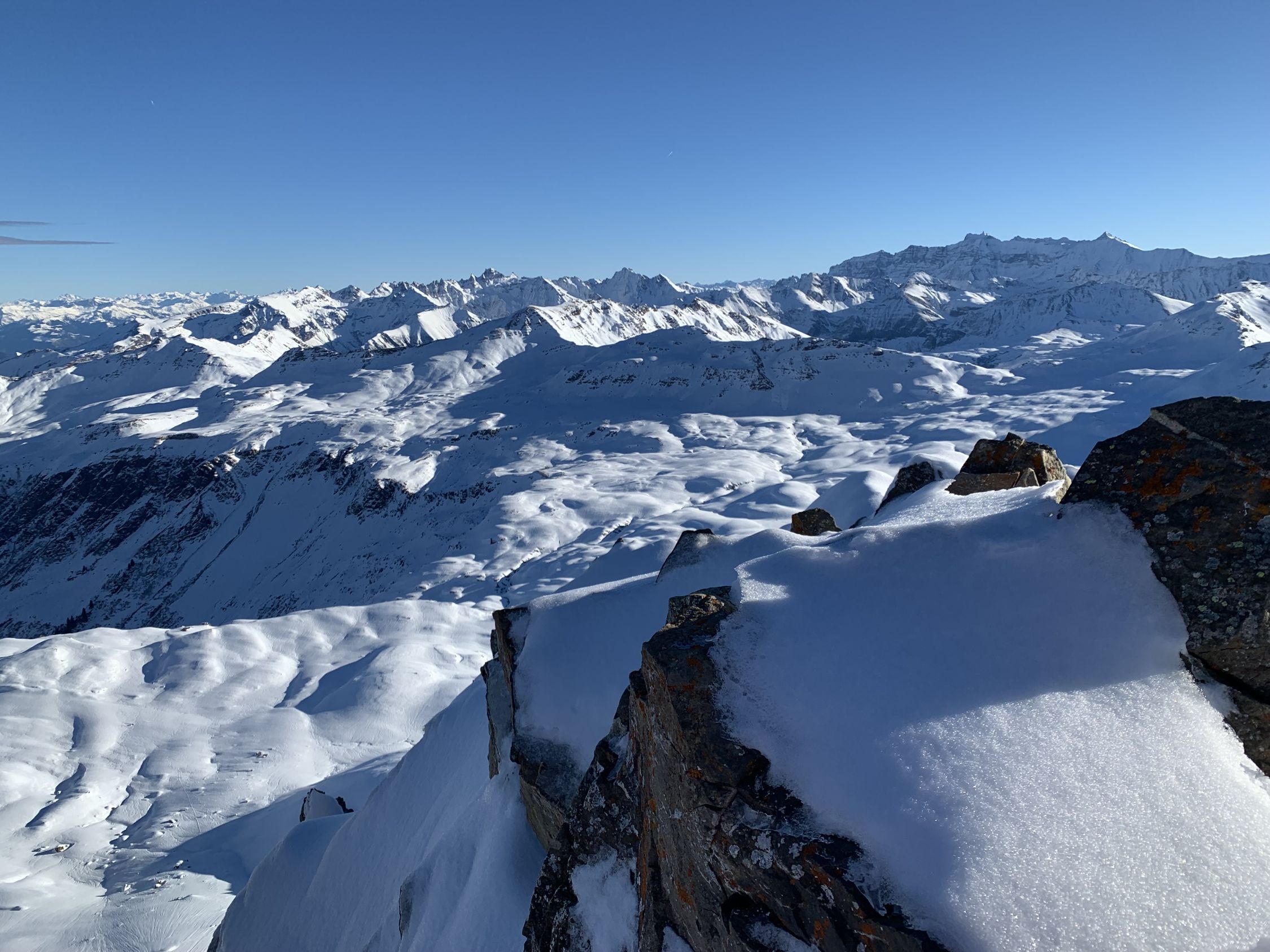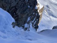 Das “gut” ist der freundliche Durchschnitt aus ausgezeichnetem Wetter, guten Verhältnissen im Aufstieg (Gipfelculoir gut eingeschneit, Ketten teilweise frei, Harscheisen am Schlusshang notwendig), gerade so machbarer Abfahrt und generell schlechter Schneelage ;-)