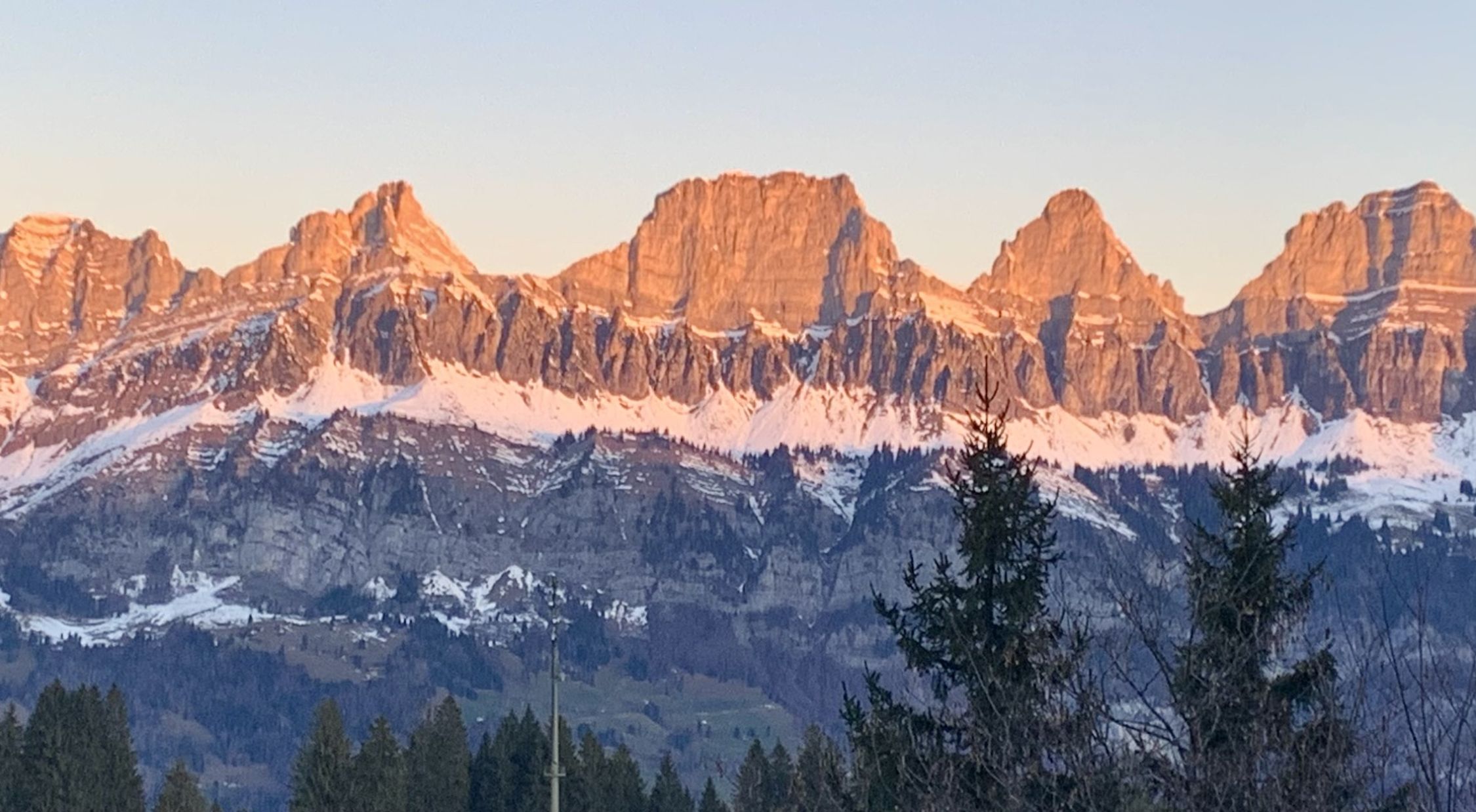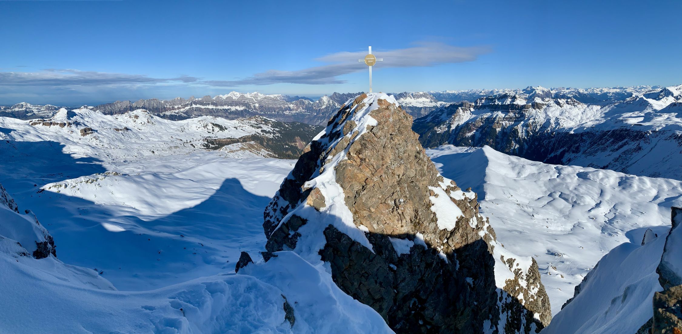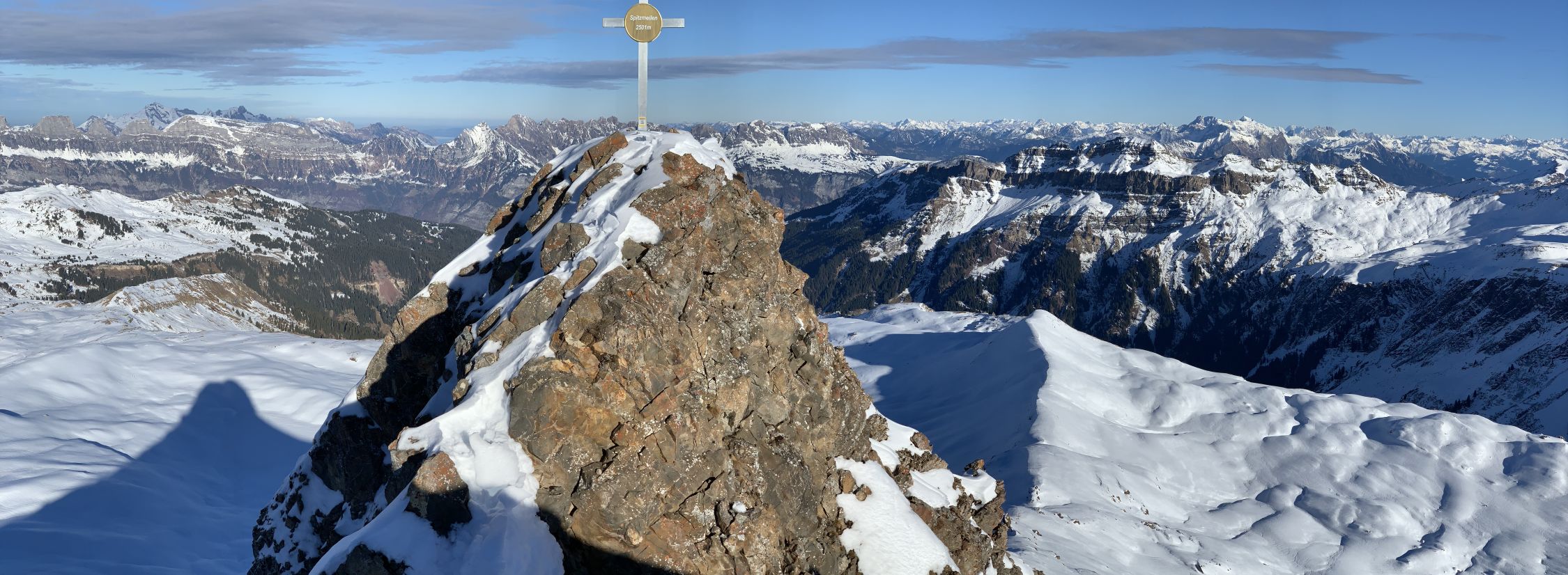 Zwar gab es kaum Steinkontakt, die Dezembersonne aber war zu schwach, den betonharten Deckel aufzusulzen - alles bockelhart vom Gipfel bis zur Alpe Fursch. Der Aufstieg von der Tannenbodenalp immerhin durchgehend auf Schnee.