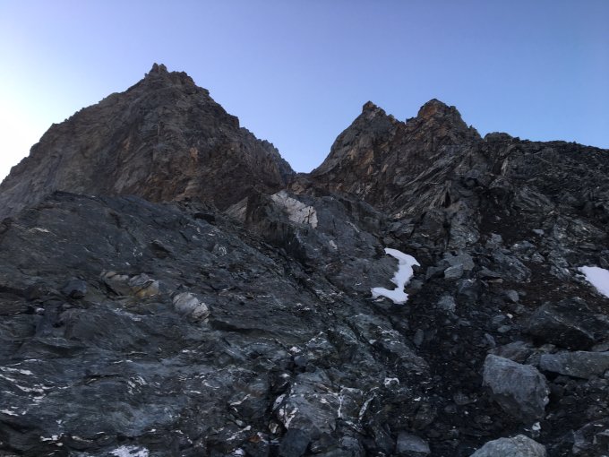 Der im Clubführer als "lohnendster Aufstieg auf den Mont Vélan" angepriesene Arête de Tseudet erwies sich als ausgesprochener Wolf im Schafspelz. Gemäss Hüttenwart im Schnitt einmal pro Jahr begangen, wir wissen nun, warum. Um die Dents du Proz entspannt überklettern zu können, sollte man mehr Reserven als 4a alpin mitbringen, für die beschriebene Umgehung auf unterbrochenen Bändern dafür eine ordentliche Portion Risikofreude ( kaum absicherbares, abschüssiges Gelände, sandig, loser Fels wohin die Hände greifen). In camptocamp fand ich eine Bewertung D-, sie kommt der Realität wohl näher als die ZS im Clubführer.