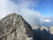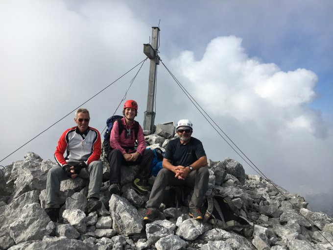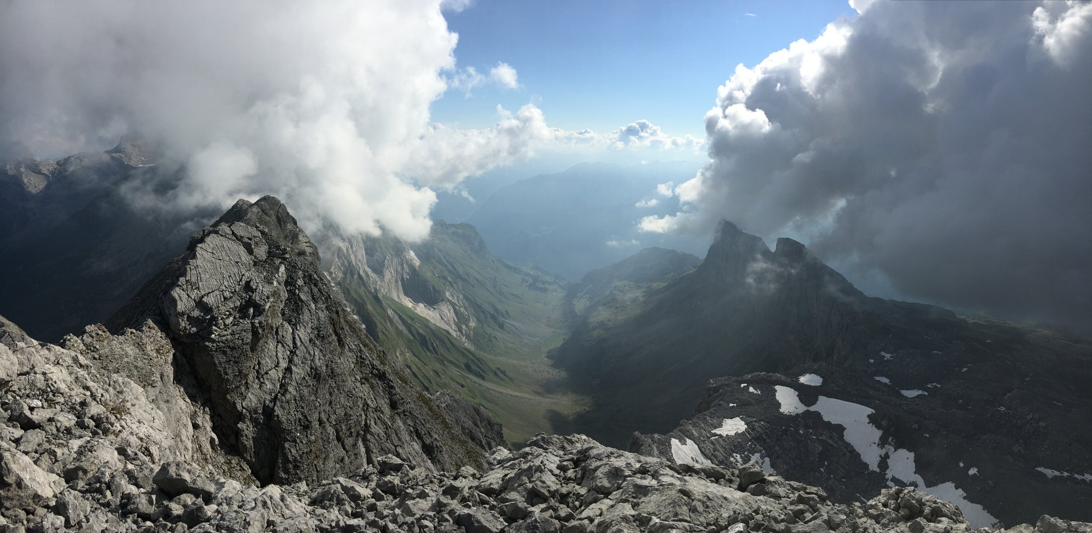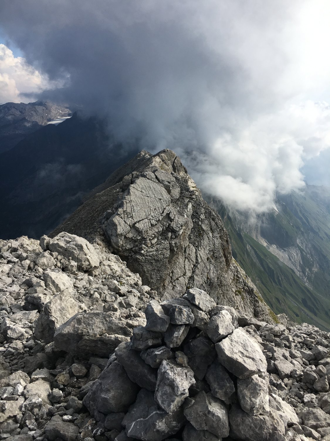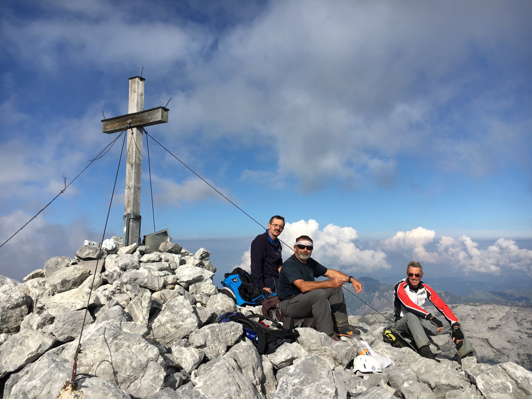 Am Ende des Gletschers deponierten wir unsere Stöcke und gingen über die "Plangg" (das Geröllfeld) bis ganz rechts nach oben, wo wir den Grat erreichten. Auf der Grenze zwischen den Kantonen Schwyz und Glarus kletterten wir am luftigen Gipfelgrat nach Südwesten und erreichten den Gipfel nach 3 1/2 Stunden.