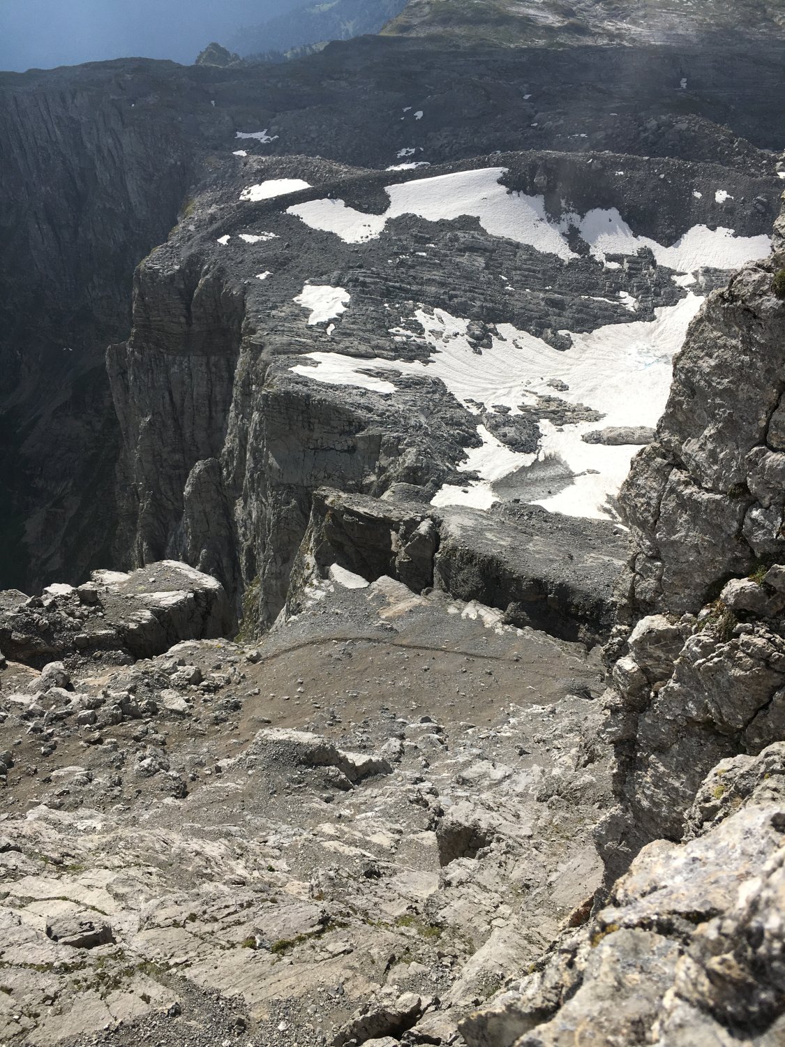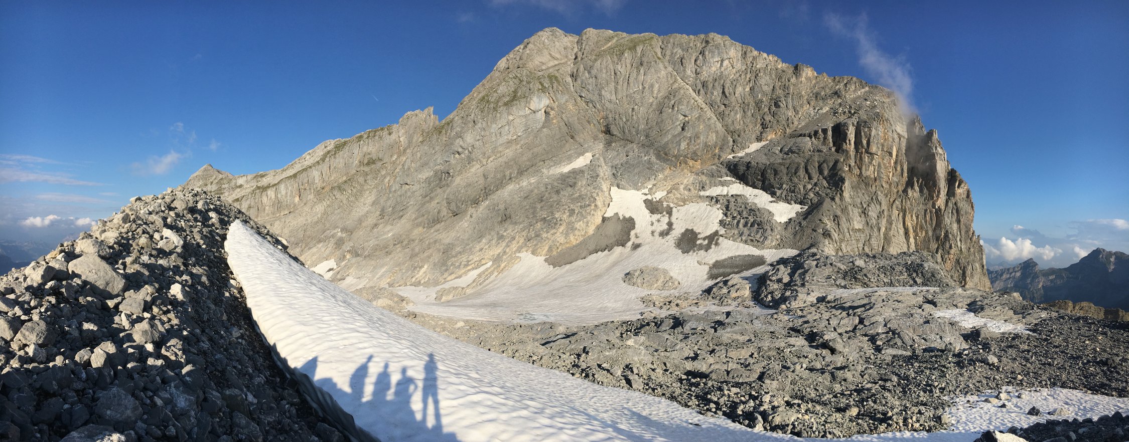 Für den Abstieg wählten wir die selbe Route und konnten dabei über die Schneefelder rutschen. Der Weg über die Kalkfelsen war nicht einfach und wir benötigten für den Abstieg nochmals 3 Stunden. Als wir kurz vor dem Bützi wieder auf den rot weiss markierten Wanderweg und auf zahlreiche Wanderer, die zur Glattalp unterwegs waren, trafen, freuten wir uns richtig.