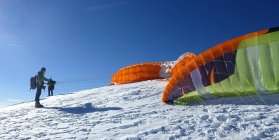 Der Gipfeldom des Mont Blanc ist abgesehen von der Höhe (Windstärke - wir hatten 15-20km/h NO/O) & dünne Luft) ein idealer Gleitschirmstartplatz mit 300° grosszügigen Startmöglichkeiten (alles gut ausser West / Nordwest) - man muss sein Fluggerät hingegen (oder "zum Glück!) selber hochbuckeln... :-)