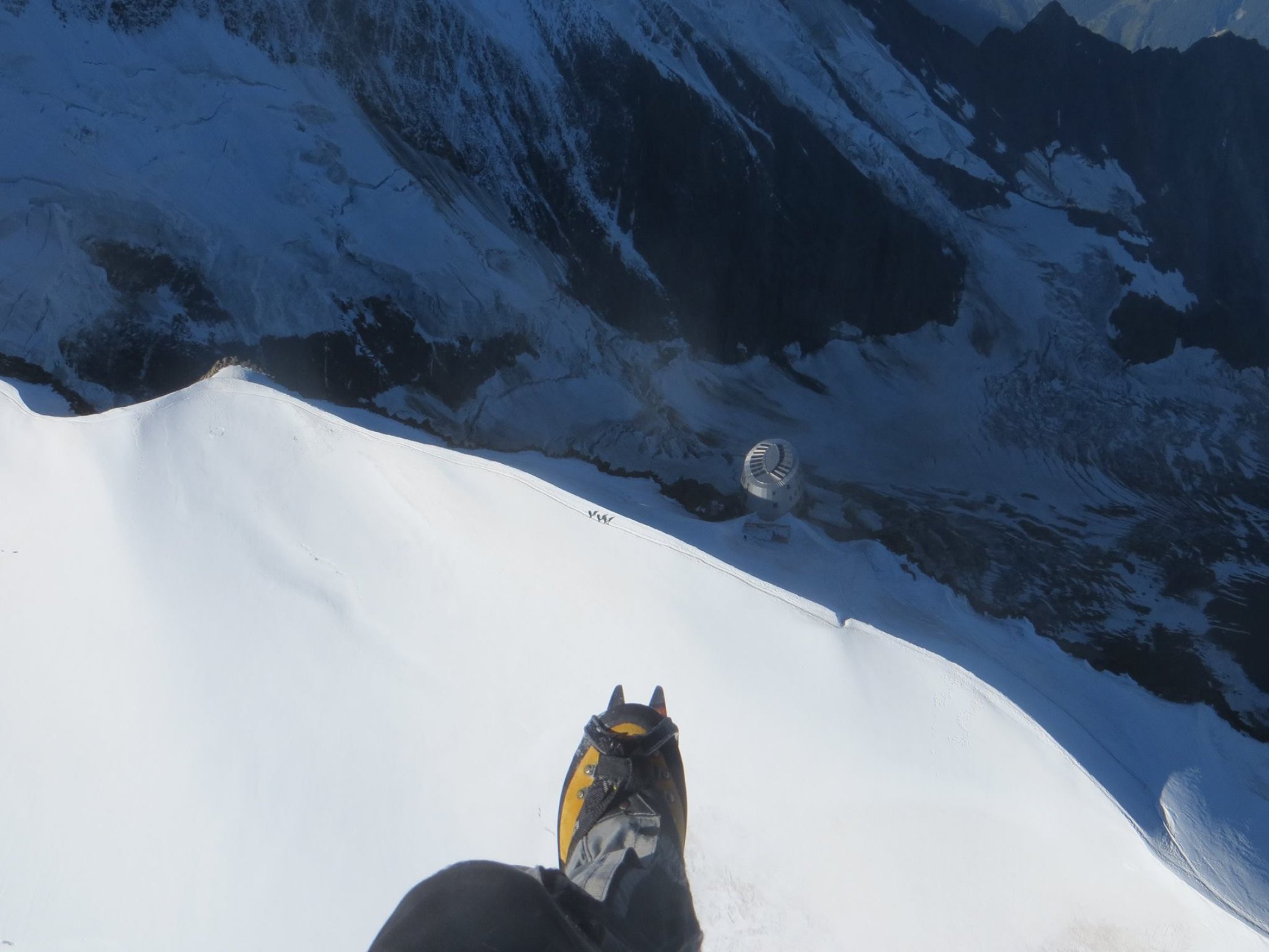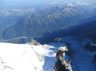 Trocken bis Goûter, kein nennenswerter Steinschlag im Couloir der Aiguille du Goûter. Firn perfekt bis Gipfel hoch (Spur ideal bequem). Oberhalb ca. 4400m ein wenig Neuschnee (5cm) auf der nördlichen Seite ("Gewitterresten"?). Ein Abbruch hinter einer Spalte ist zurzeit sehr gut mit Stufen und einem Fixseil eingerichtet (ca auf 4600m).