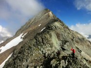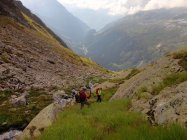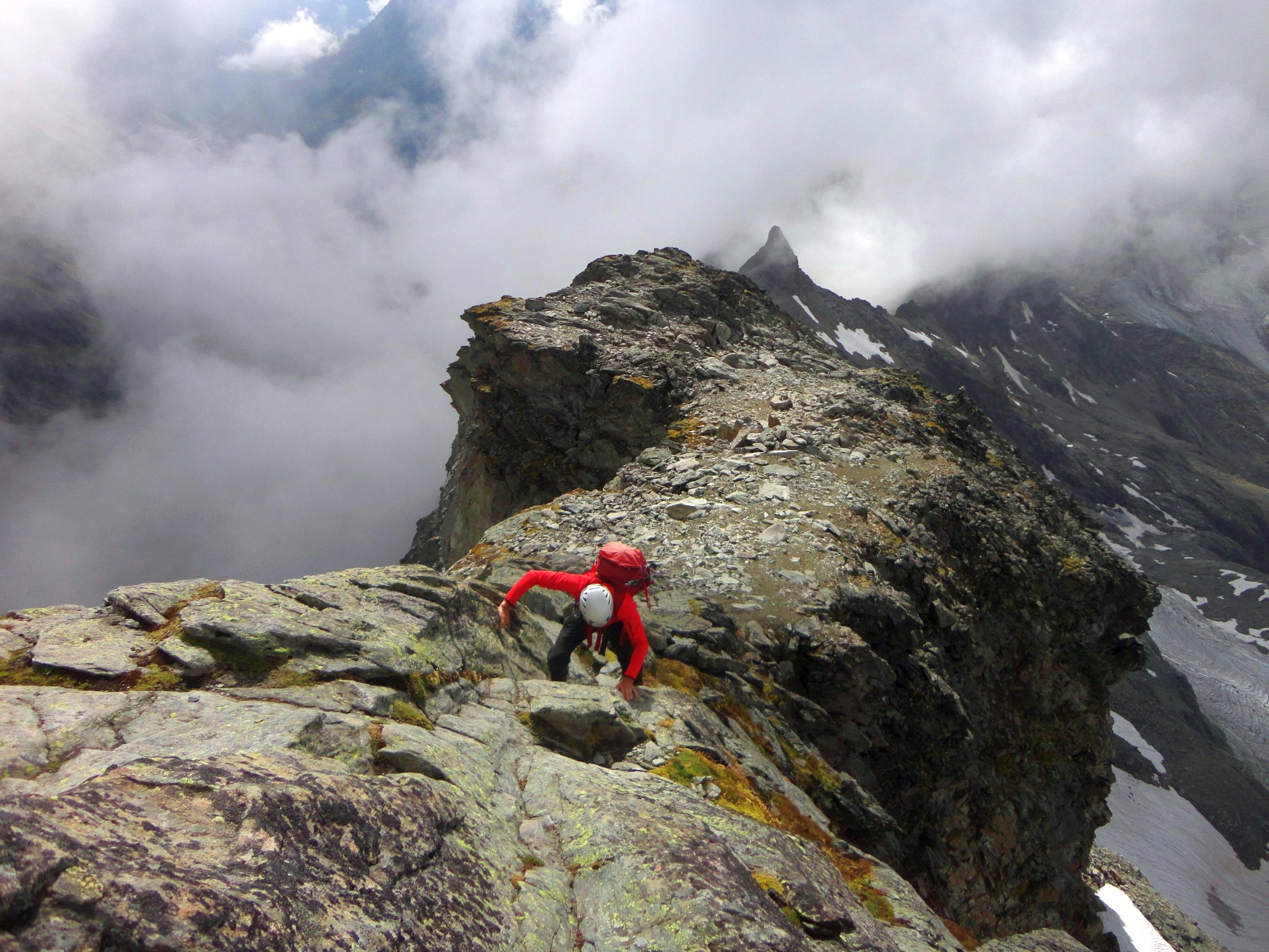 Nach nächtlichem Regen Grasrücken zum Tschingelseeli noch nass und etwas rutschig, aber gute Wegspur ab Brücke im Brunnital. Felsen am Südgrat trocken, erfordern im unteren Teil jedoch etwas Vorsicht, da mit feuchtem Moos durchsetzt. Der etwas ausgesetzte Einstieg ist mit einem Fixseil versehen, dann schöne Kletterei in plattigem, weiter oben eher schrofigem Gelände (bis II).