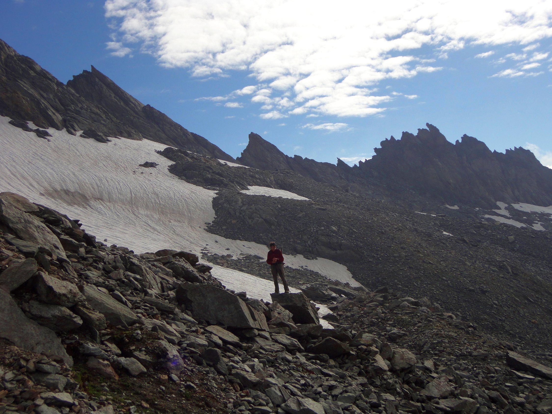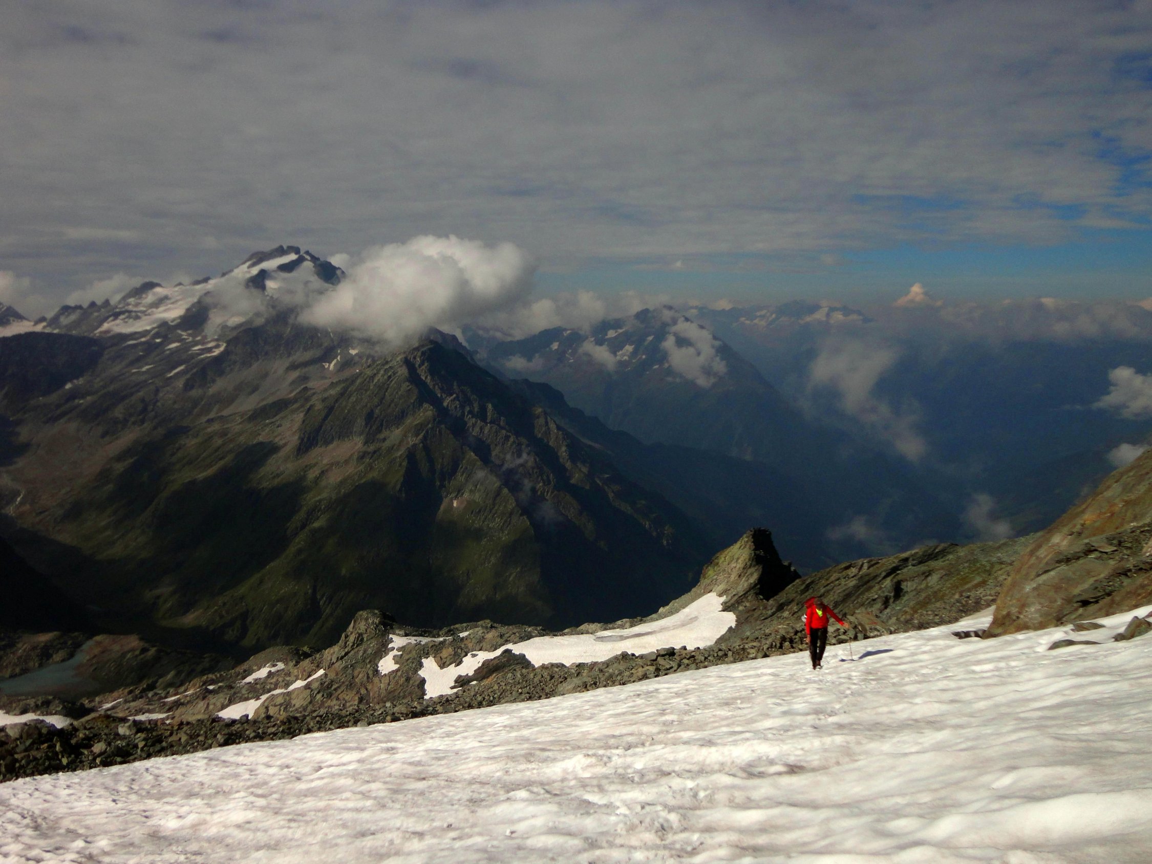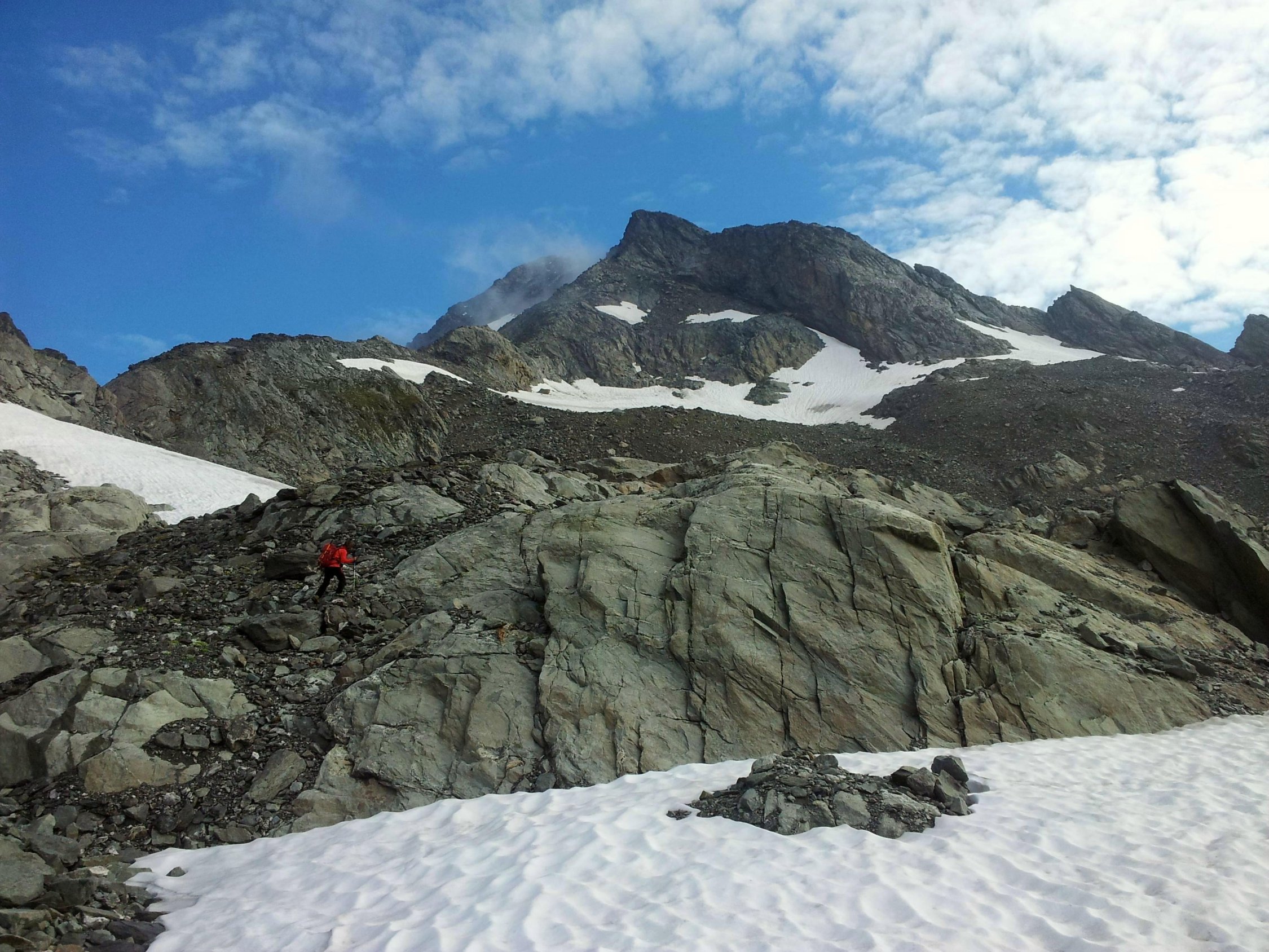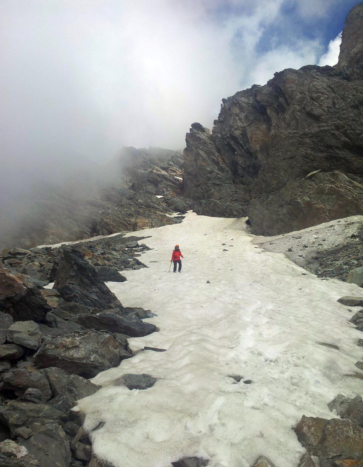 Der Schnee am Tschingelfirn war weich und ohne Steigeisen begehbar und kann in den steileren Bereichen im Geröll bzw. Fels umgangen werden. Pickel jedoch nicht verkehrt, bei härteren Verhältnissen auch Steigeisen. Insgesamt sehr schöne, abwechslungsreiche Route.