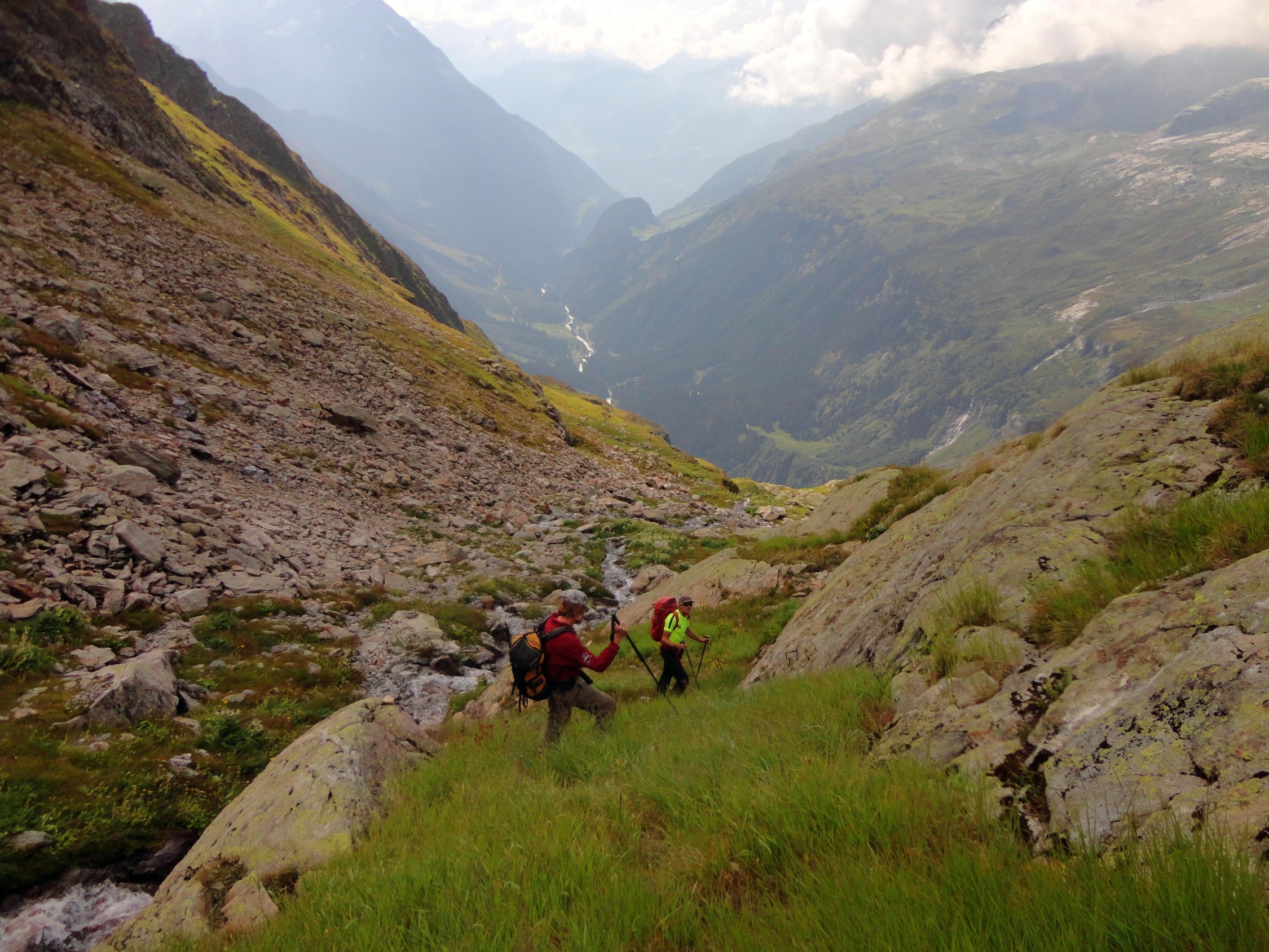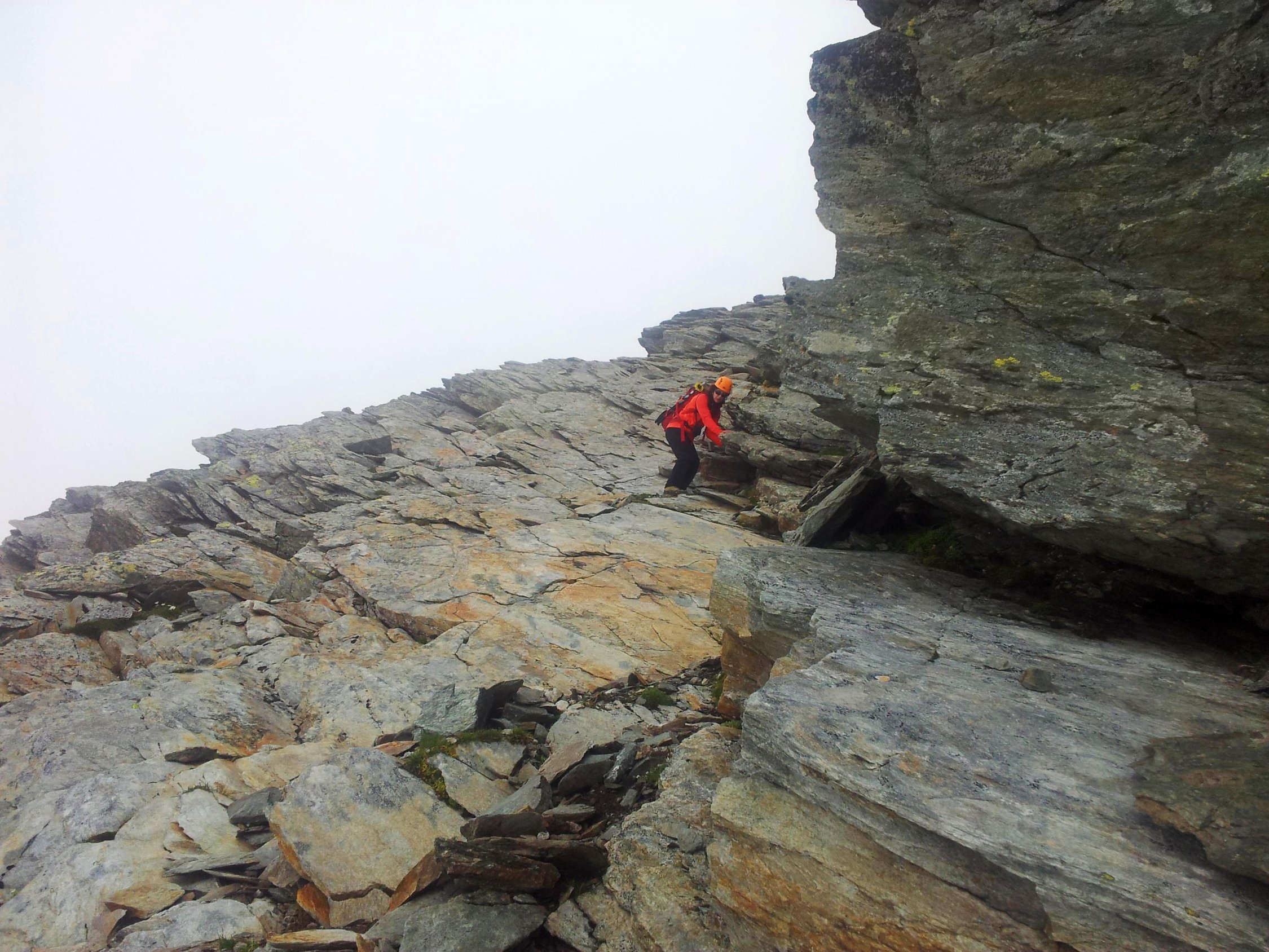 Der Abstieg durch die Westflanke ist schuttig und steinschlaggefährdet (Helm), führt stellenweise über glatte, nach unten geschichtete Platten und sollte unbedingt trocken sein. Die Wegfindung gestaltet sich nicht ganz einfach, da nur sporadisch Trittspuren und Steinmänner vorhanden sind und die angebrachten Markierungen nur von unten erkennbar sind.