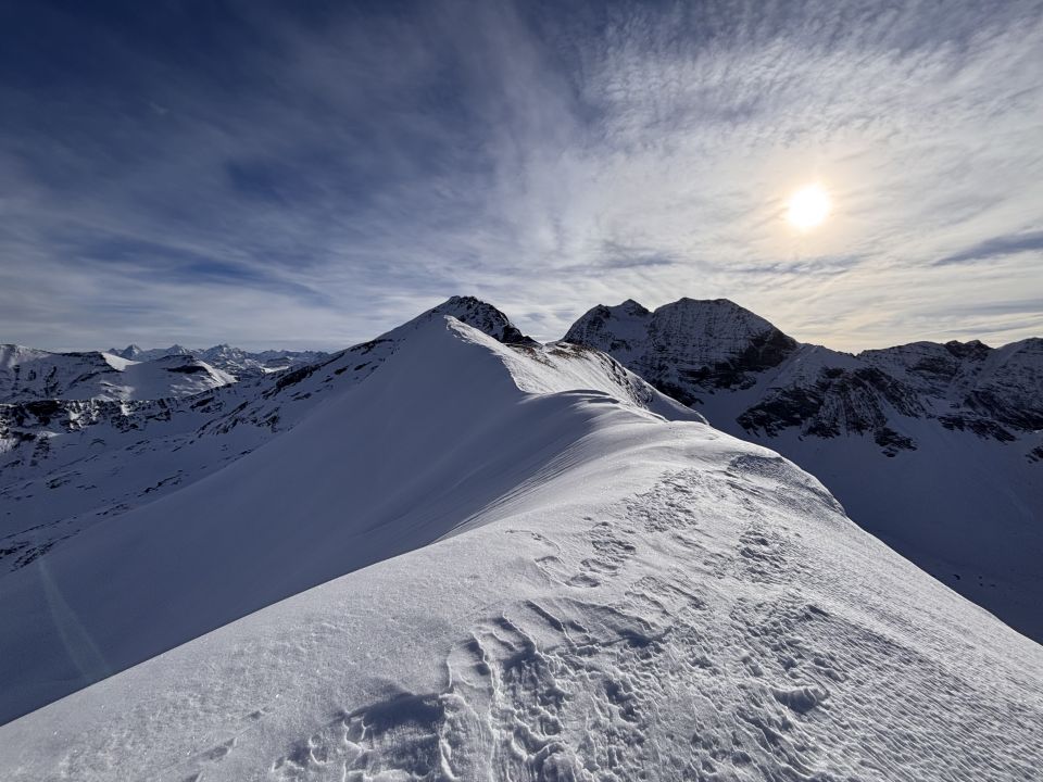 Auf dem Gurbsgrat heute sonnig und fast windstill. In der Abfahrt um 12 Uhr war der Schnee immer noch sehr hart. Stellenweise haben wir Bruchharst und kleine homöopatische Pulverschneereste angetroffen. Heute waren wir - wohl aufgrund der gesperrten Strasse - die einzigen im Chirel-Gebiet.
